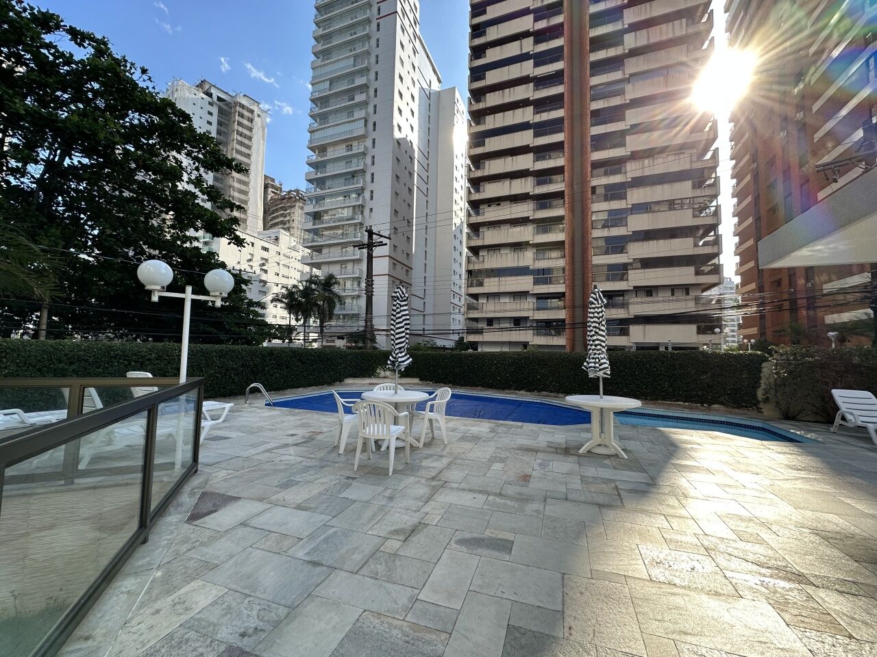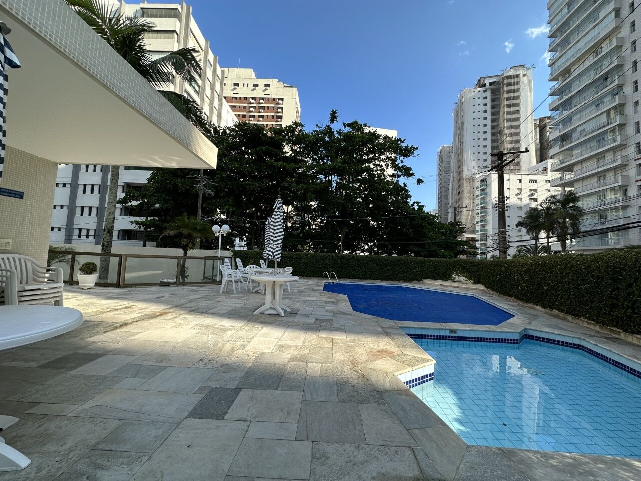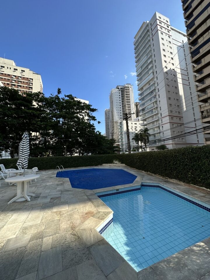 Lazer do prédio com piscina adulto e infantil, sauna, churrasqueira, sala de ginástica, salão de festas e jogos, e serviço de praia.
