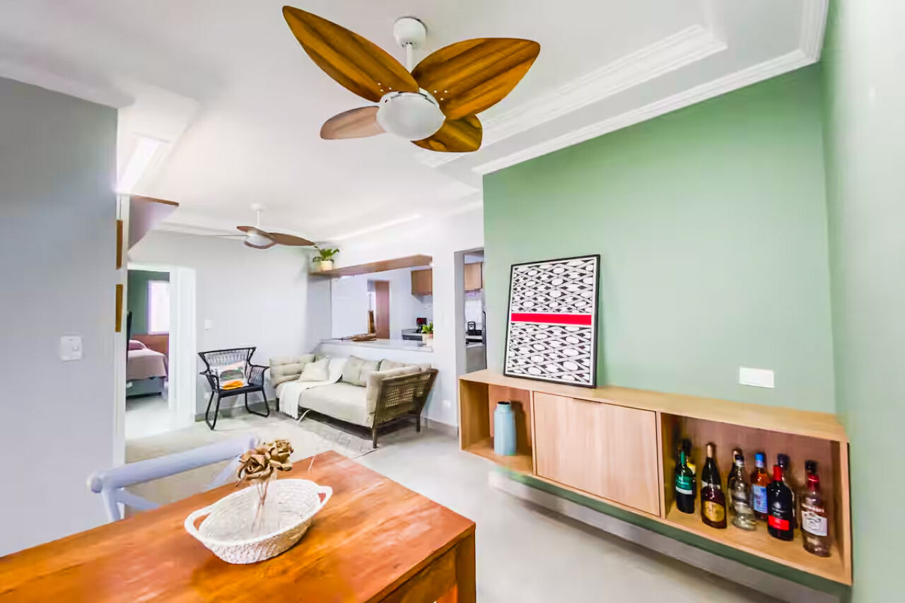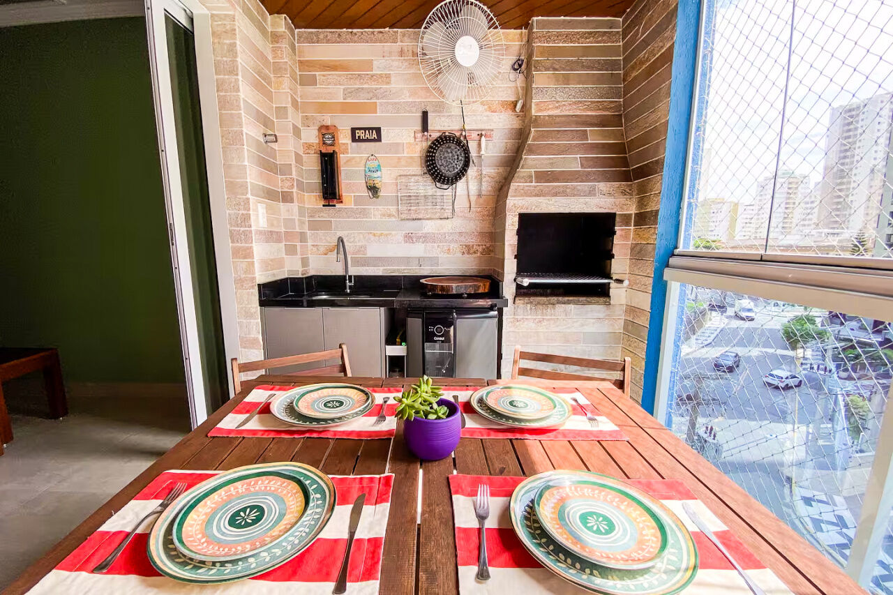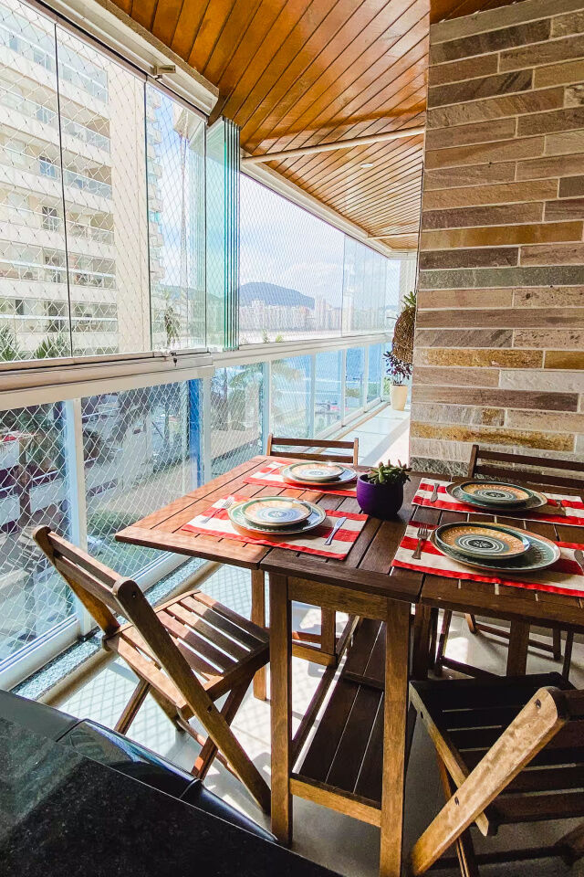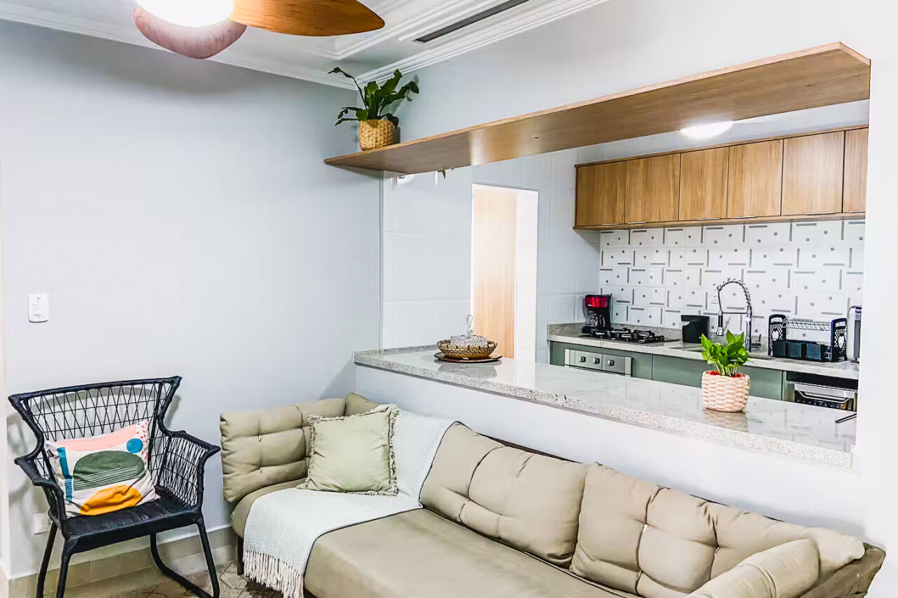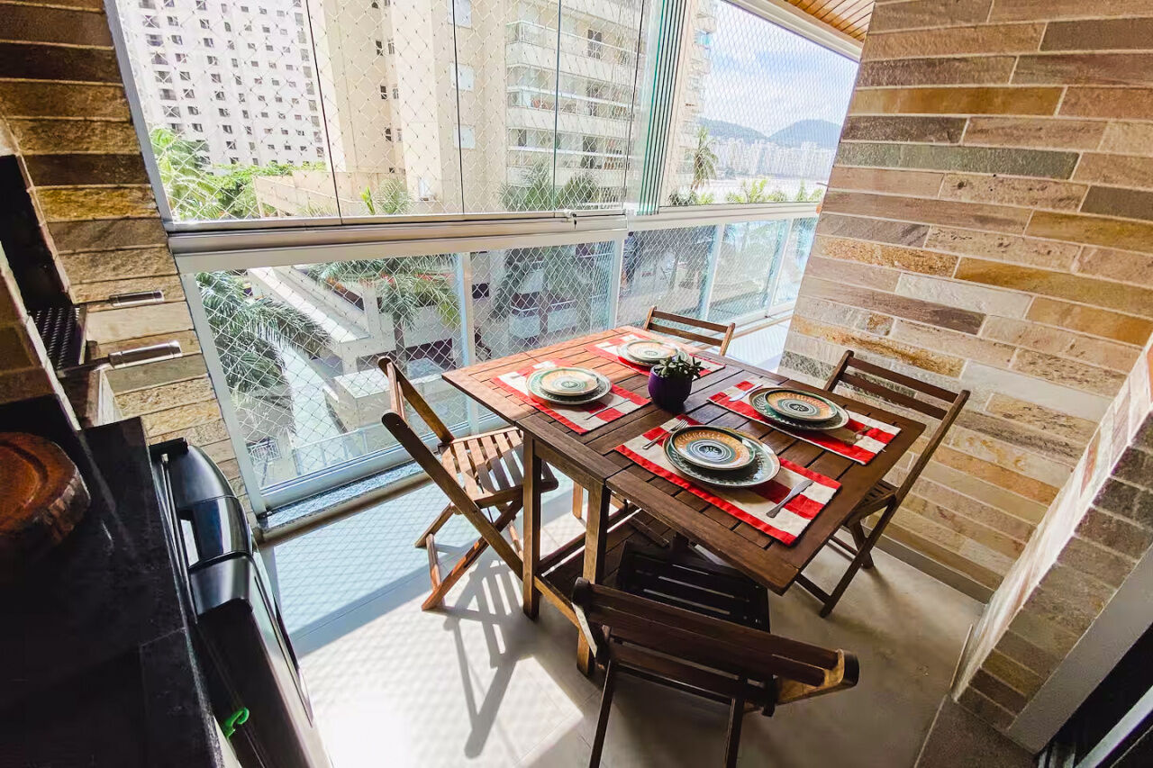 Apartamento à venda na quadra da praia das Astúrias em Guarujá, mobiliado e decorado com projeto assinado por arquiteto, com 02 dormitórios sendo 01 suíte, sala para 02 ambientes integrada com a varanda gourmet com churrasqueira, banheiro social, cozinha americana planejada e área de serviços.