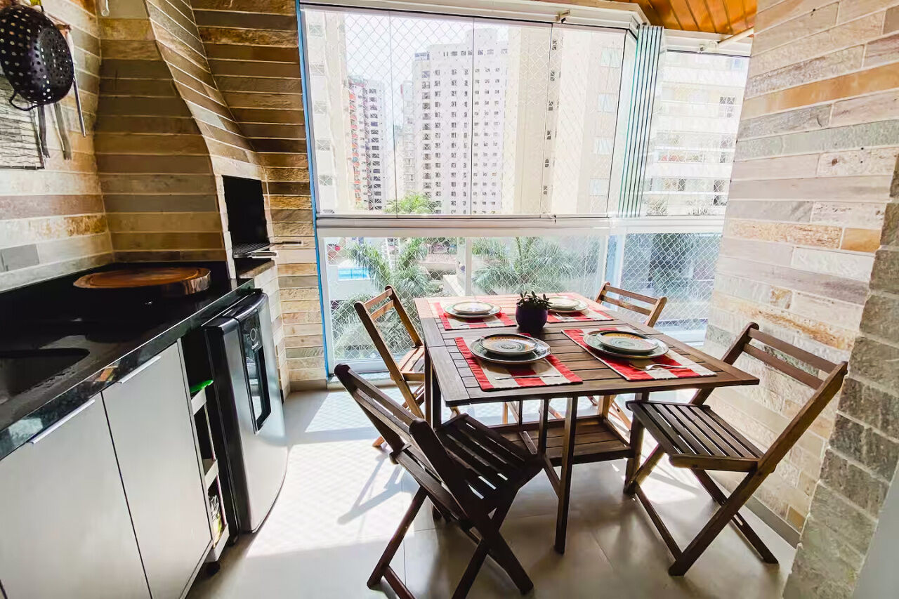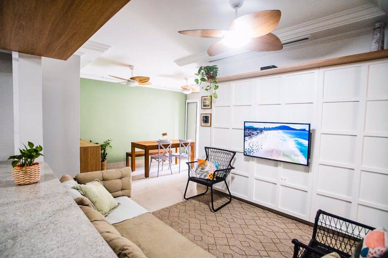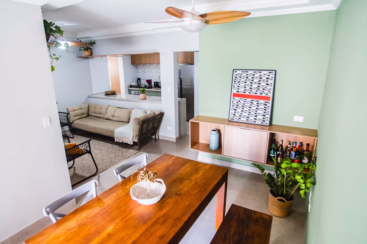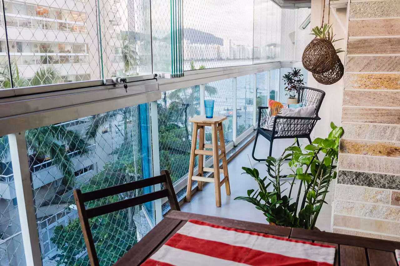 Apartamento à venda na quadra da praia das Astúrias em Guarujá, mobiliado e decorado com projeto assinado por arquiteto, com 02 dormitórios sendo 01 suíte, sala para 02 ambientes integrada com a varanda gourmet com churrasqueira, banheiro social, cozinha americana planejada e área de serviços.