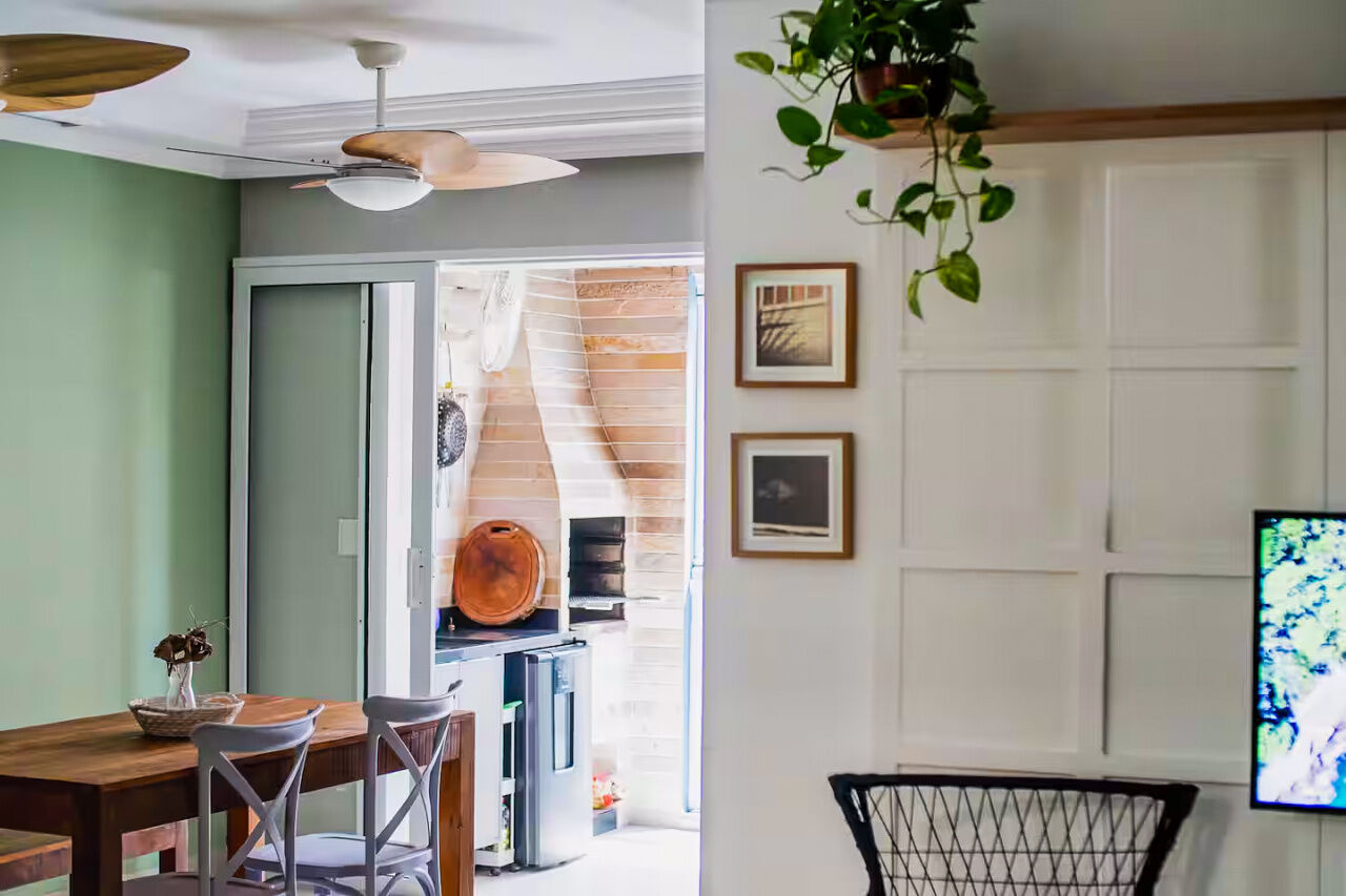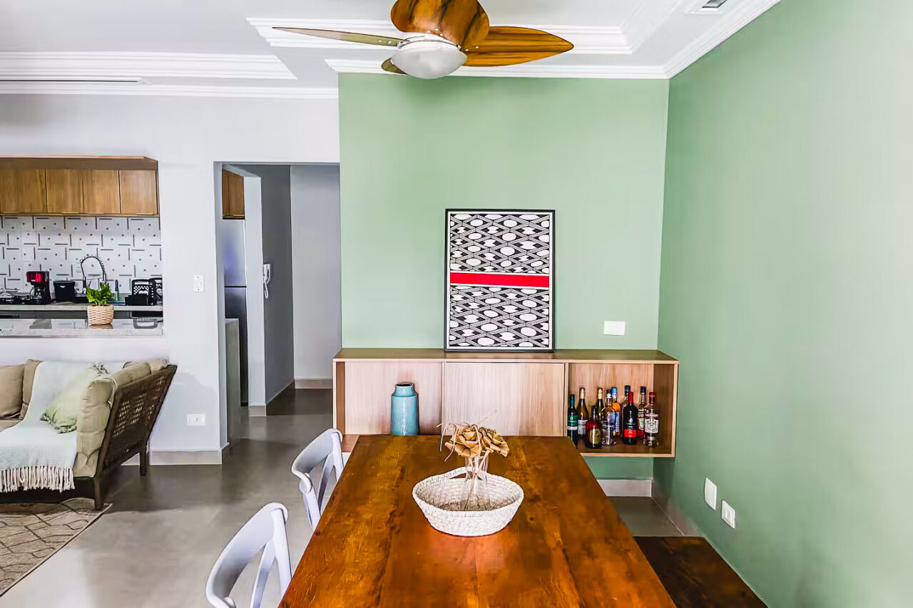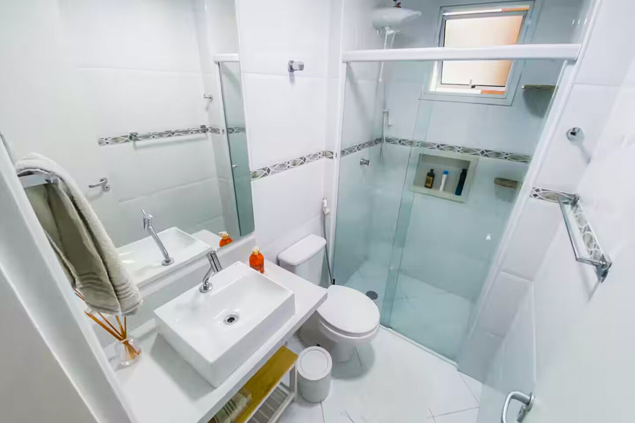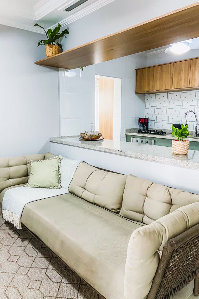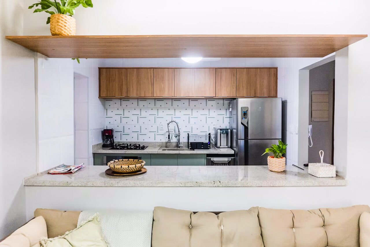 Apartamento à venda na quadra da praia das Astúrias em Guarujá, mobiliado e decorado com projeto assinado por arquiteto, com 02 dormitórios sendo 01 suíte, sala para 02 ambientes integrada com a varanda gourmet com churrasqueira, banheiro social, cozinha americana planejada e área de serviços.