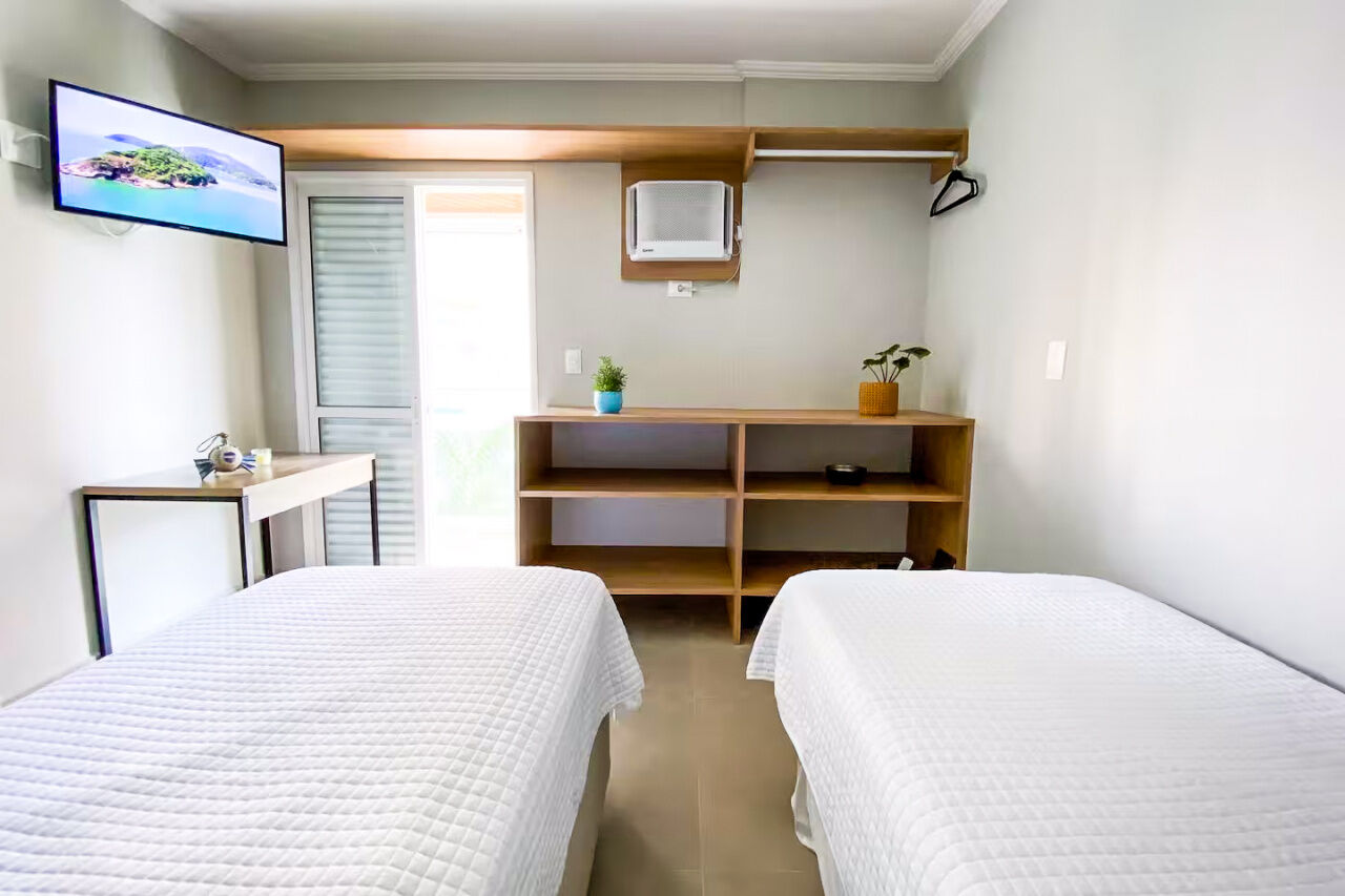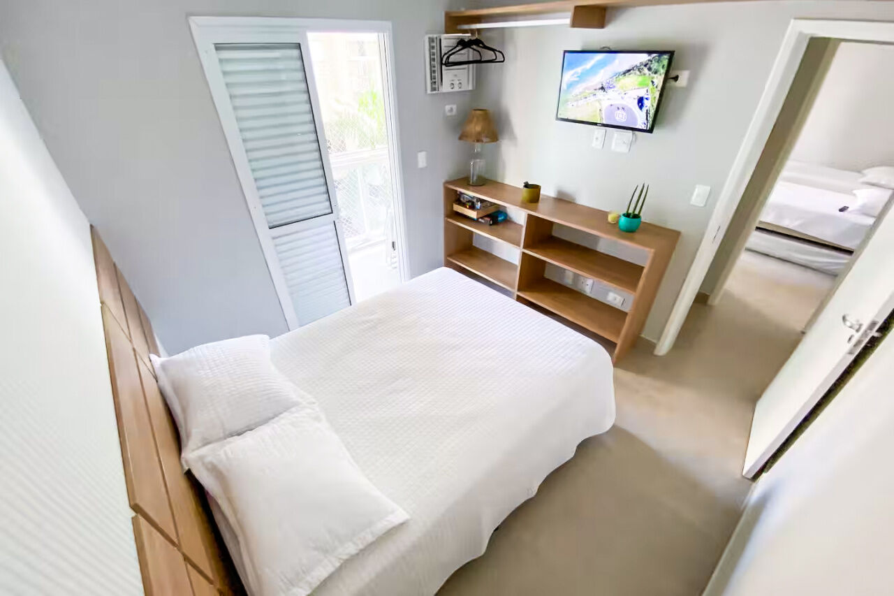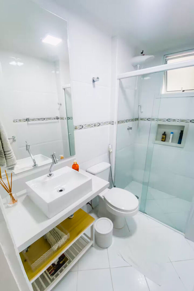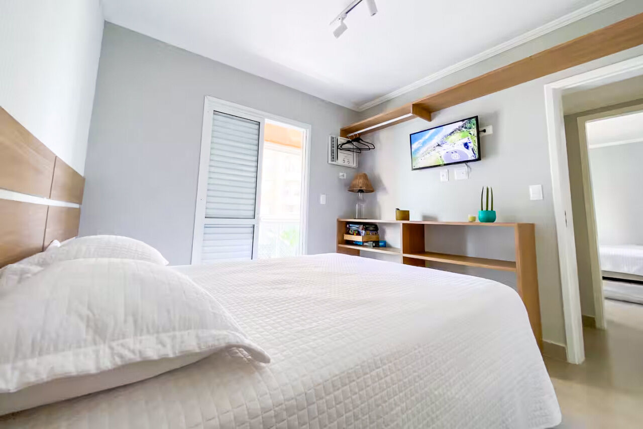 Lazer do prédio conta com piscina, churrasqueira, salão de jogos e playground, portaria 24 horas com monitoramento e serviço de praia.