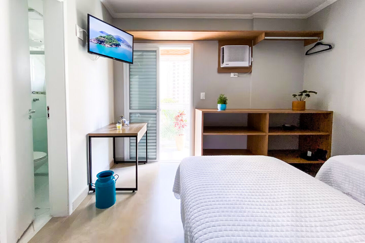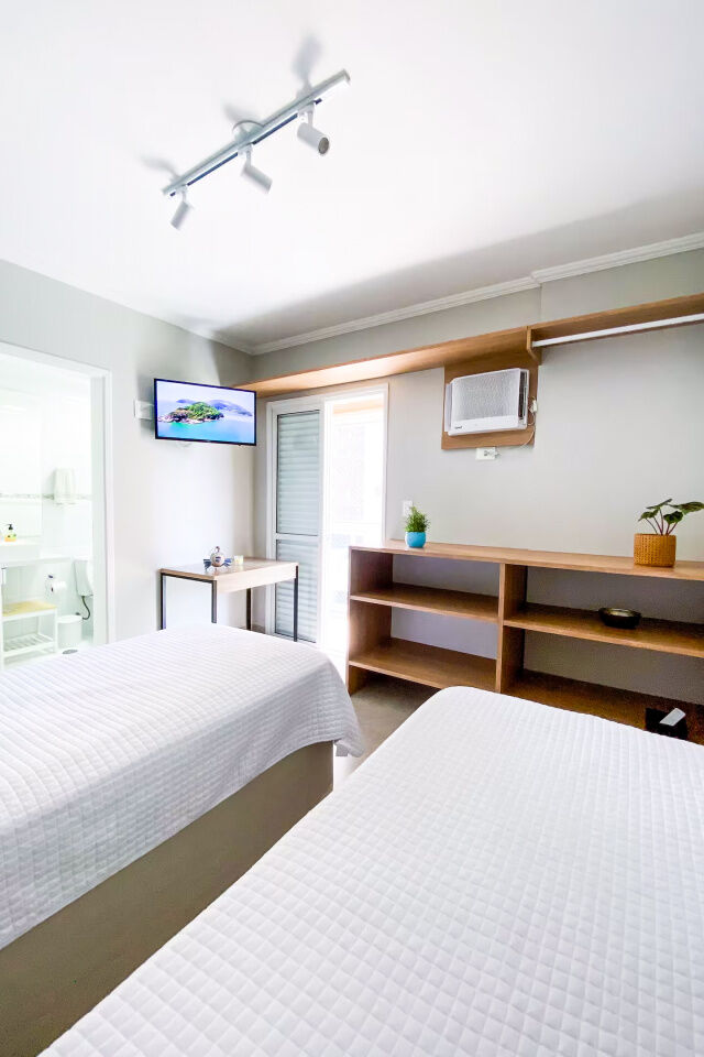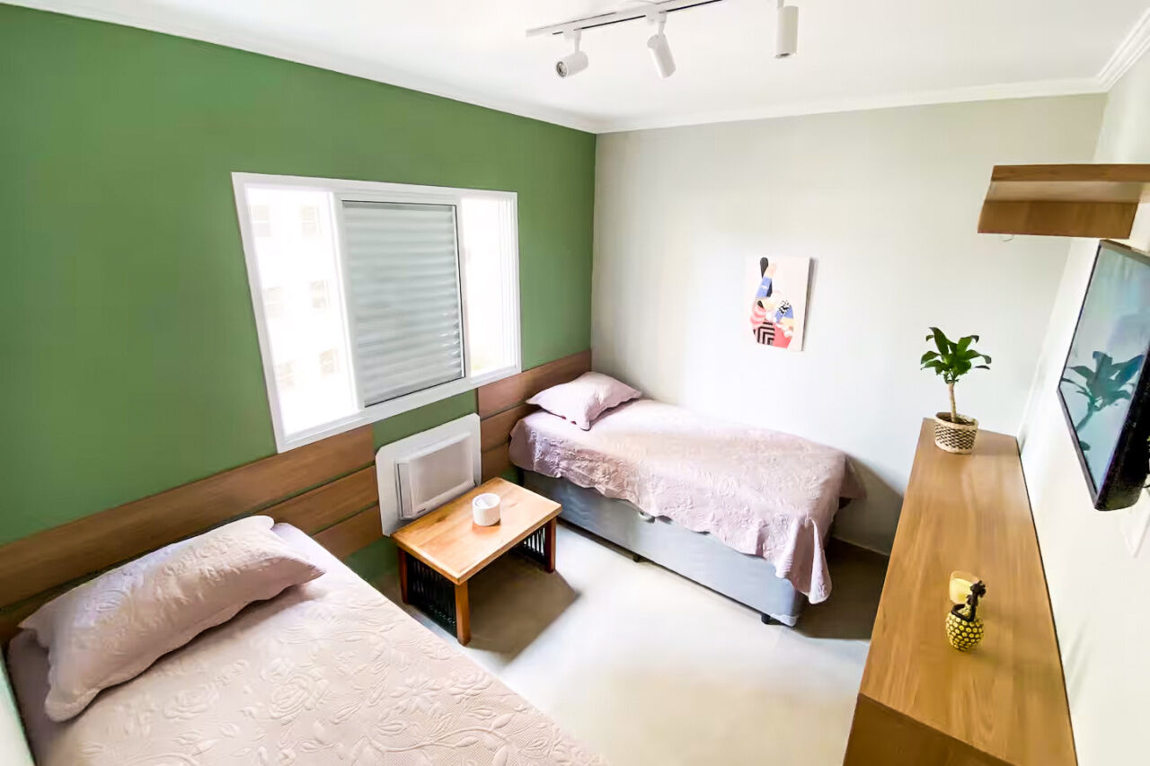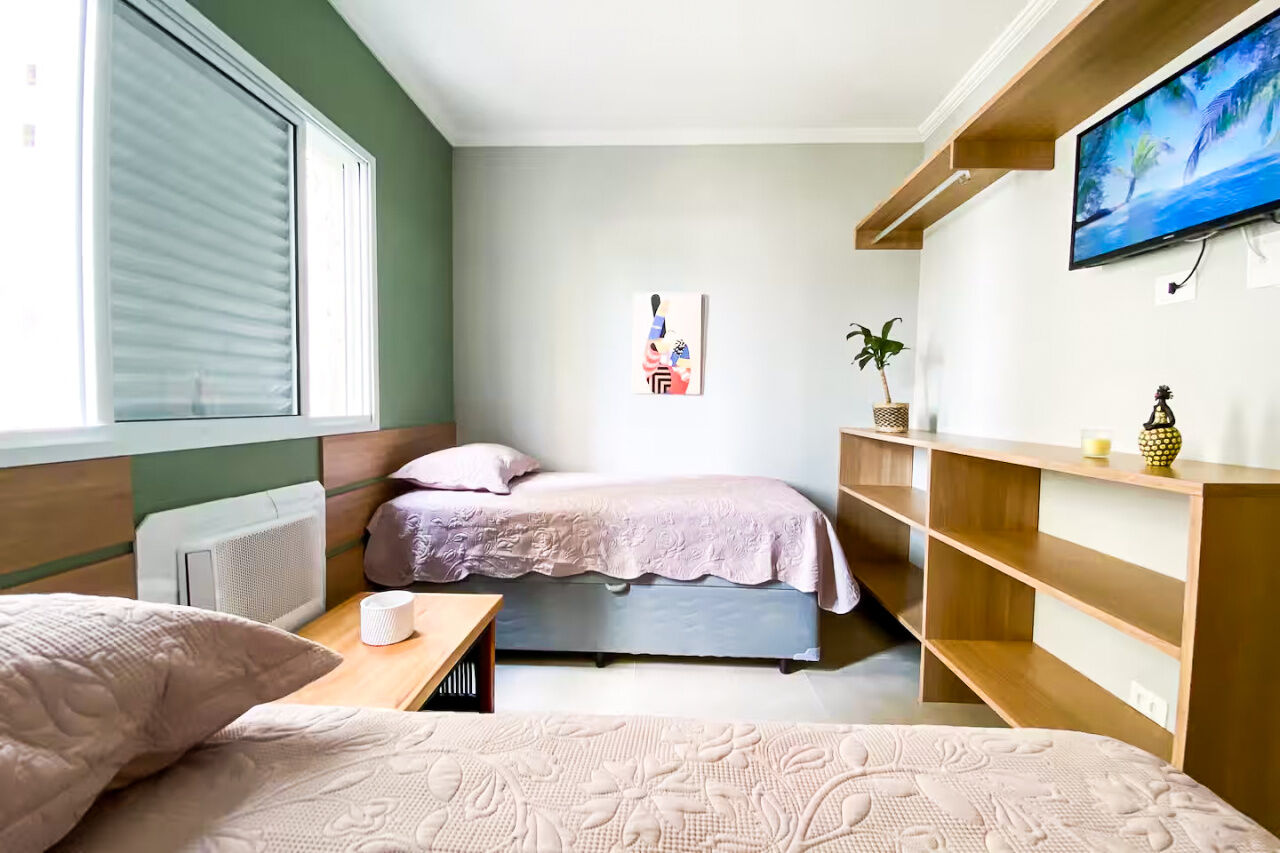 Lazer do prédio conta com piscina, churrasqueira, salão de jogos e playground, portaria 24 horas com monitoramento e serviço de praia.
