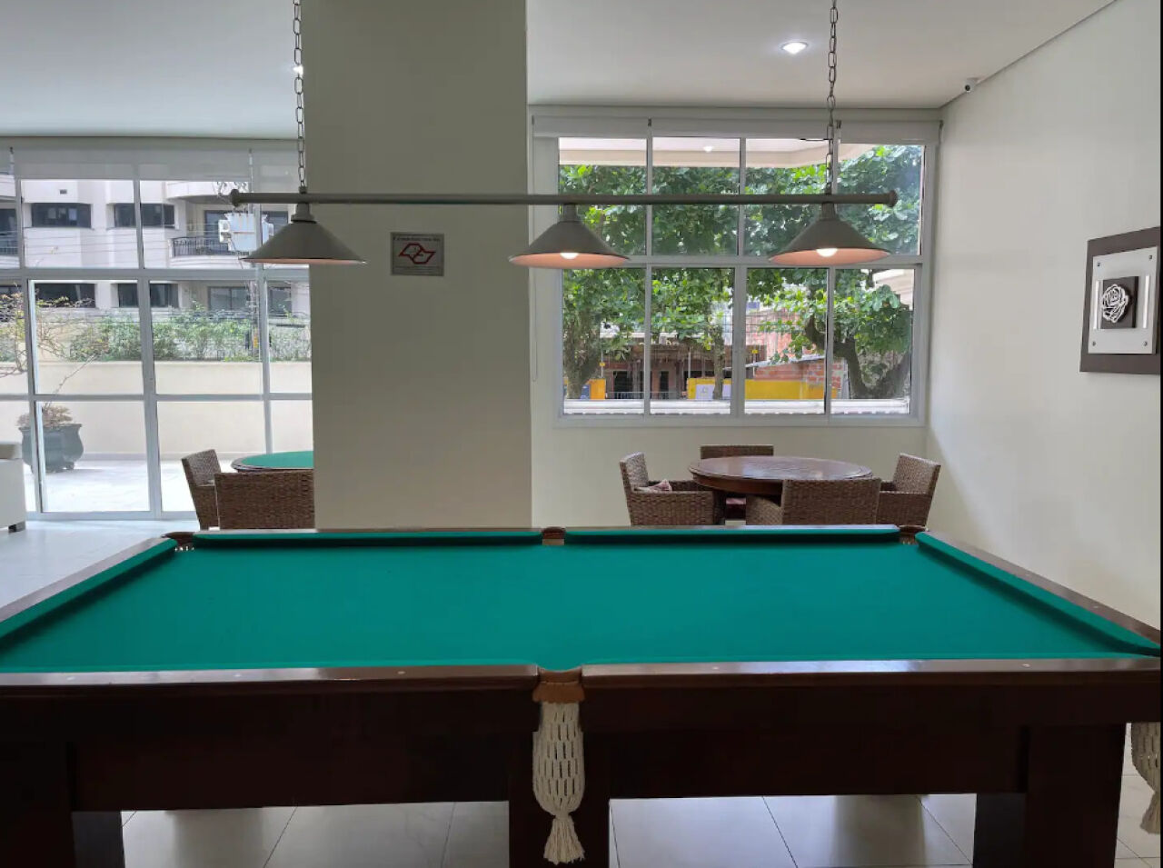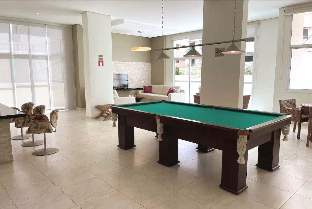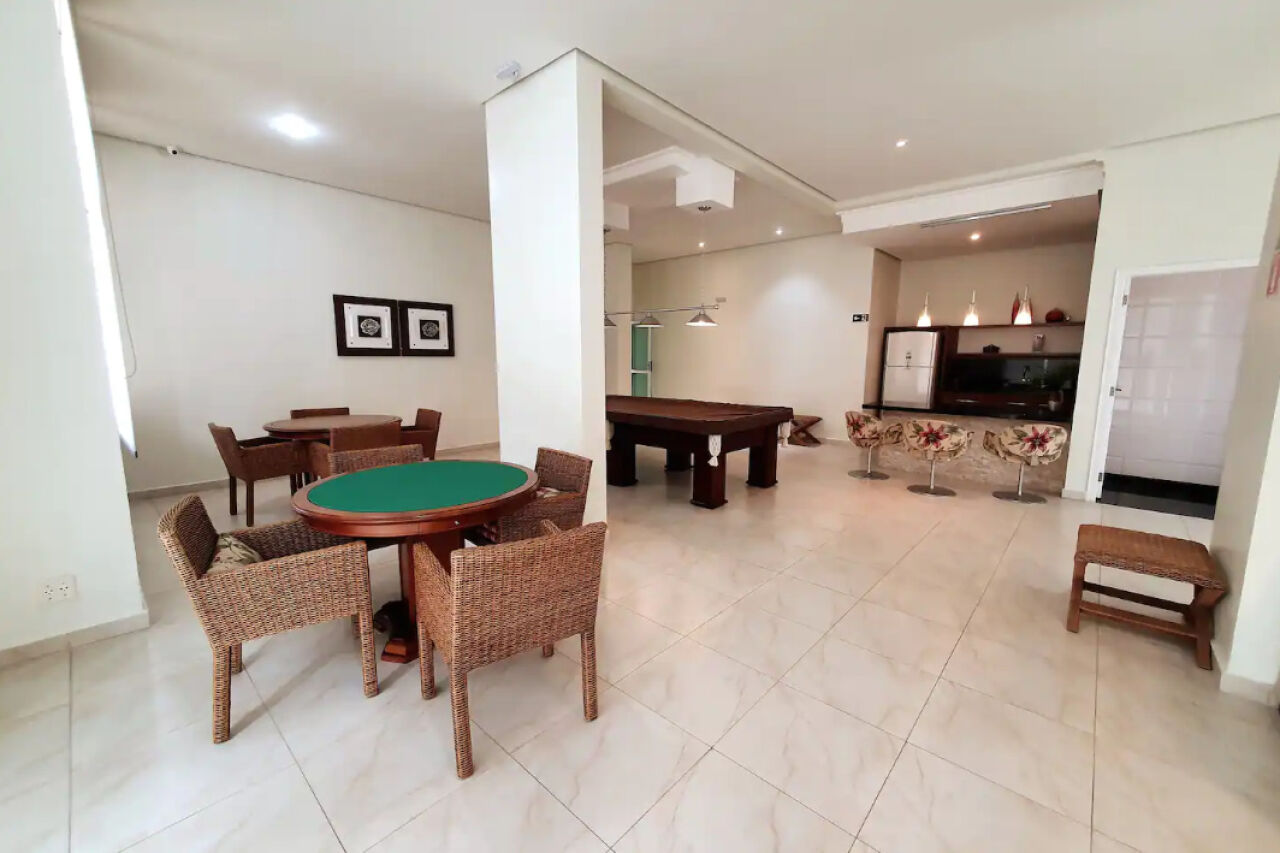 Lazer do prédio com piscina, deck molhado e cascata, saunas seca e úmida, quadra poliesportiva, brinquedoteca, salão de jogos e vídeo, salão de festas com churrasqueira e forno de pizza.
