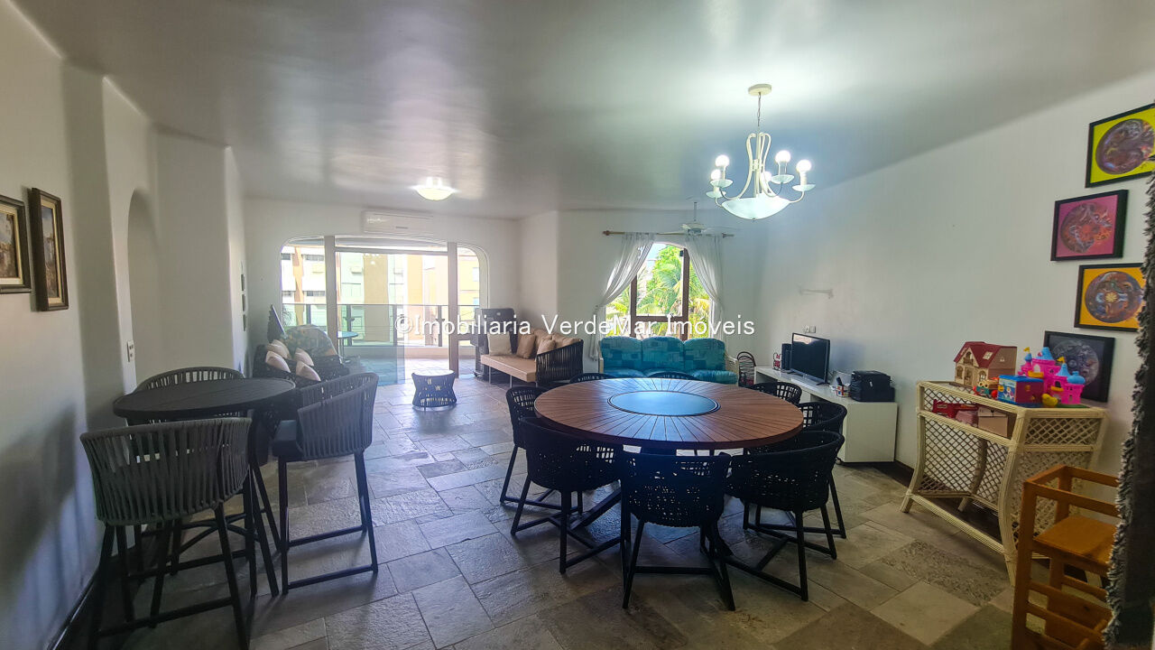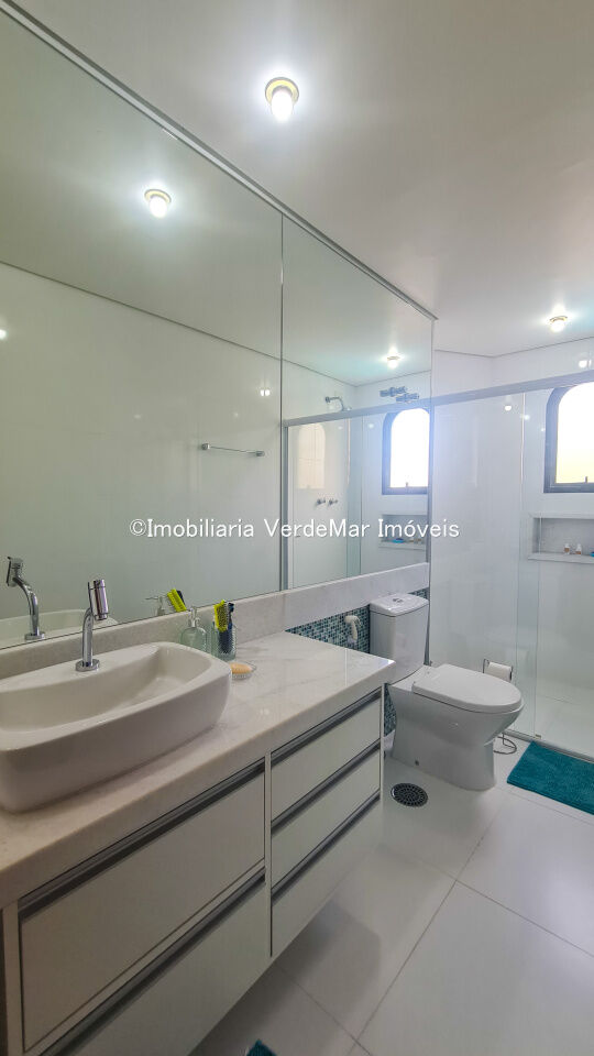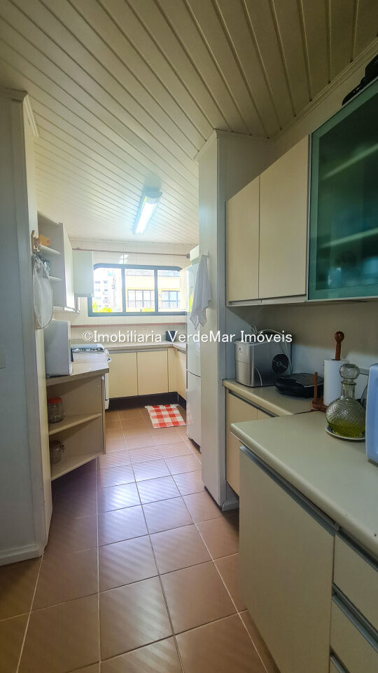 Apartamento a venda na praia da Enseada no Guarujá, com 3 suítes, sala para 2 ambientes com varanda, lavabo, cozinha com armários, e área de serviços.