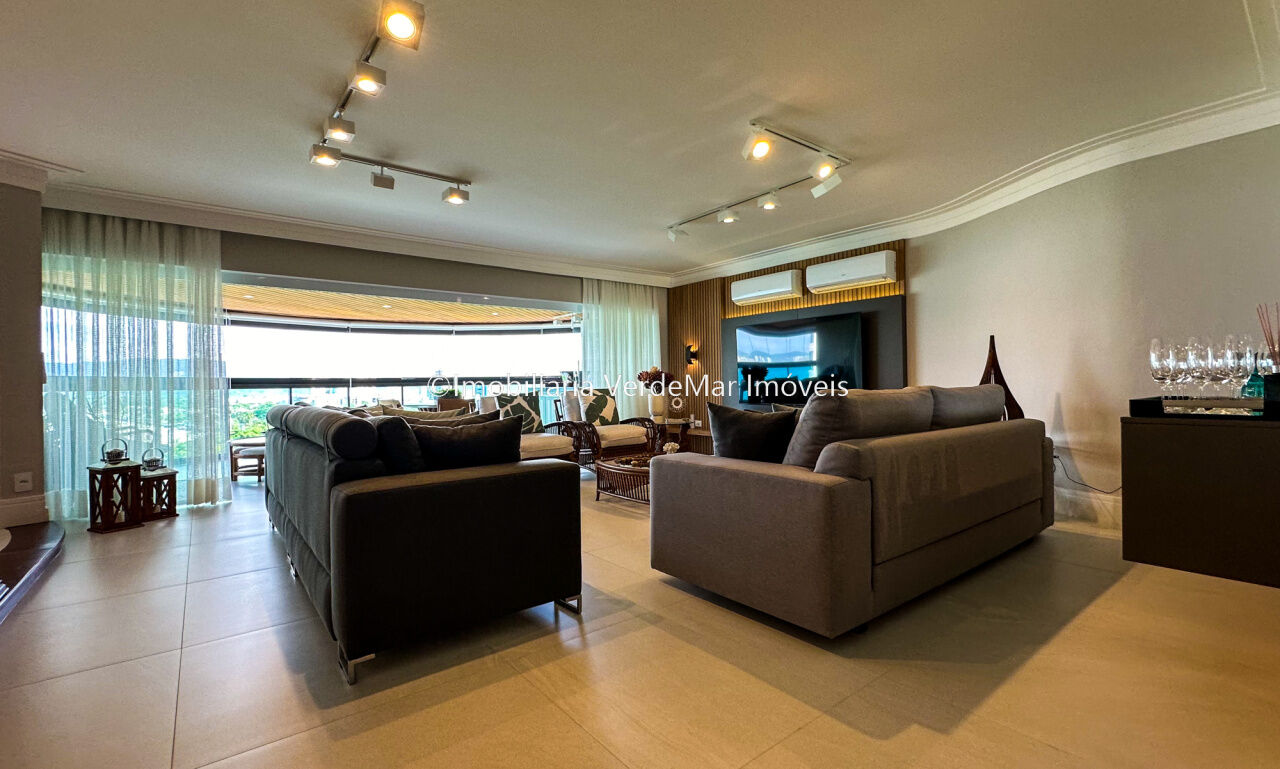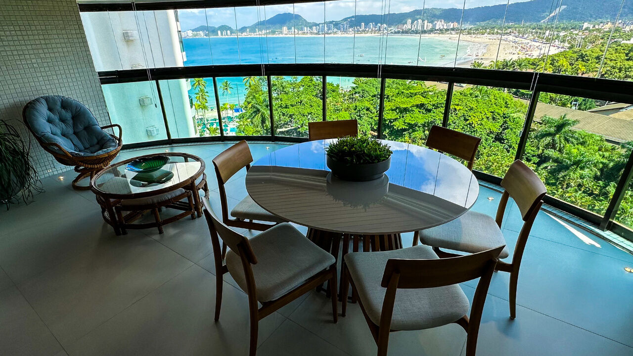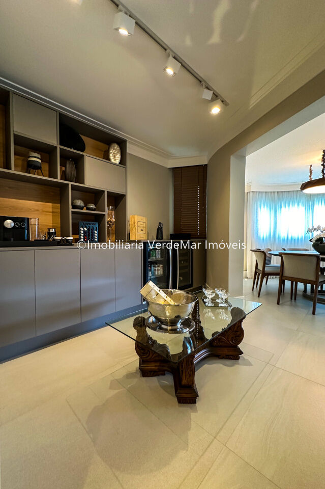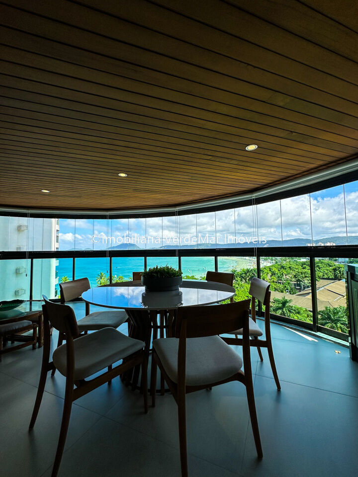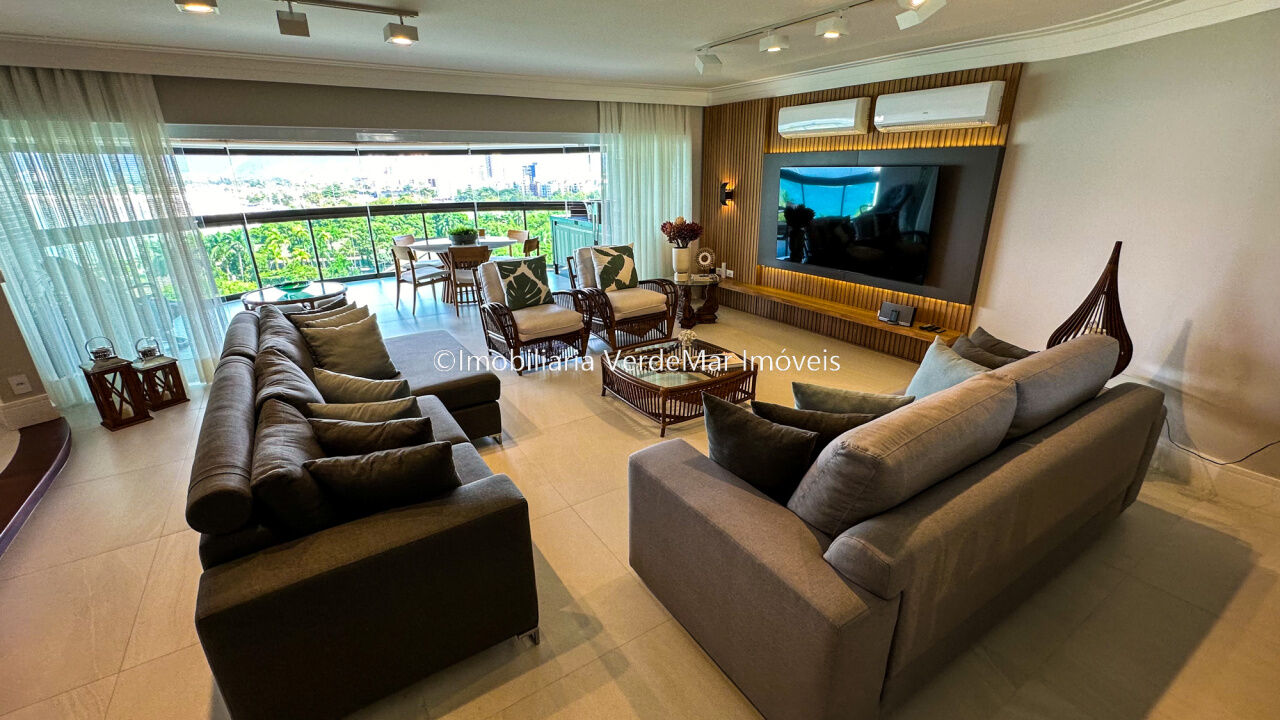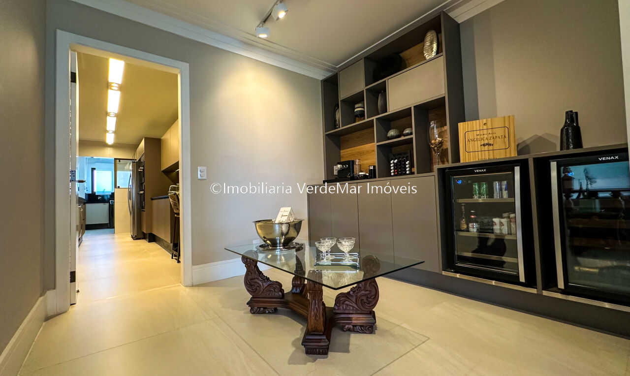 Apartamento decorado à venda no condomínio Tortugas na praia da Enseada no Guarujá, vista mar, com 4 suítes sendo a máster com closet, sala para 3 ambientes com sacada, copa, cozinha planejada e dependência de empregada reversível.