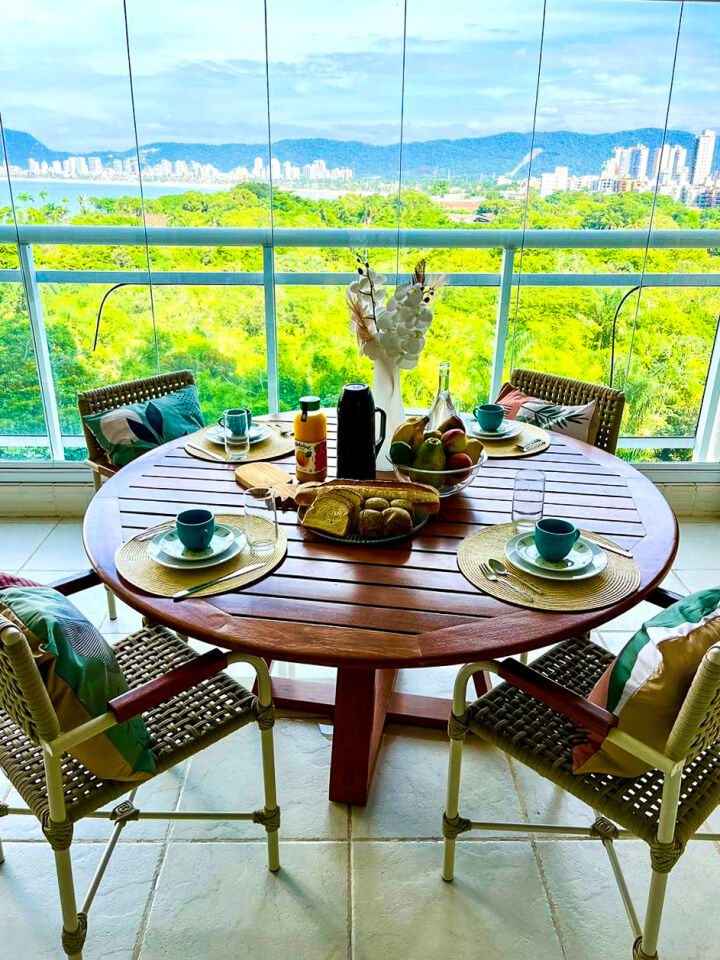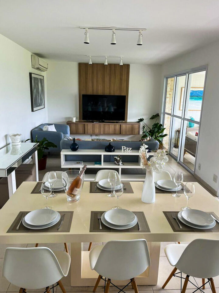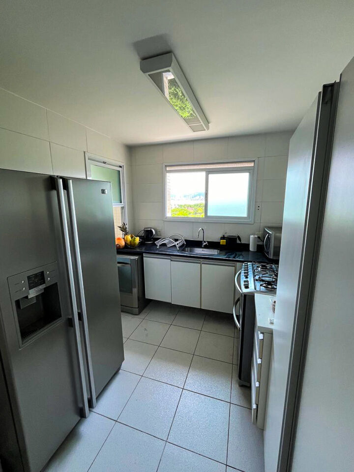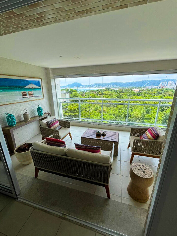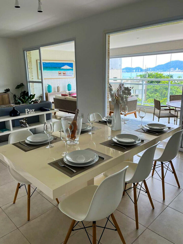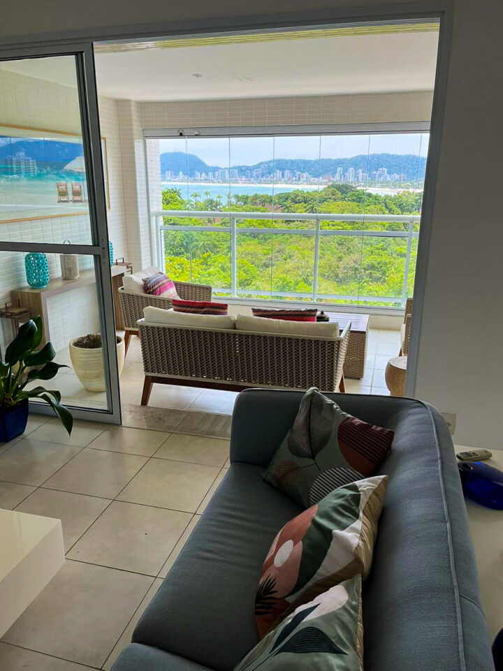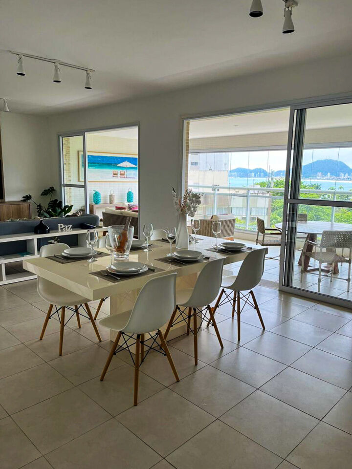 Apartamento a 150 metros da praia da Enseada em Guarujá com vista para o mar, 03 suítes, sala para 02 ambientes, cozinha, lavanderia, dependência de empregada e amplo terraço gourmet com churrasqueira.