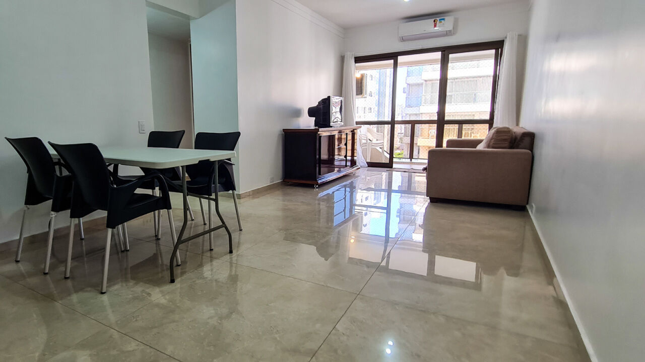 Apartamento à venda na praia das Pitangueiras em Guarujá, com 3 dormitórios sendo 1 suíte, sala para 2 ambientes, cozinha planejada e área de serviços.