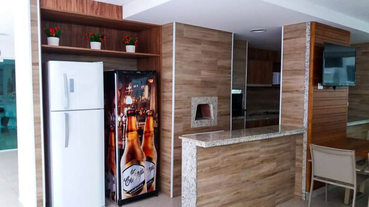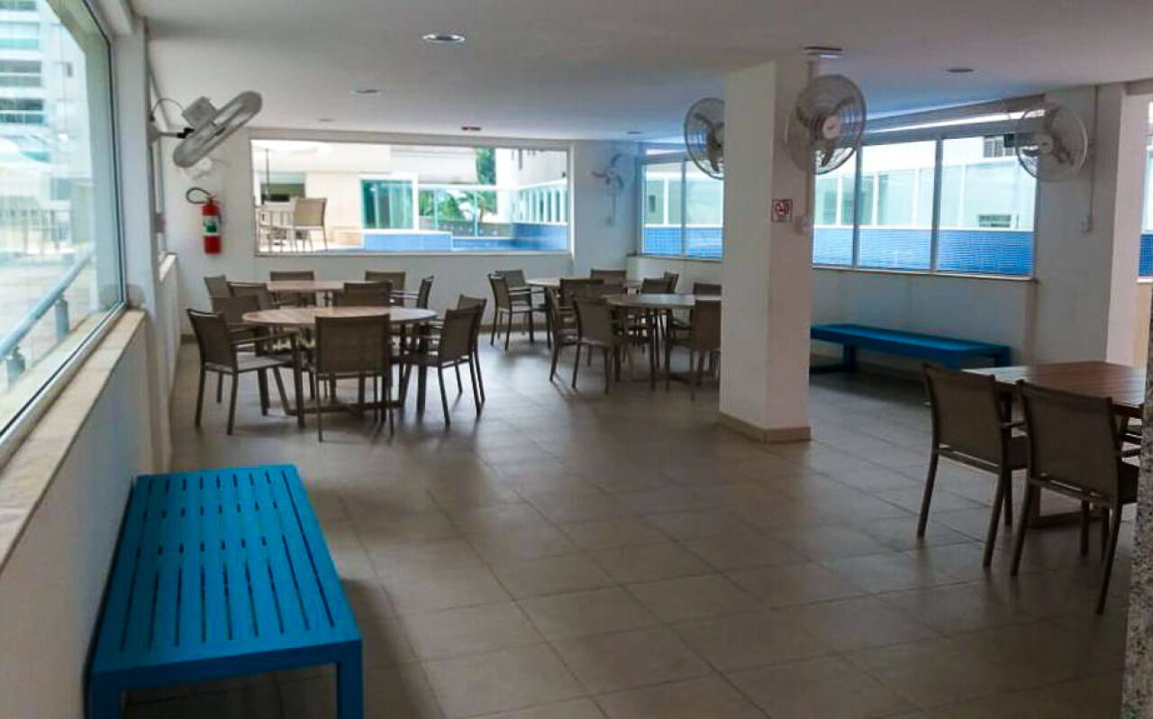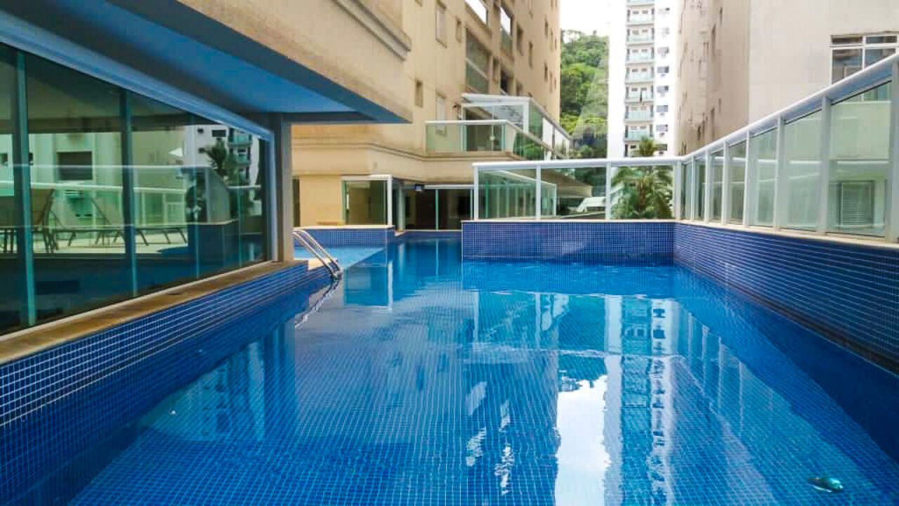 Lazer do prédio com piscina, salão de festas, churrasqueira, sauna, academia, espaço kids, portaria 24 horas e serviço de praia.