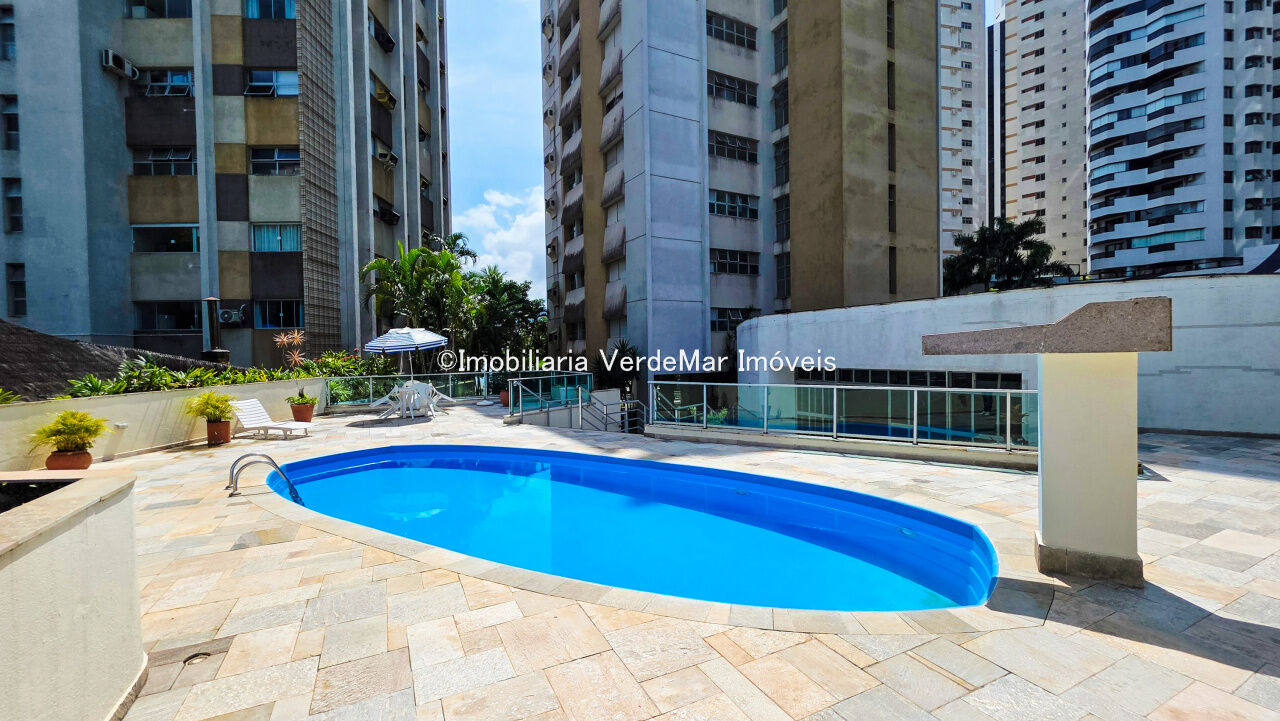 Lazer do prédio com piscina, churrasqueira, salão de festas, salão de jogos e serviço de praia.