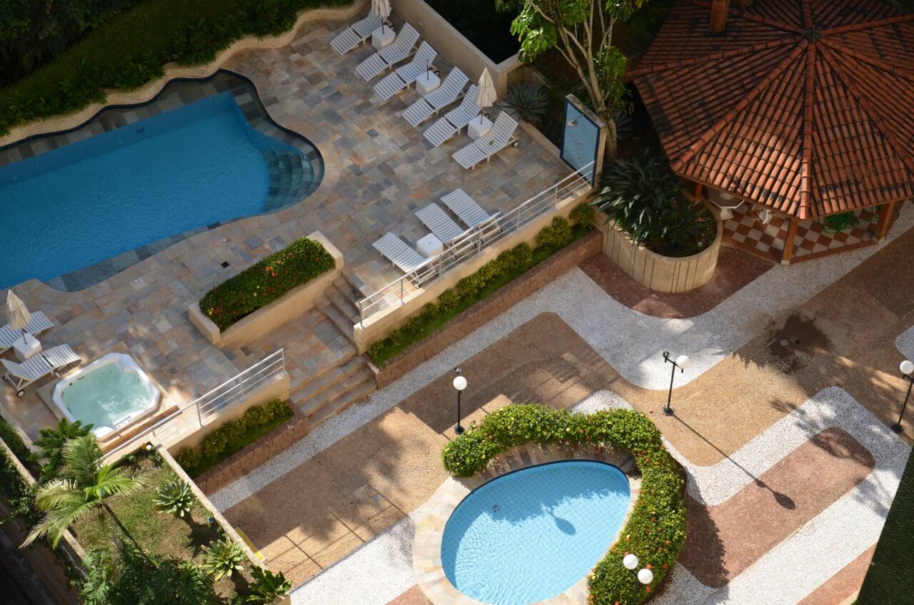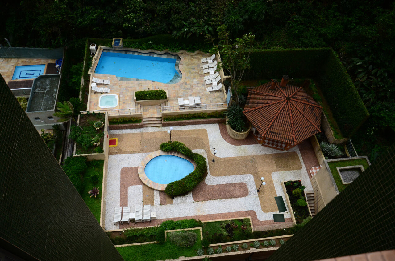 Lazer do prédio com piscina, espaço gourmet com churrasqueira, academia jardim e serviço de praia.