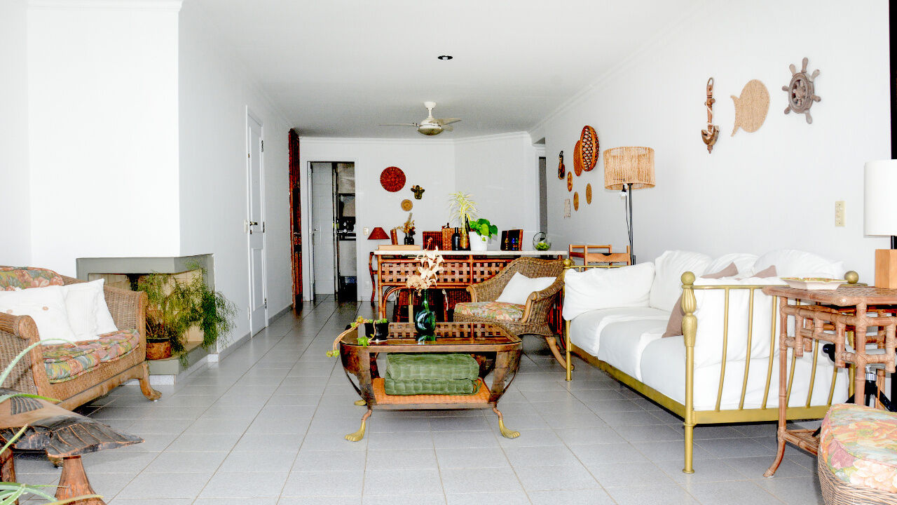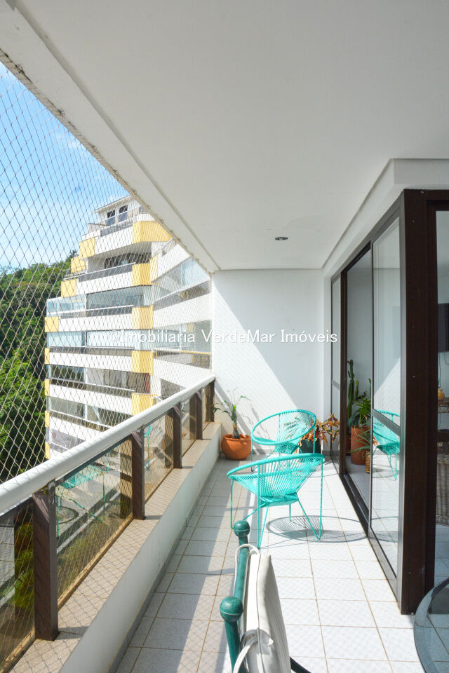 Apartamento no condomínio Sorocotuba III na praia do Sorocotuba em Guarujá, 3 suítes, sala para 2 ambientes com lareira, ampla varanda, cozinha, lavabo e dependência de empregada.
