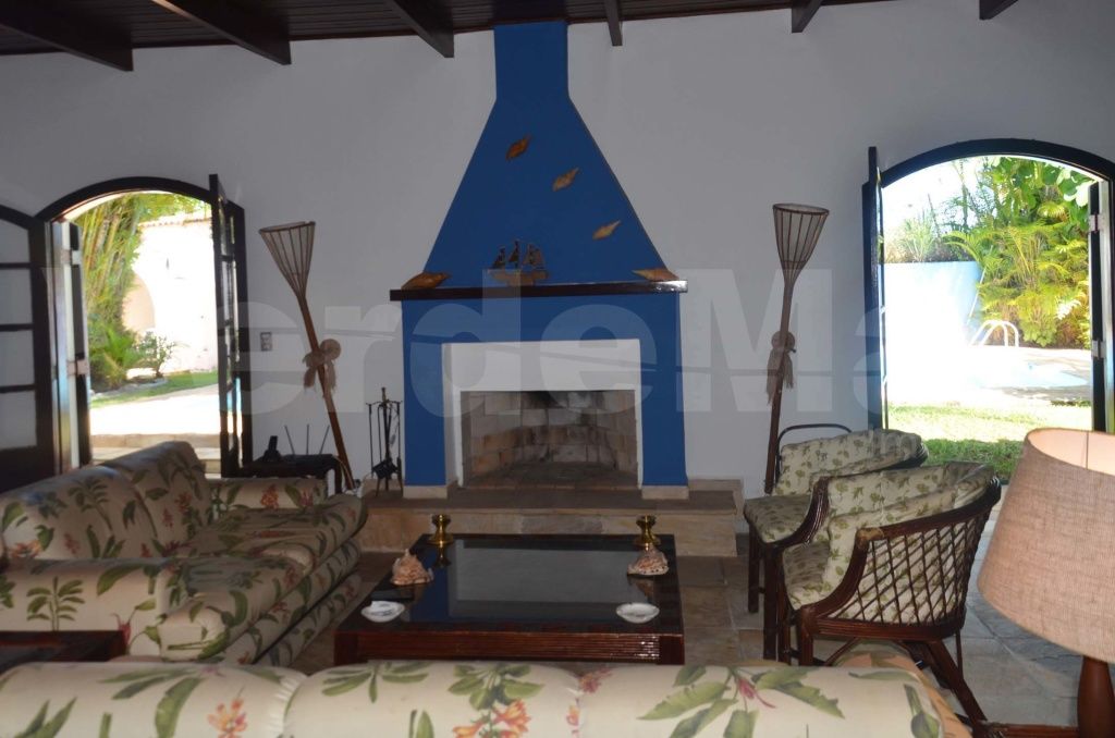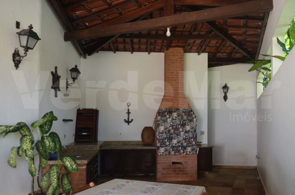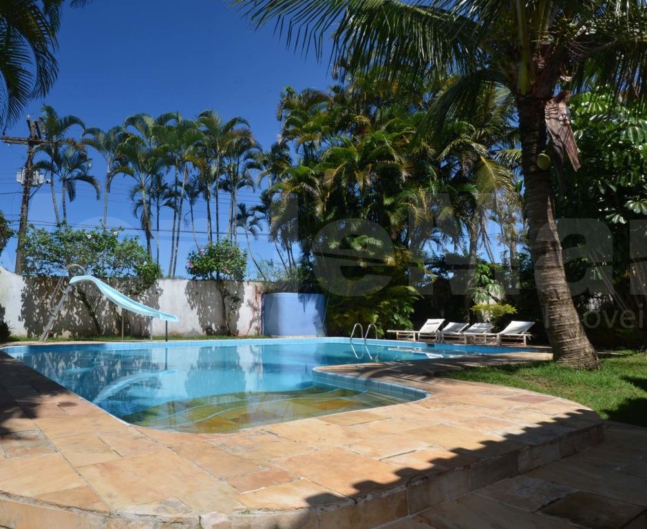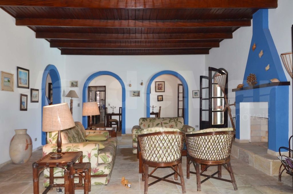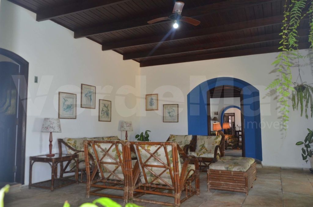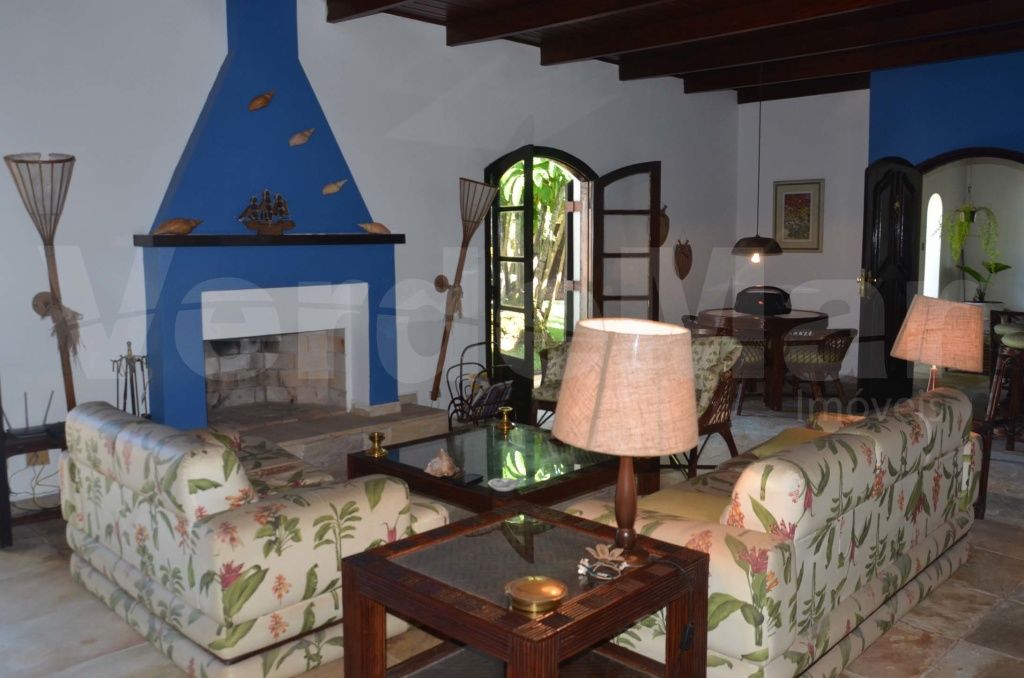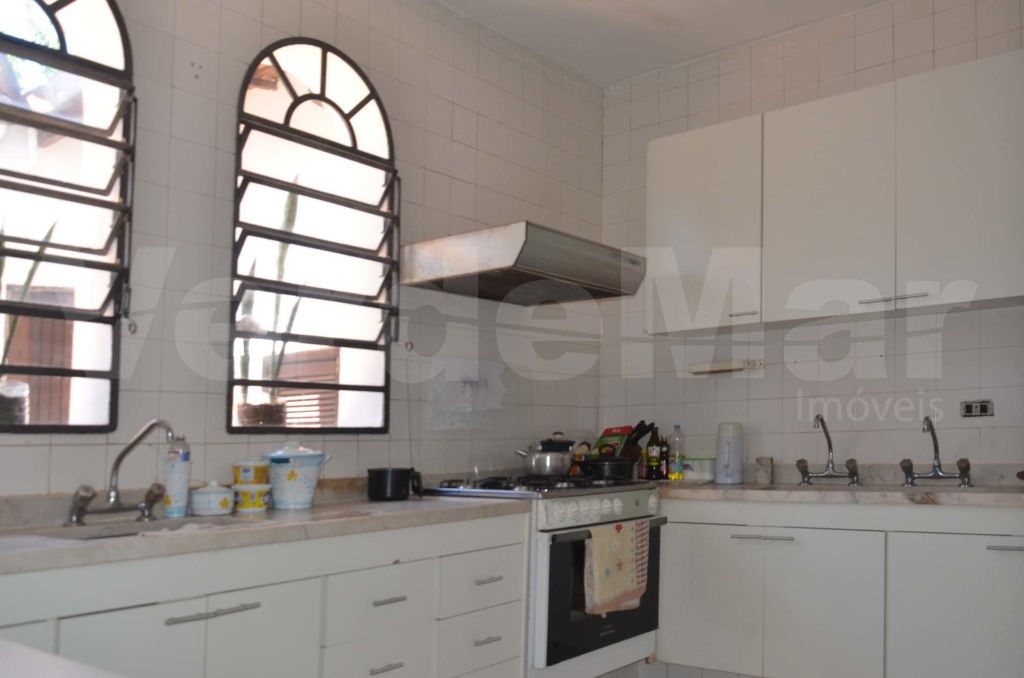 Casa térrea de esquina à venda no Jardim Virginia em Guarujá, com 4 suítes e mais 2 quartos com banheiro, sala para 4 ambientes com varanda, cozinha com armários, área de serviço e casa de caseiro