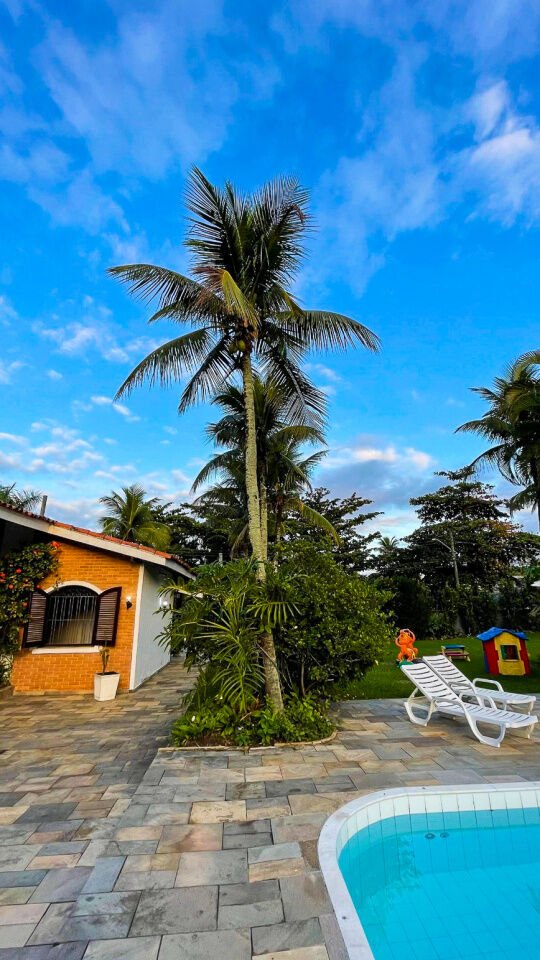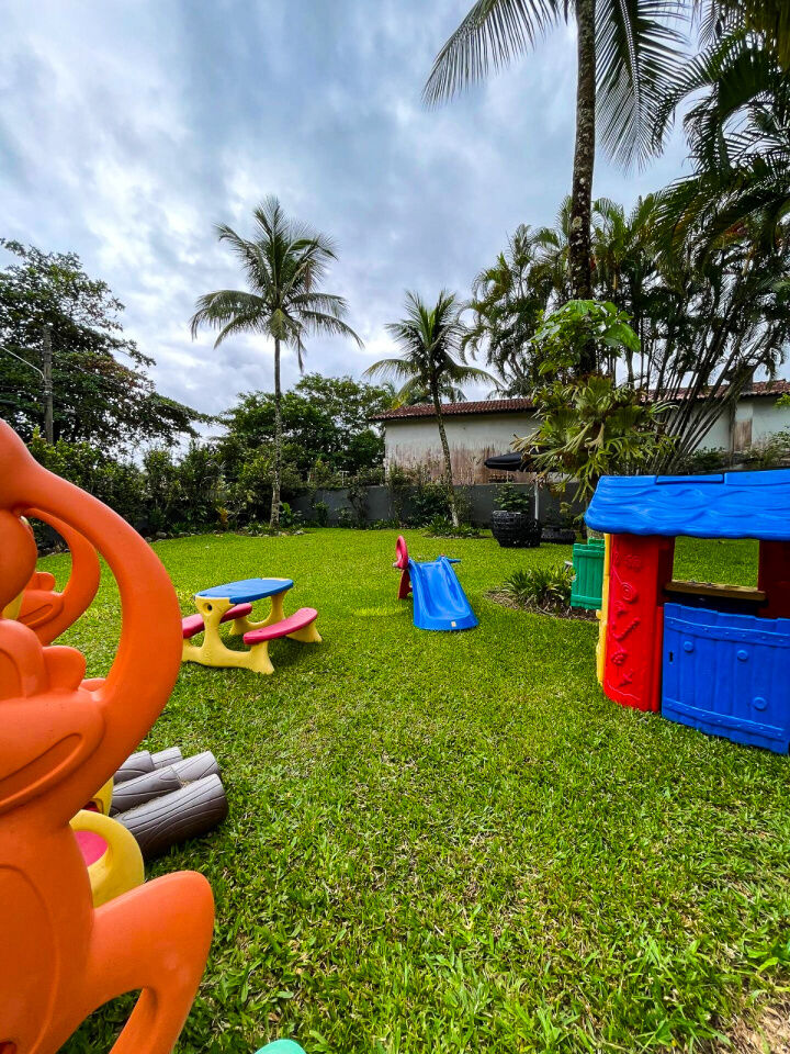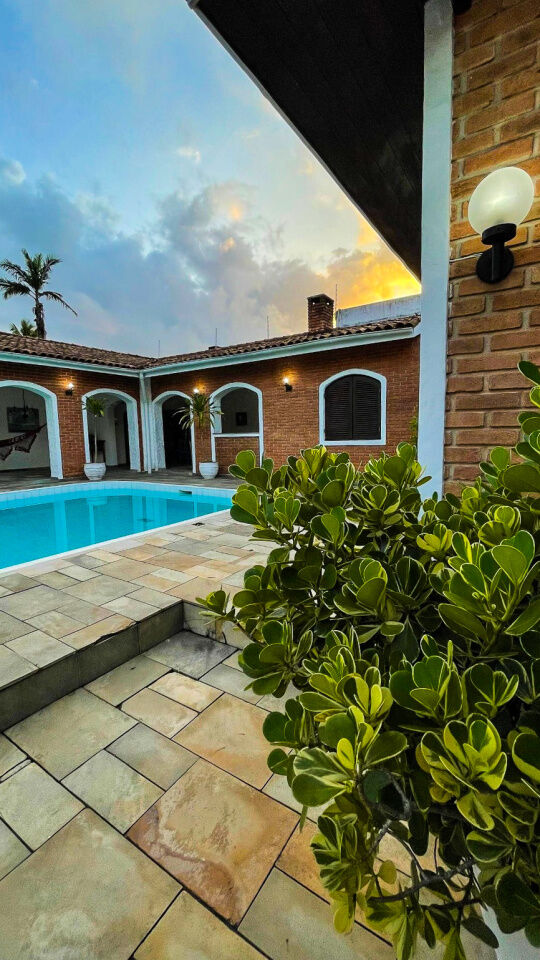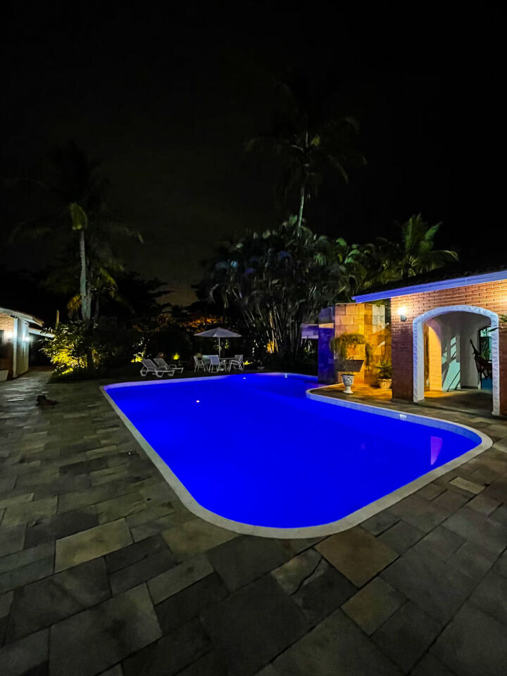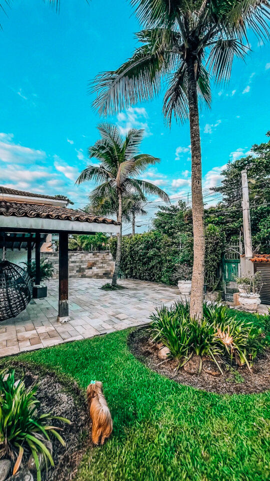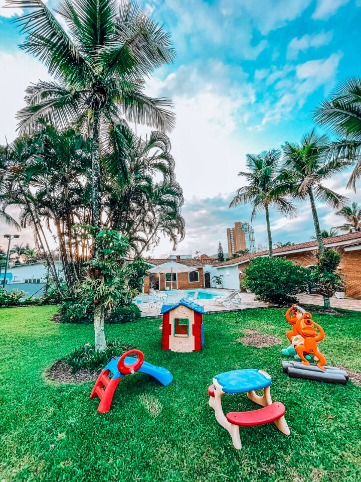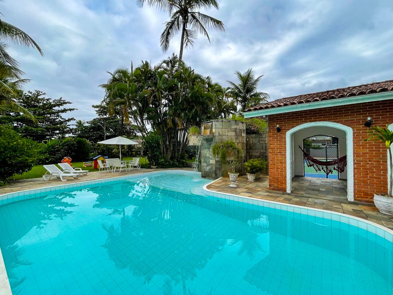 Lazer com piscina e cascata, amplo jardim, quadra poliesportiva e varanda com churrasqueira e cozinha de apoio.