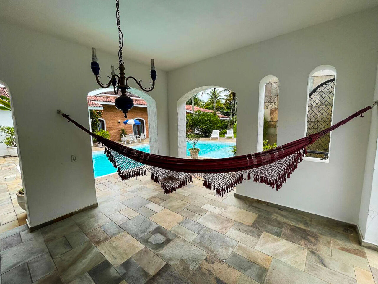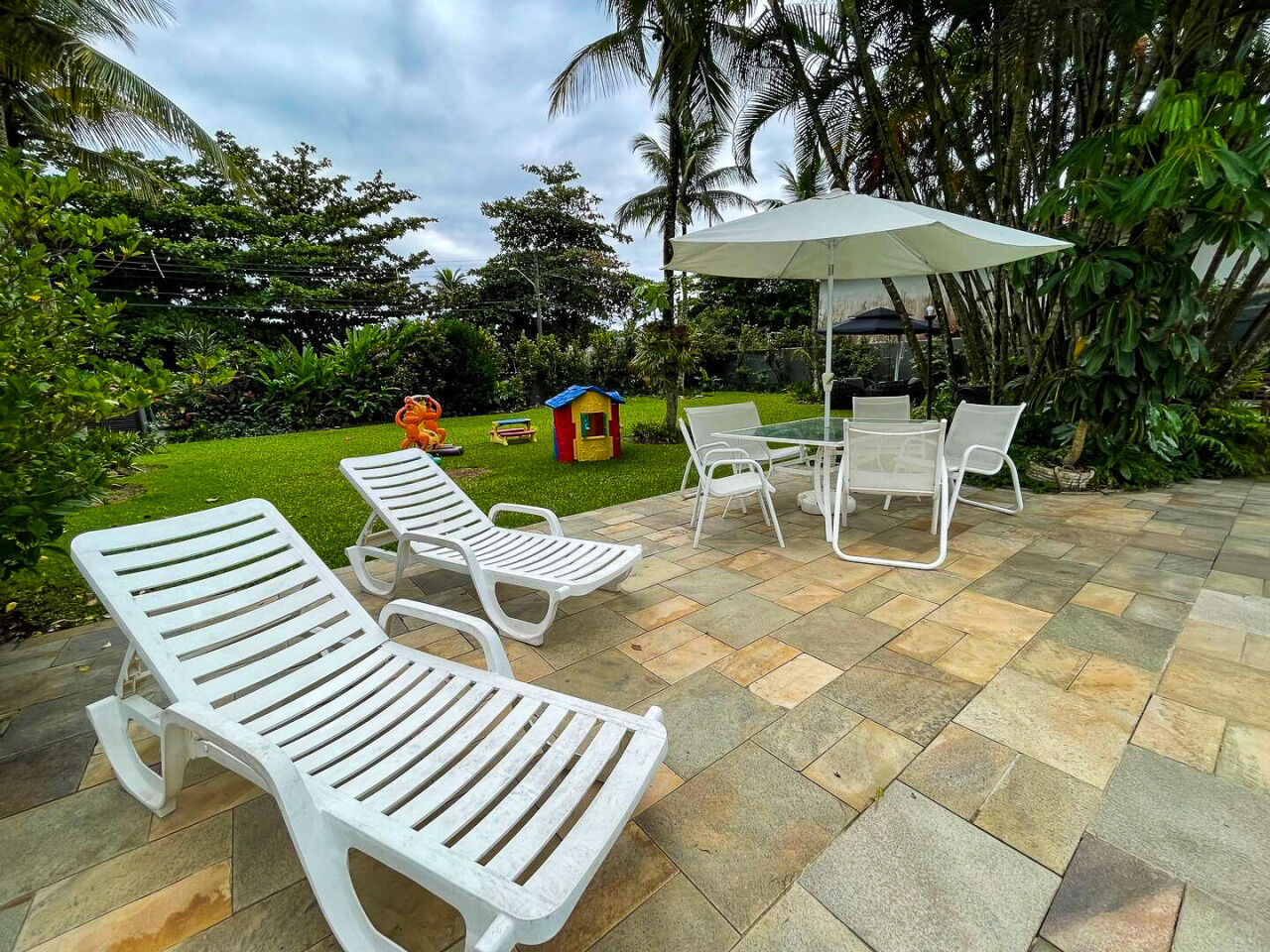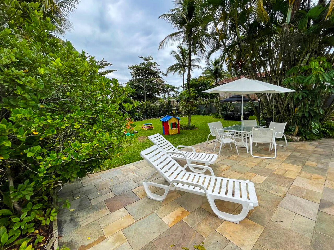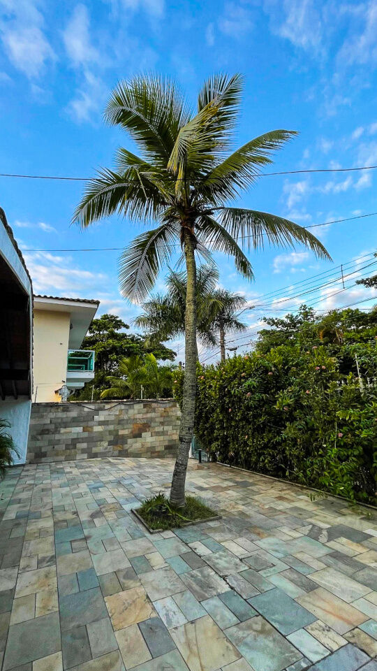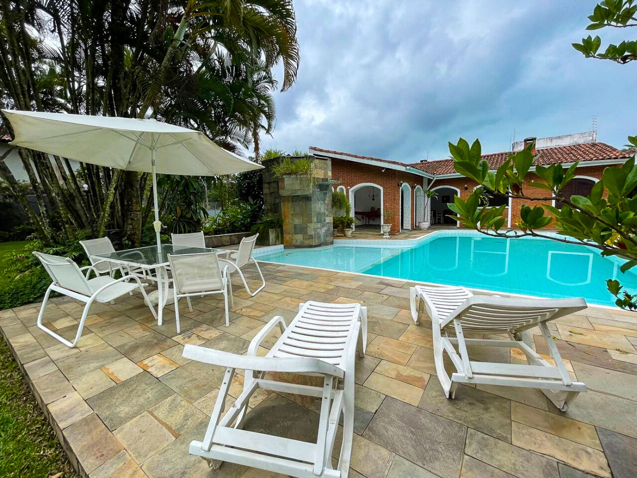 Lazer com piscina e cascata, amplo jardim, quadra poliesportiva e varanda com churrasqueira e cozinha de apoio.