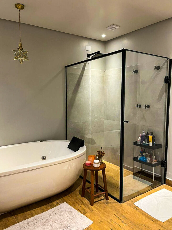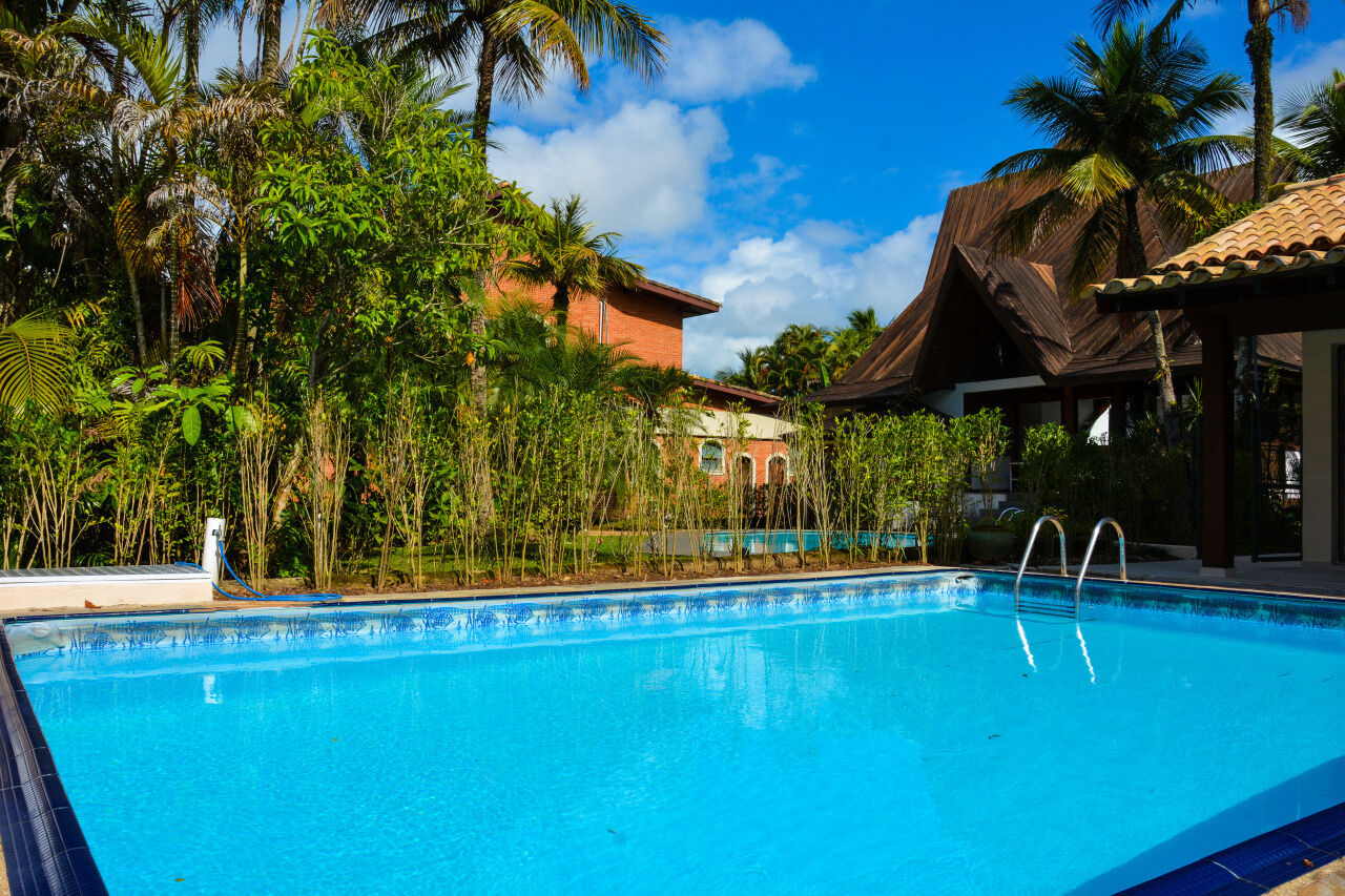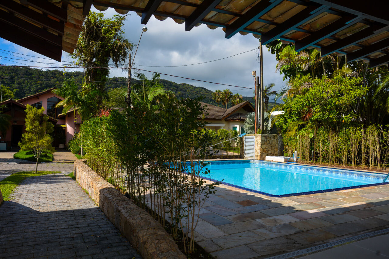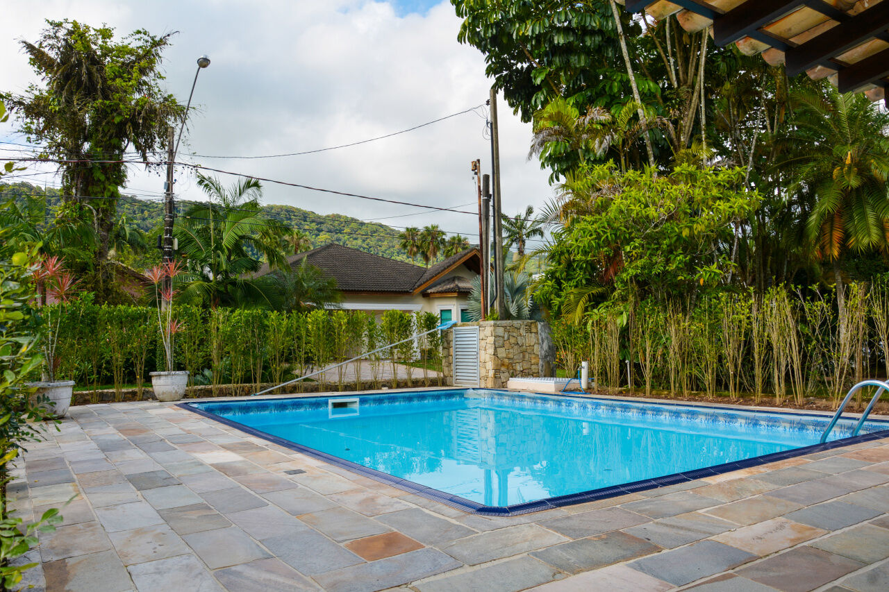 Lazer com piscina, jardim e quiosque com churrasqueira