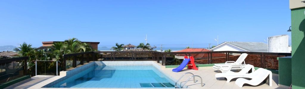 Lazer com jardim, piscina e varanda com churrasqueira.