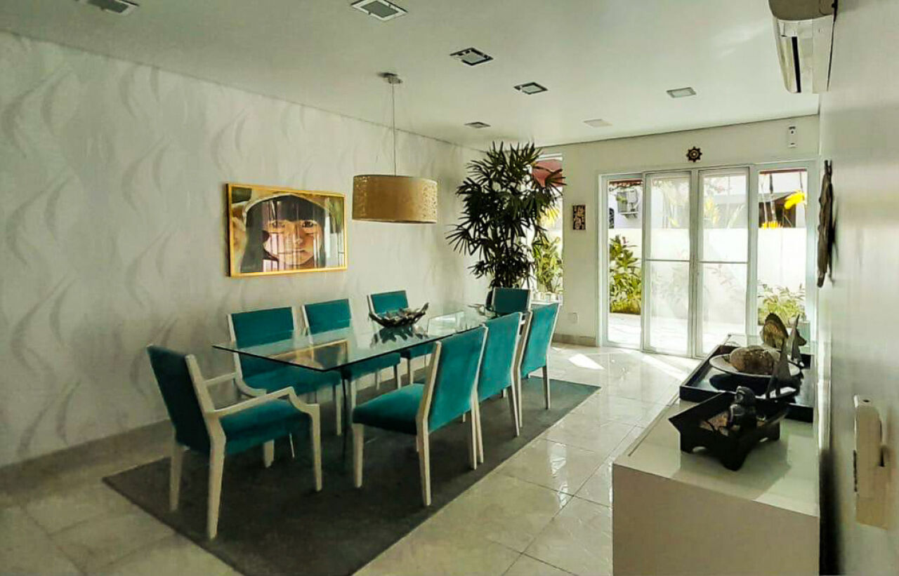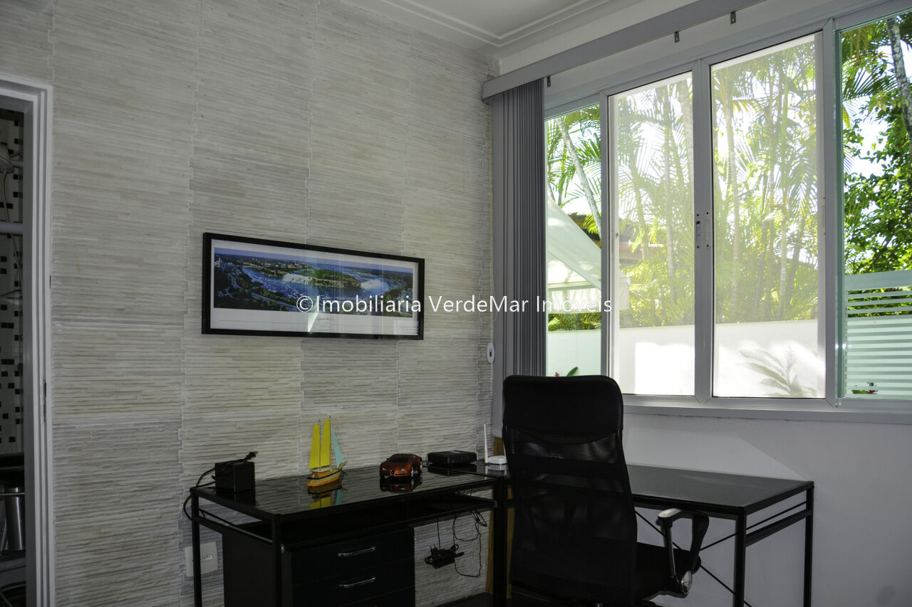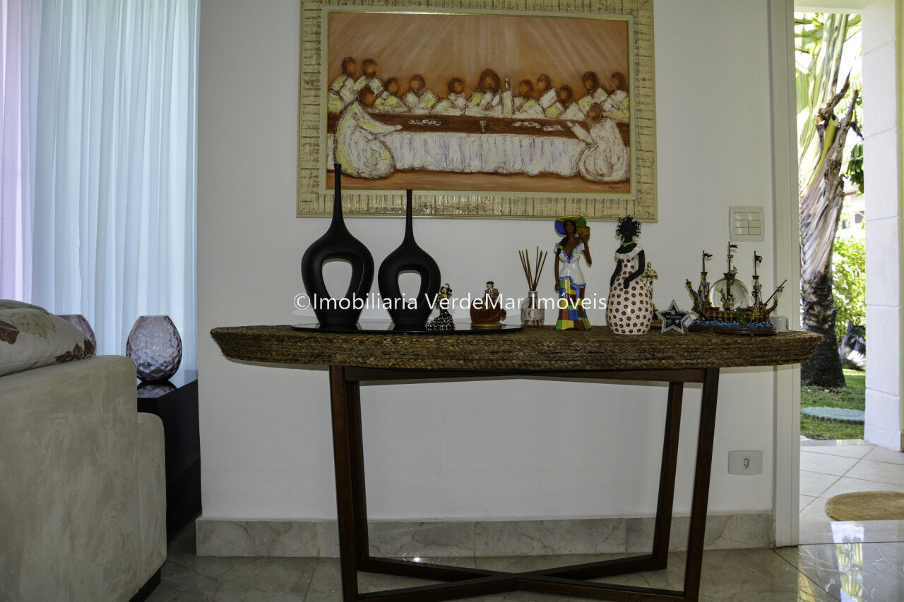 Granville Guarujá, casa térrea a venda em condominio fechado, mobiliada e decorada com 05 suítes, sala para 2 ambientes com lareira, escritório, ampla sala de jantar, cozinha e lavanderia.