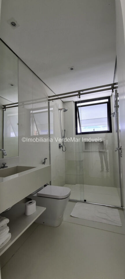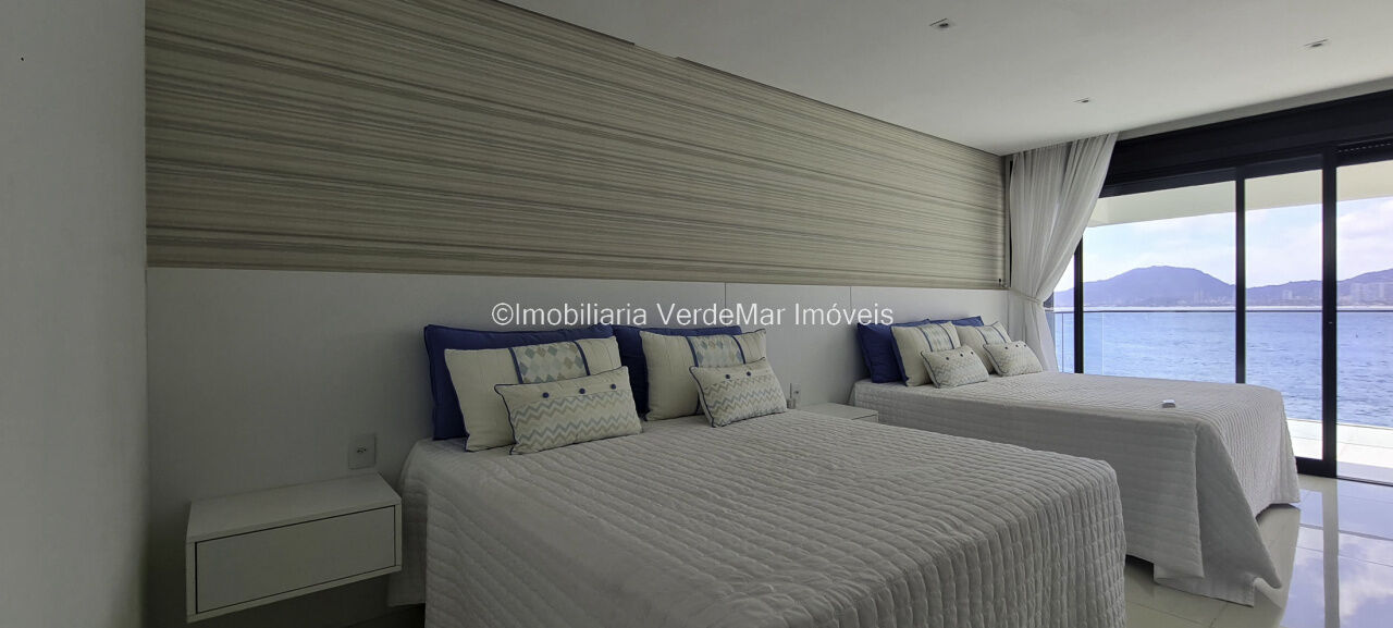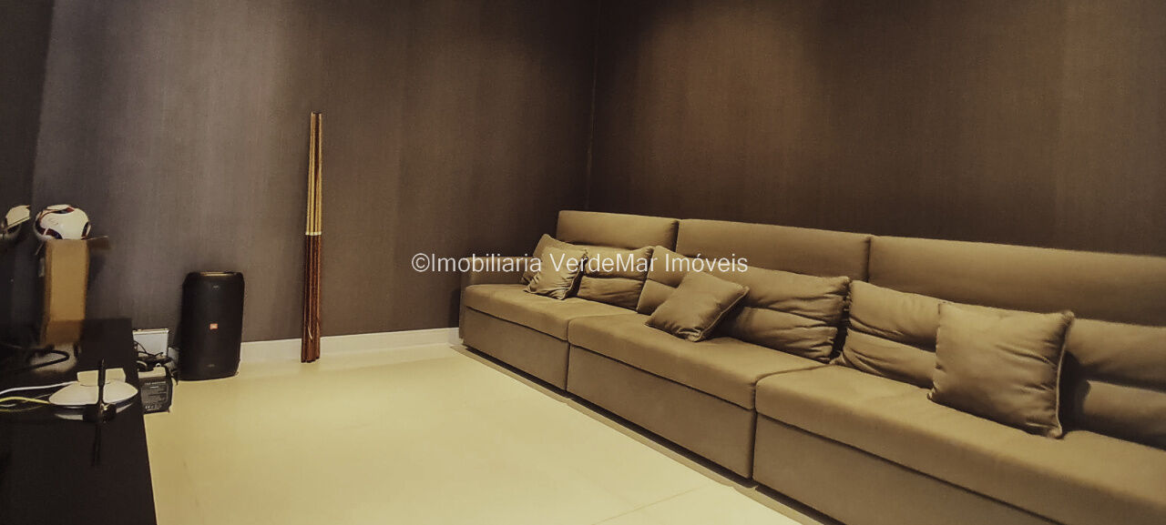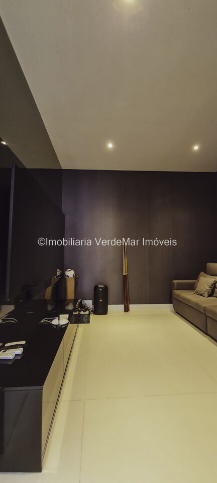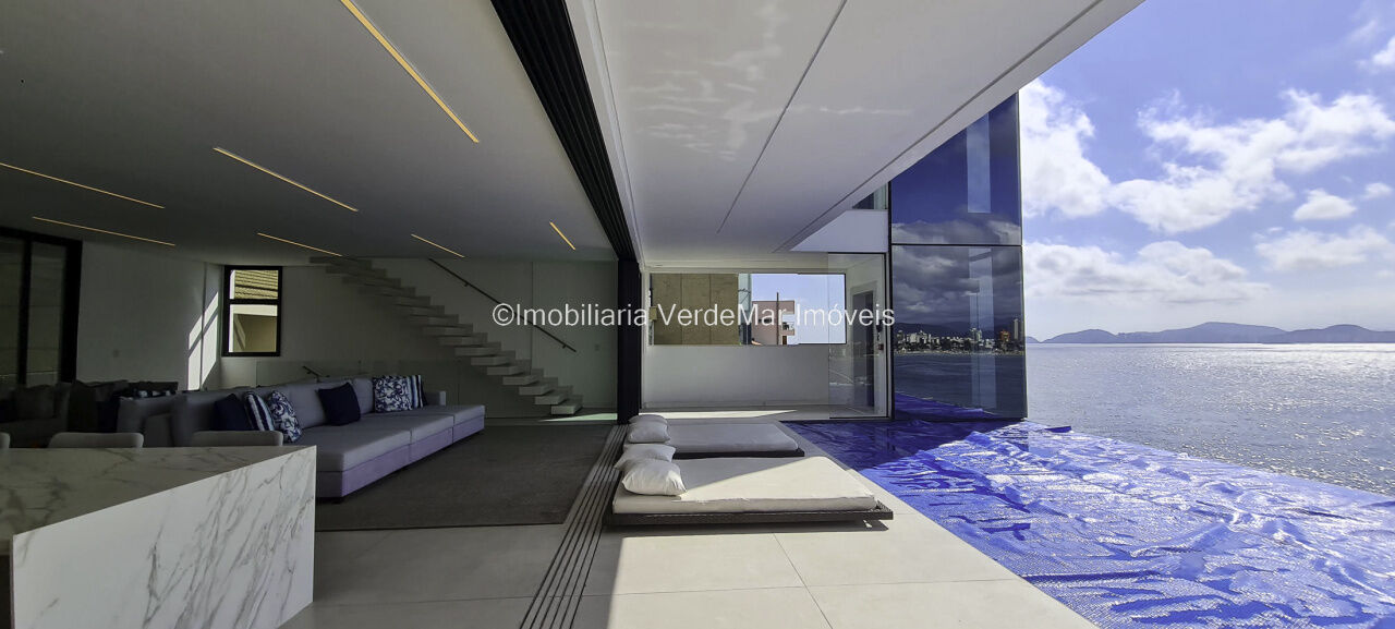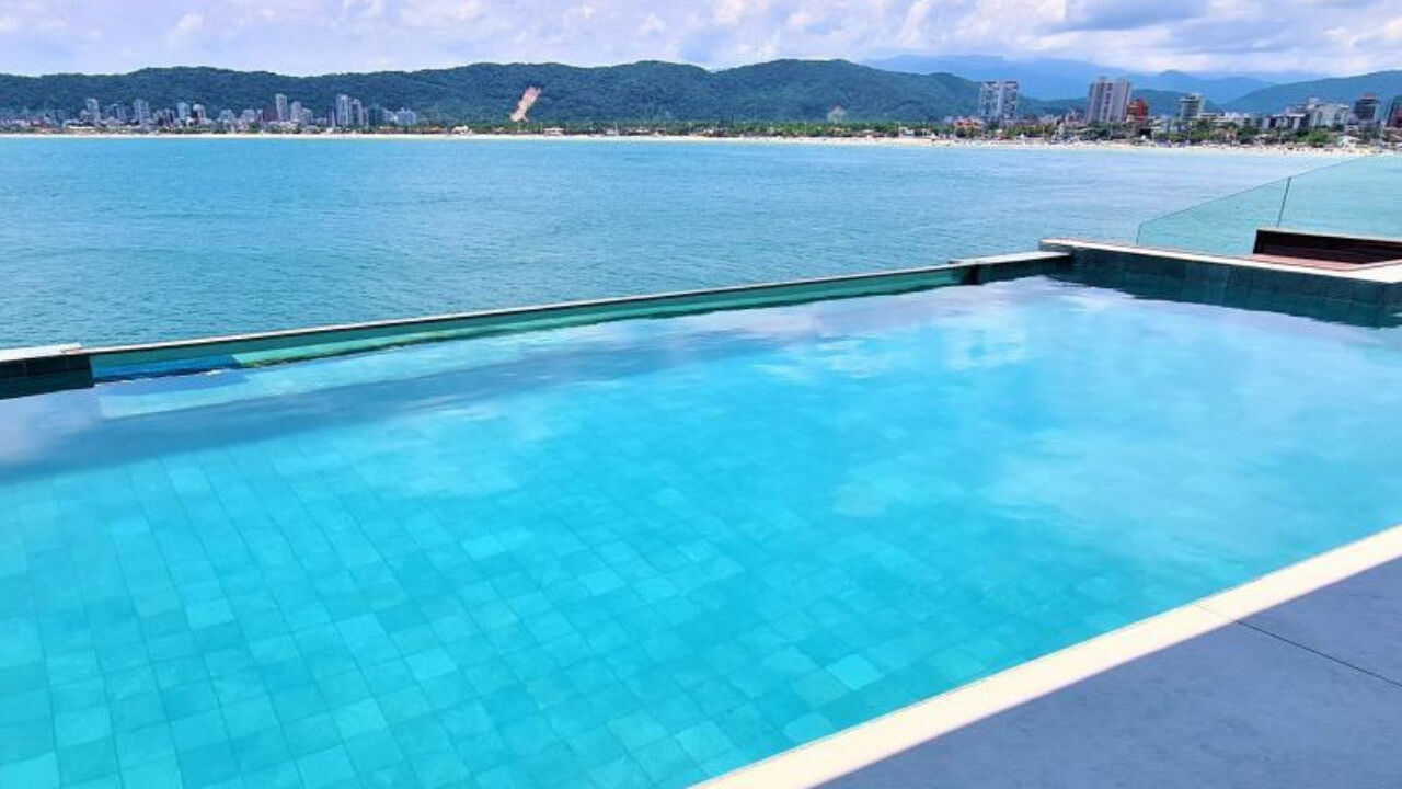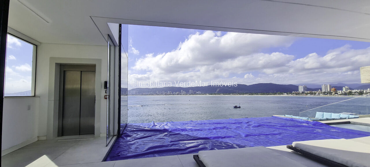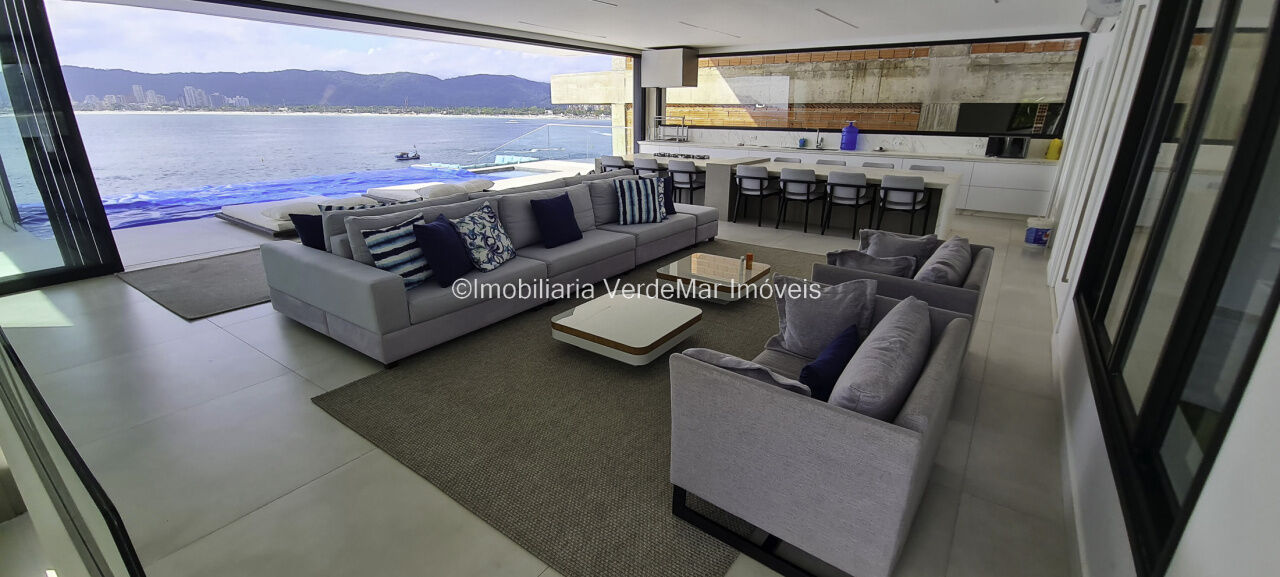 Lazer conta com piscina aquecida de borda infinita e espaço luau com vista total ao mar, salão de jogos com cinema, e garagem náutica para embarcação até 30 pés com rampa e píer.