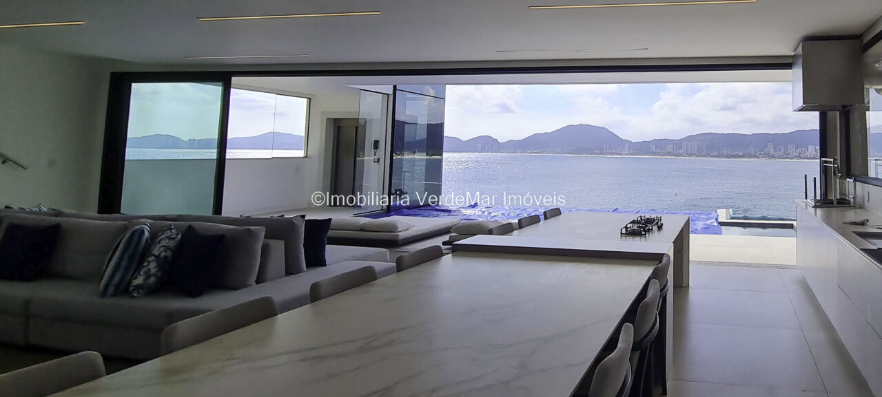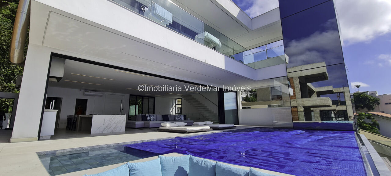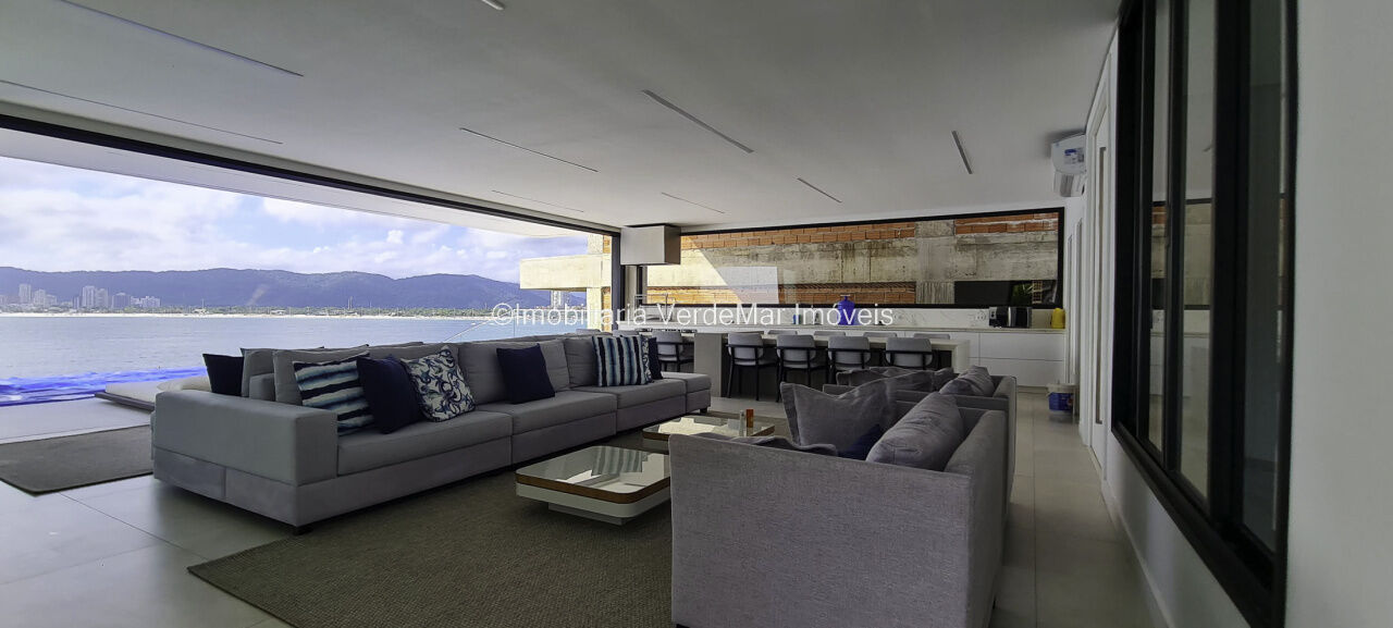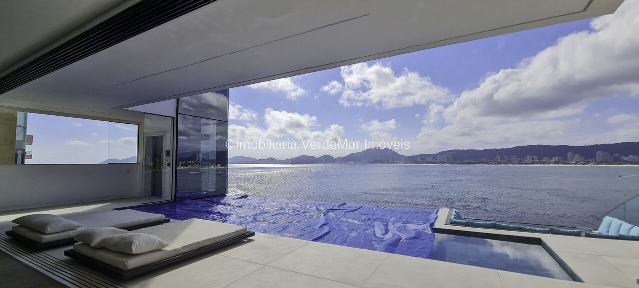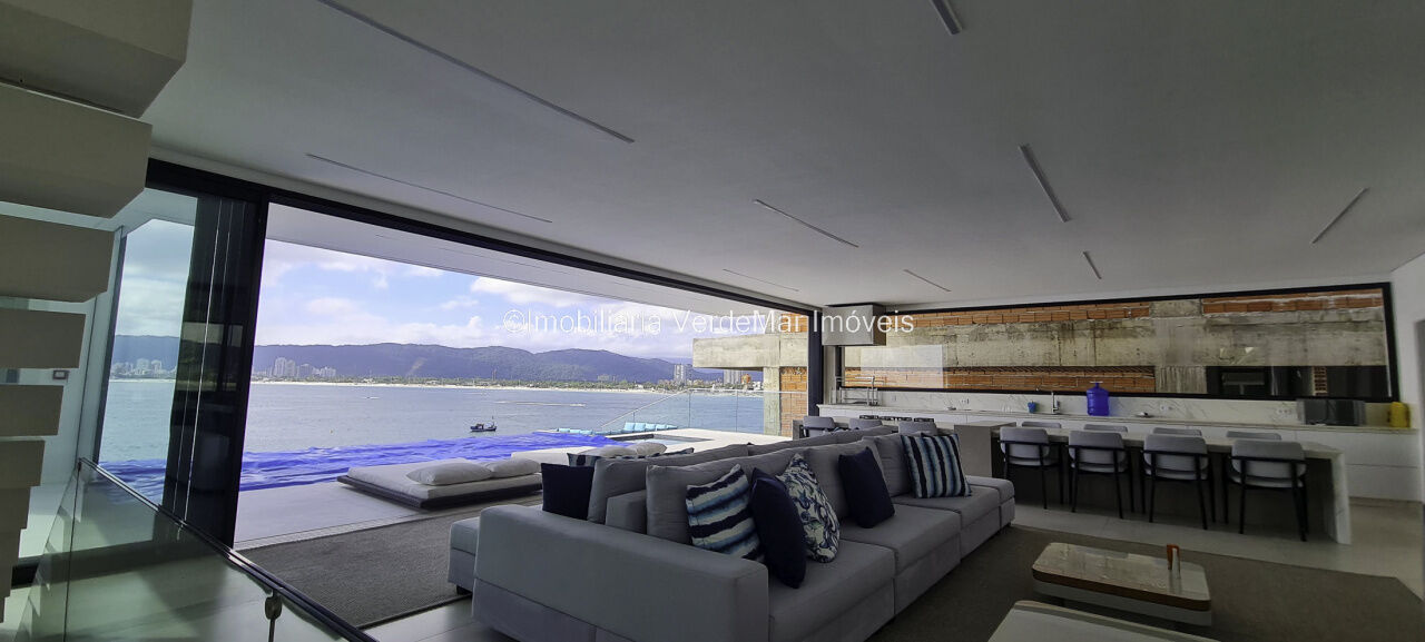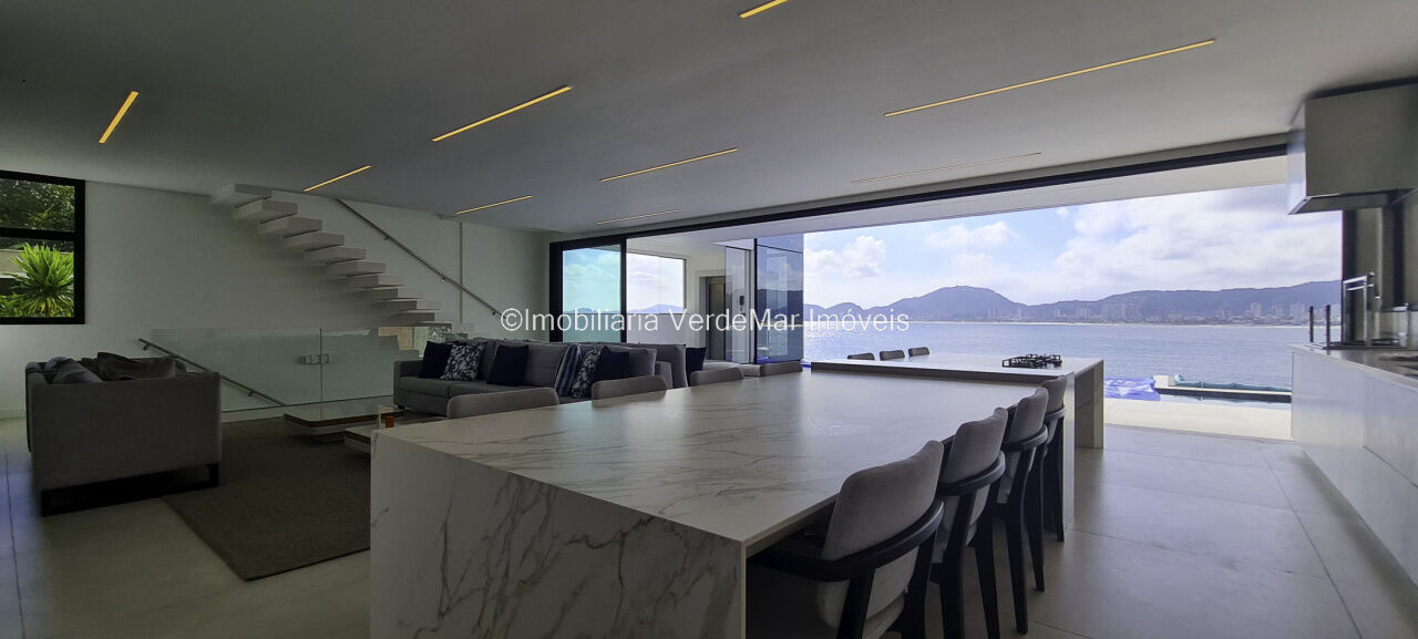 Belíssima casa nova à venda no condomínio Península na praia da Enseada em Guarujá. Com 06 suítes mobiliadas e com ar condicionado, amplo living decorado em 02 ambientes com sacada e cozinha planejada integrada, despensa, lavabo, elevador panorâmico, salão de jogos com vista ao mar e home theater.
