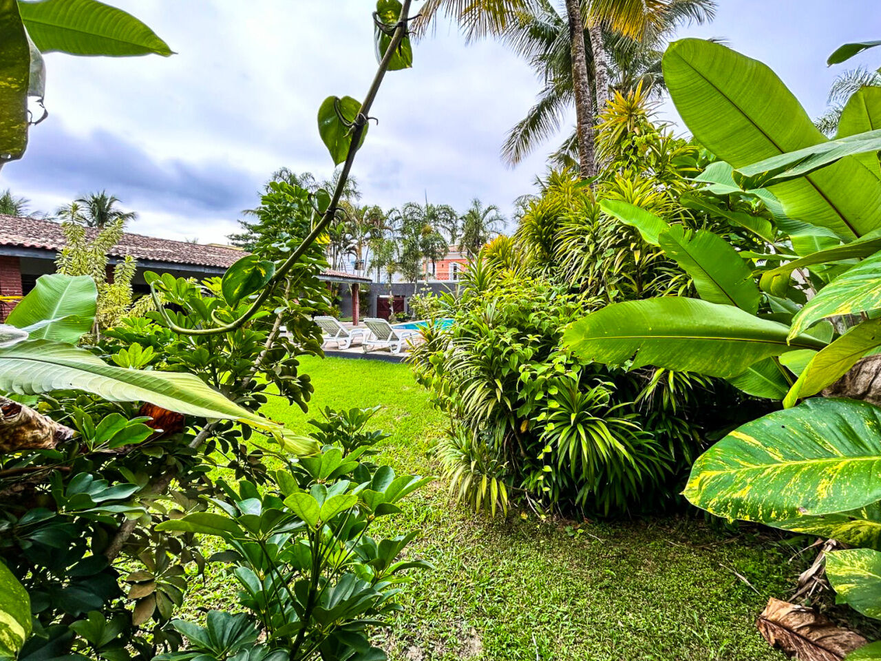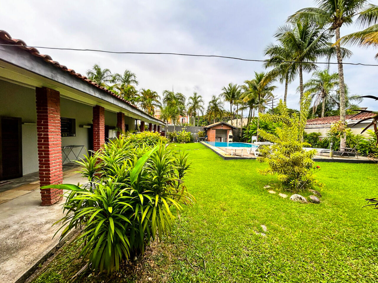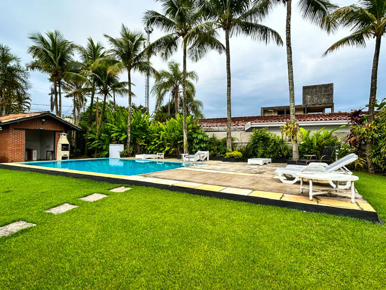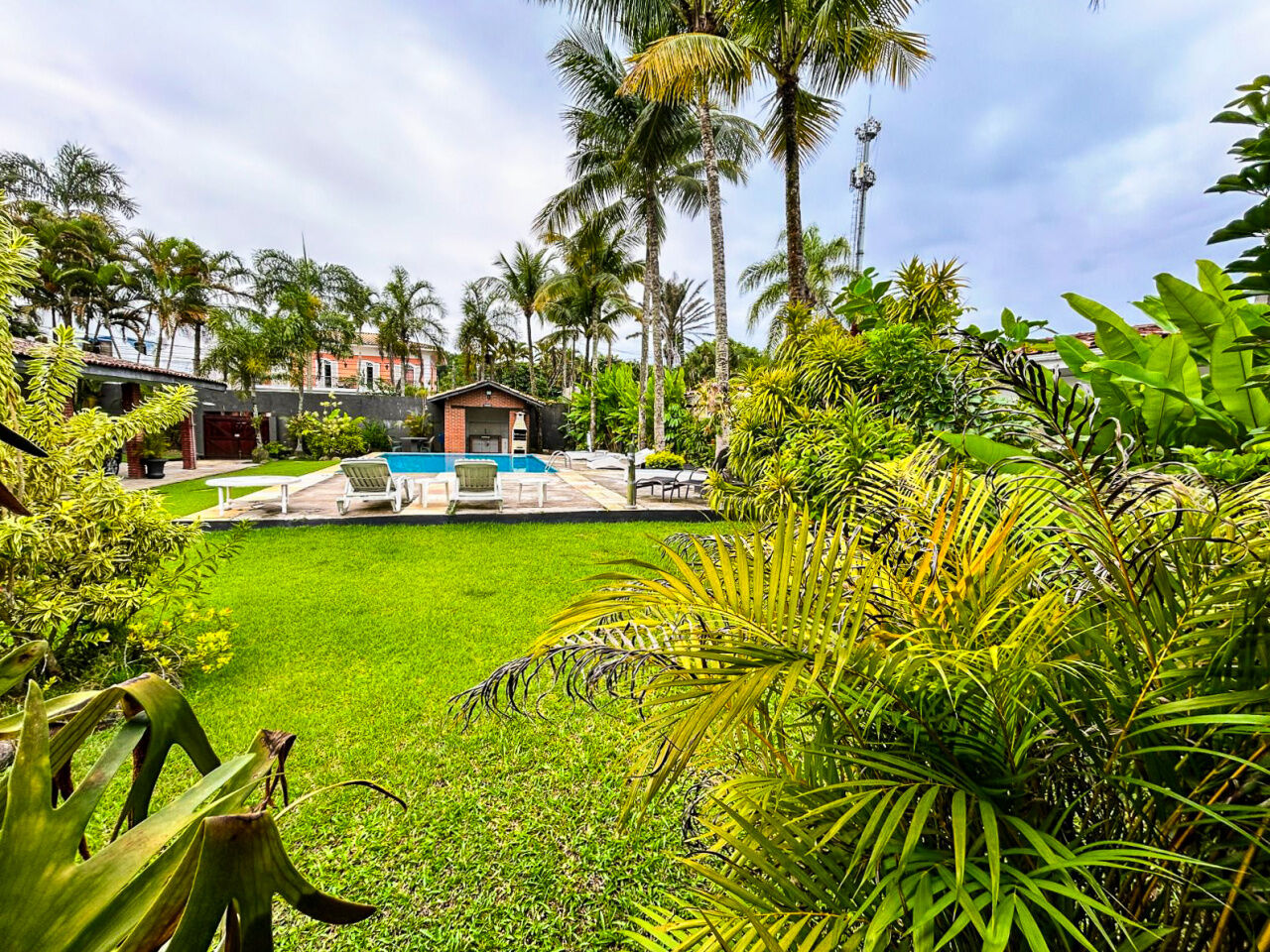 Lazer com amplo jardim, piscina, e churrasqueira.