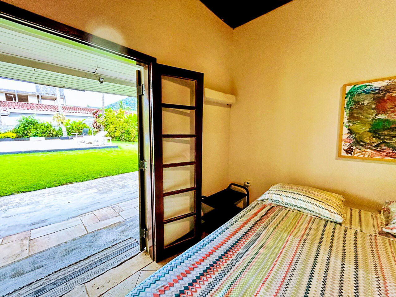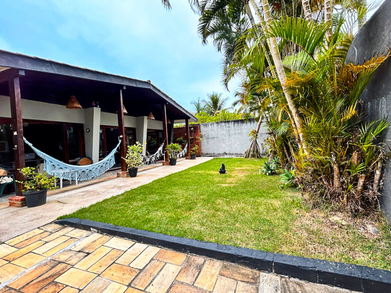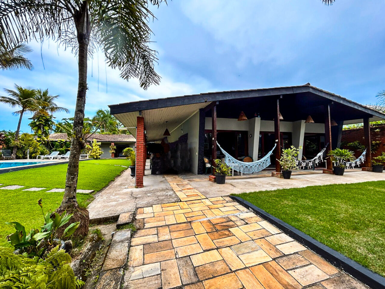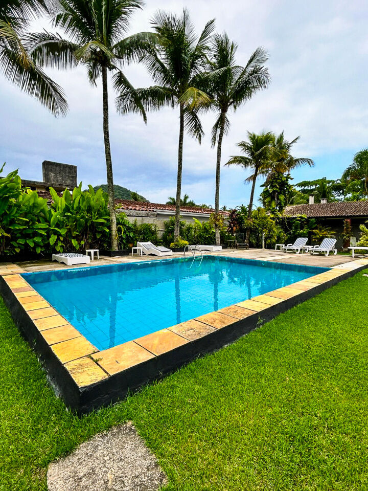 Lazer com amplo jardim, piscina, e churrasqueira.
