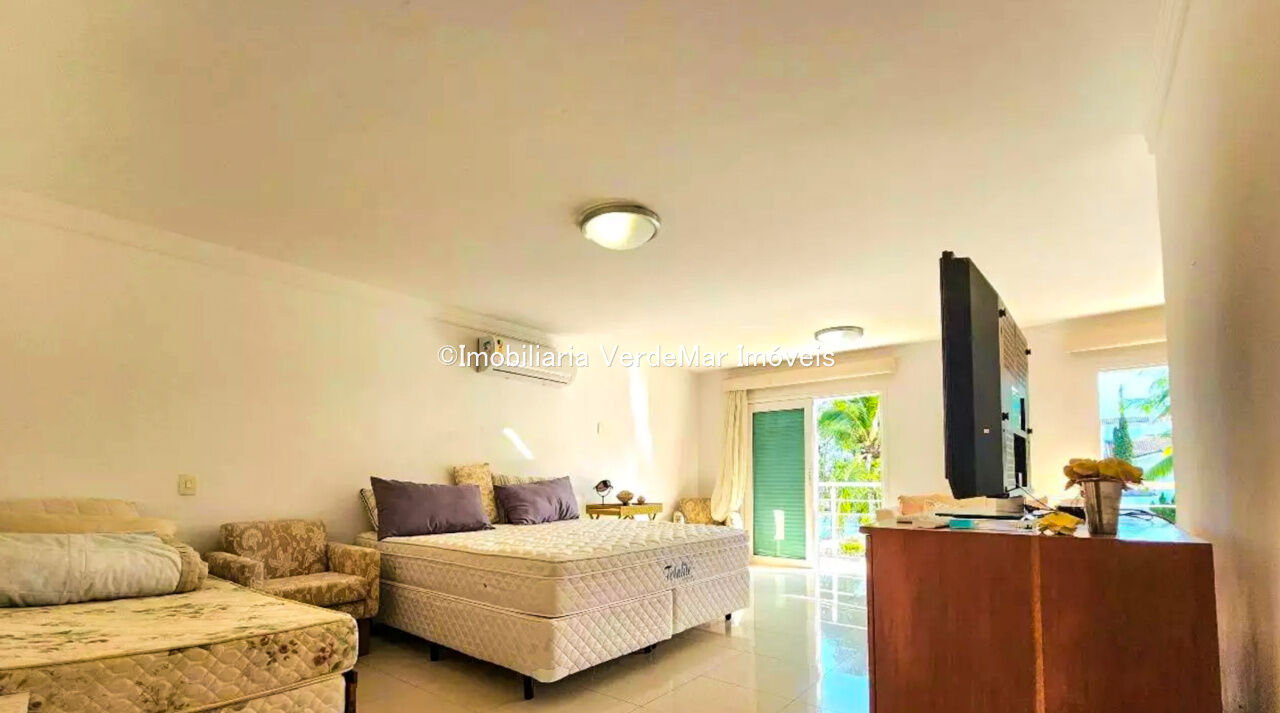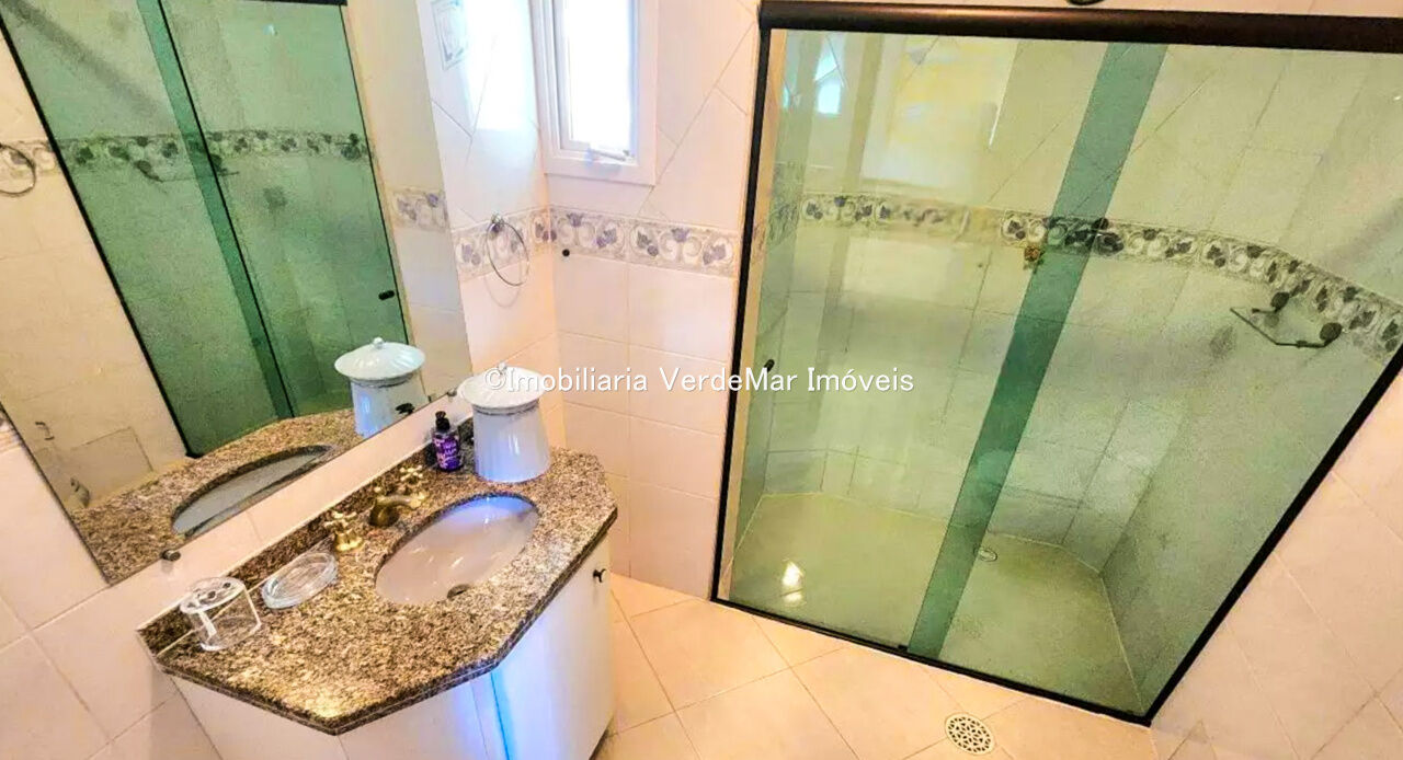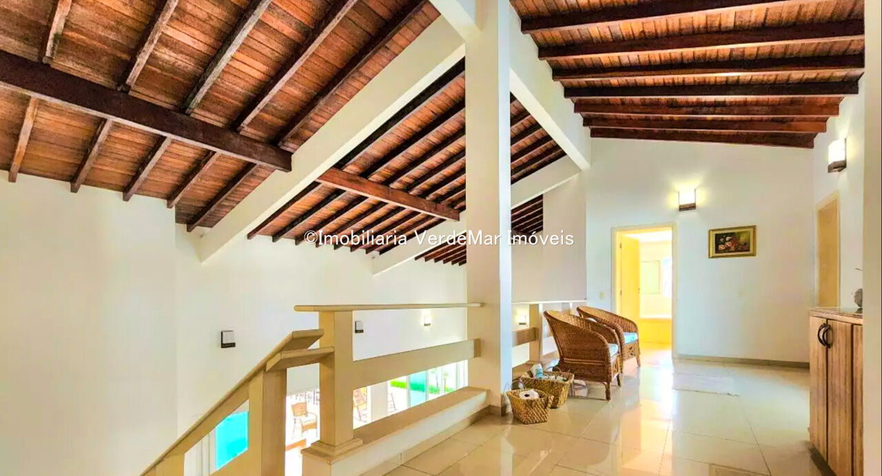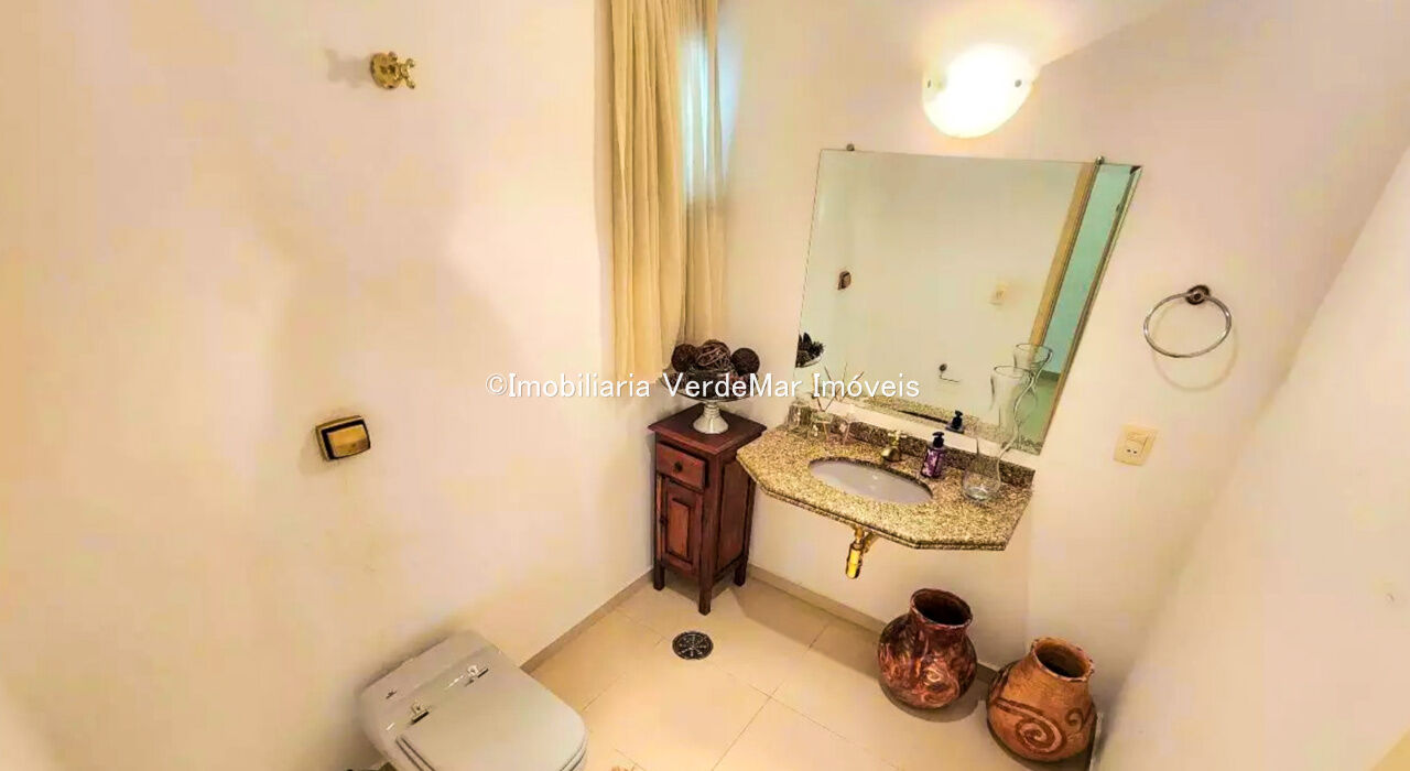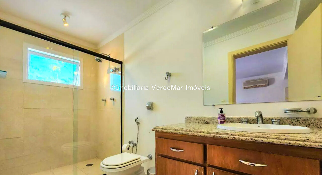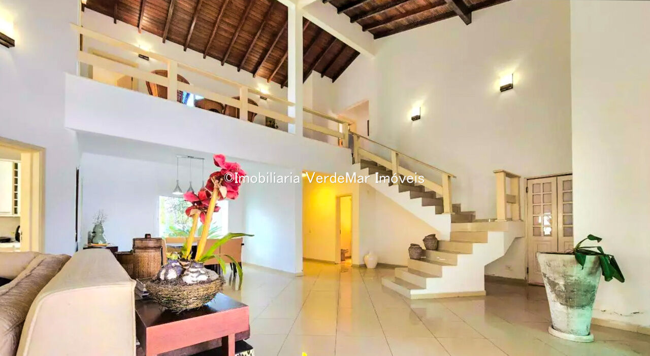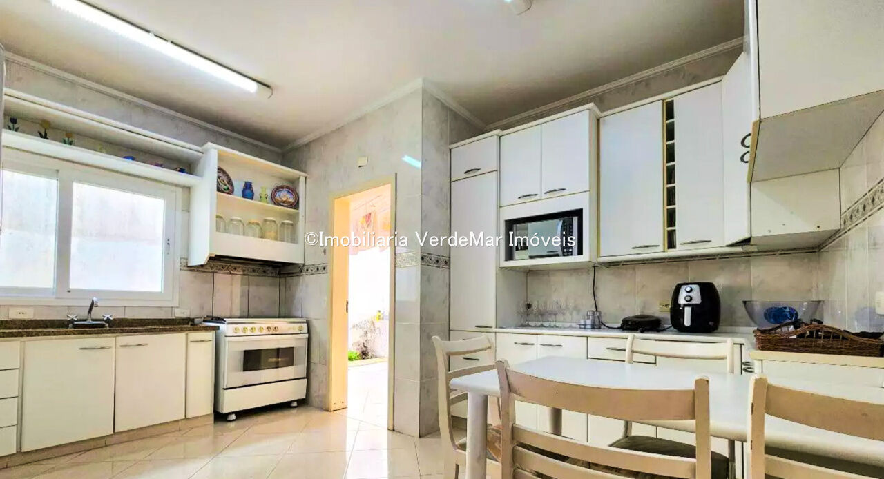 Sobrado à venda no Jardim Acapulco na Praia de Pernambuco no Guarujá, mobiliada com 5 suítes sendo a máster com closet, sala 2 ambientes com varanda integrada e pé direito duplo, lavabo, sala intima no piso superior, cozinha com armários, lavanderia, e suíte de empregada.