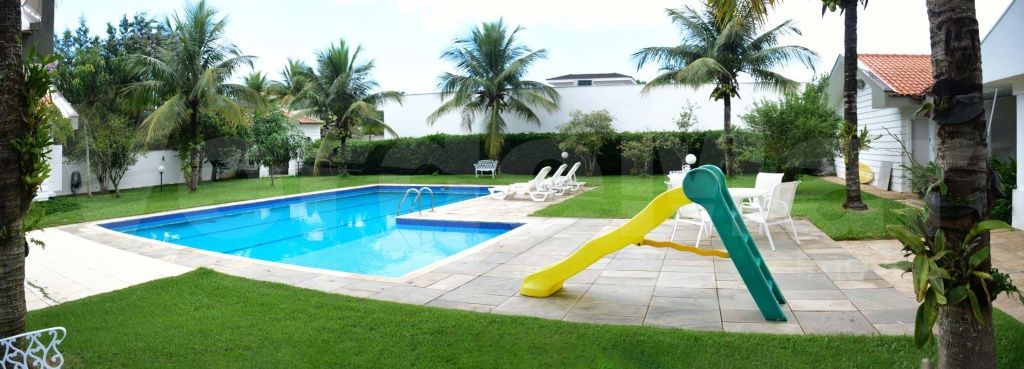 Lazer com amplo jardim, piscina e espaço gourmet com churrasqueira.