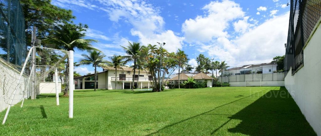 Lazer com amplo jardim, piscina, quiosque com churrasqueira, sala de jogos e campo de futebol.