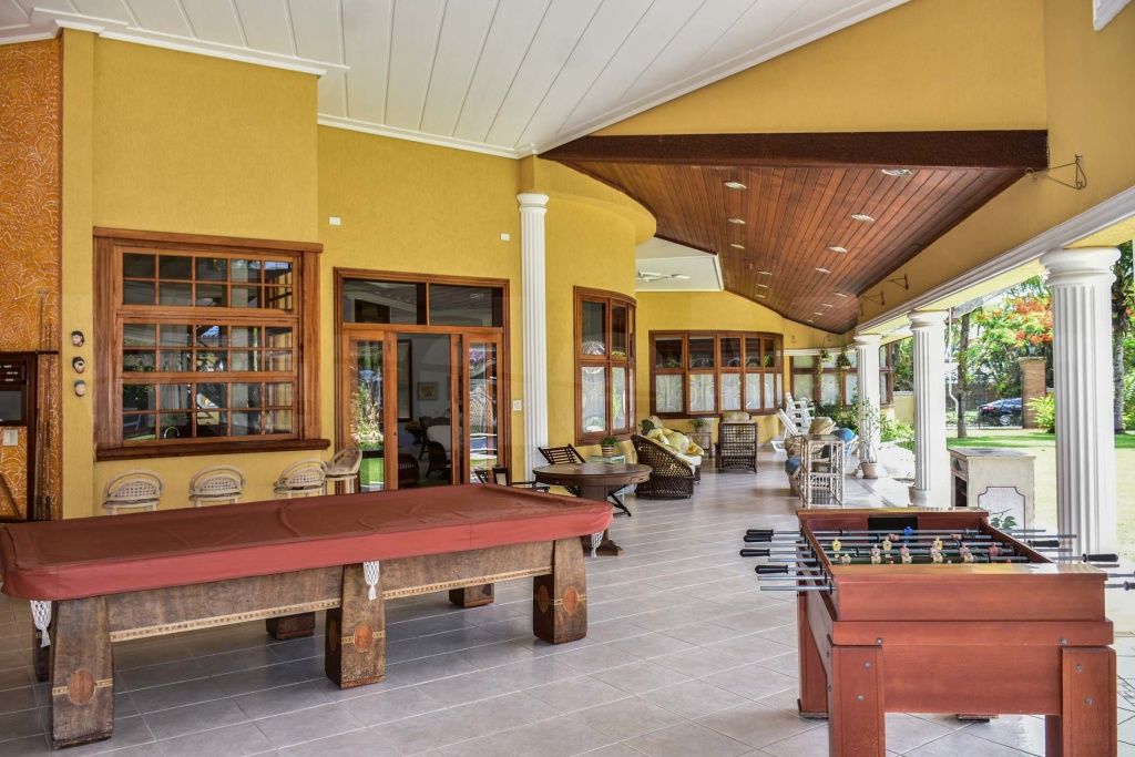 Lazer com amplo jardim e pergolado, piscina com cascata e hidromassagem, sala de jogos e espaço gourmet com churrasqueira.