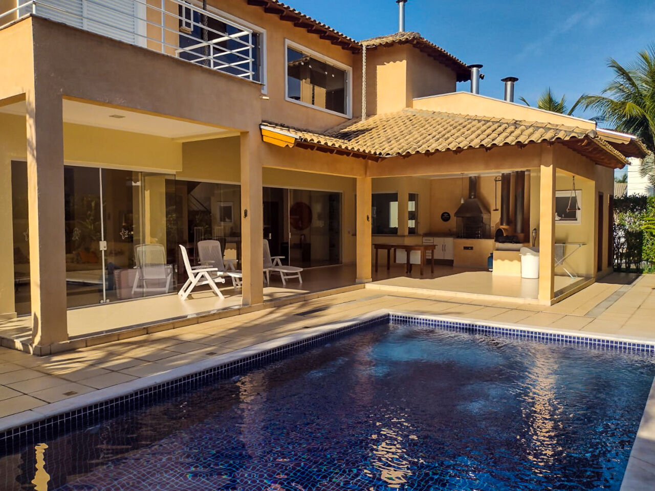 Lazer com piscina e terraço gourmet com churrasqueira e forno de pizza.