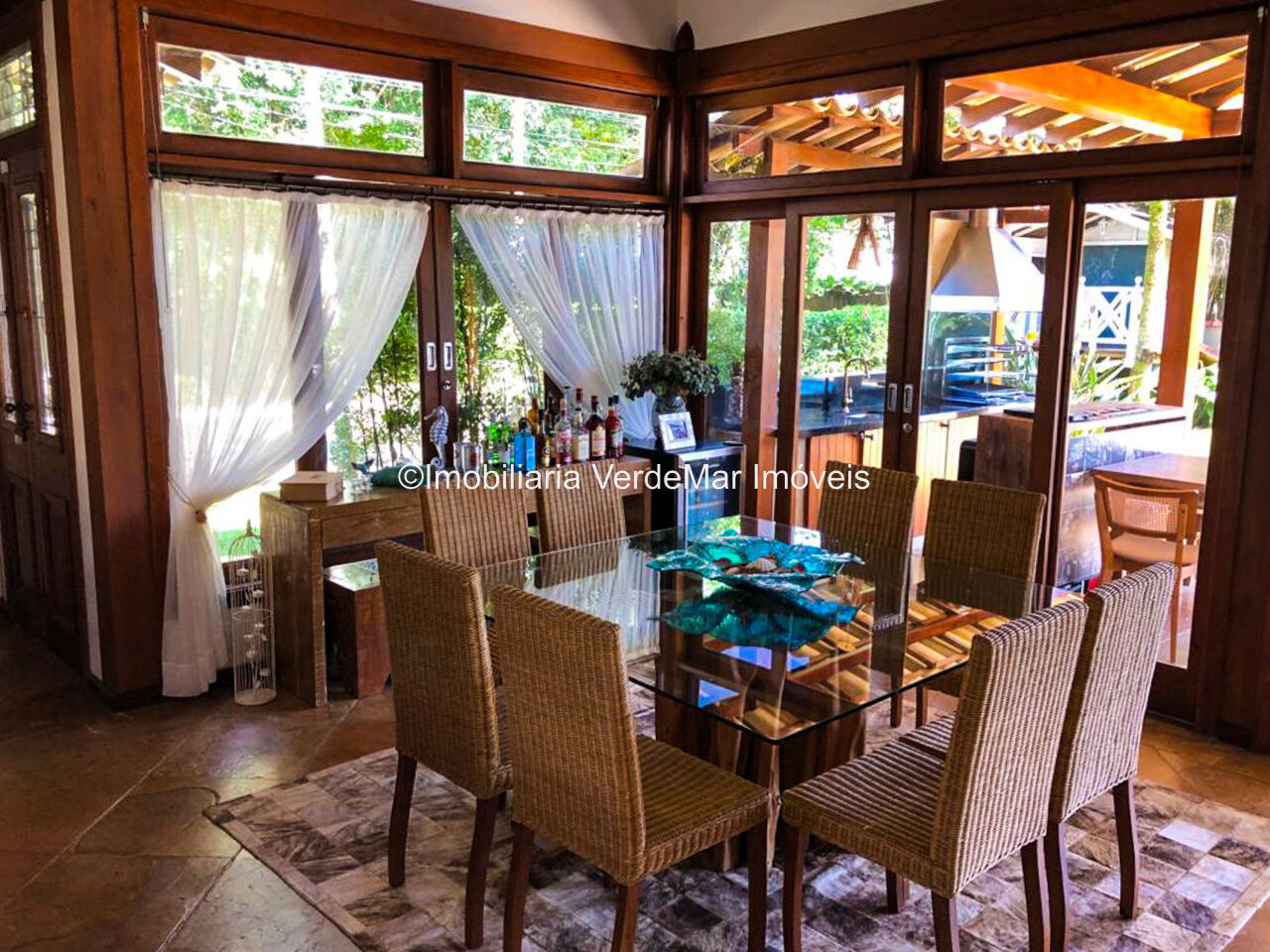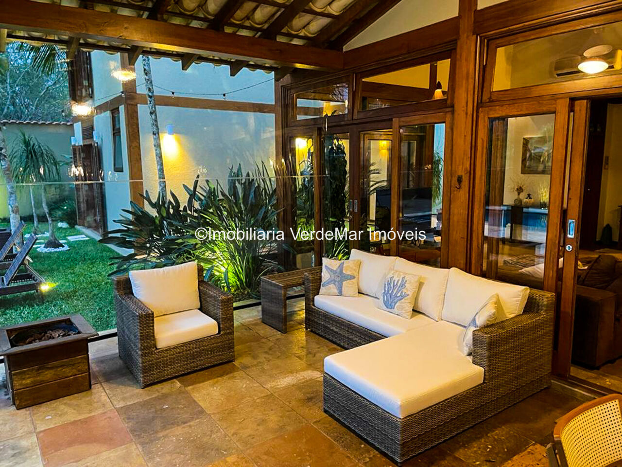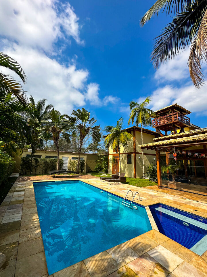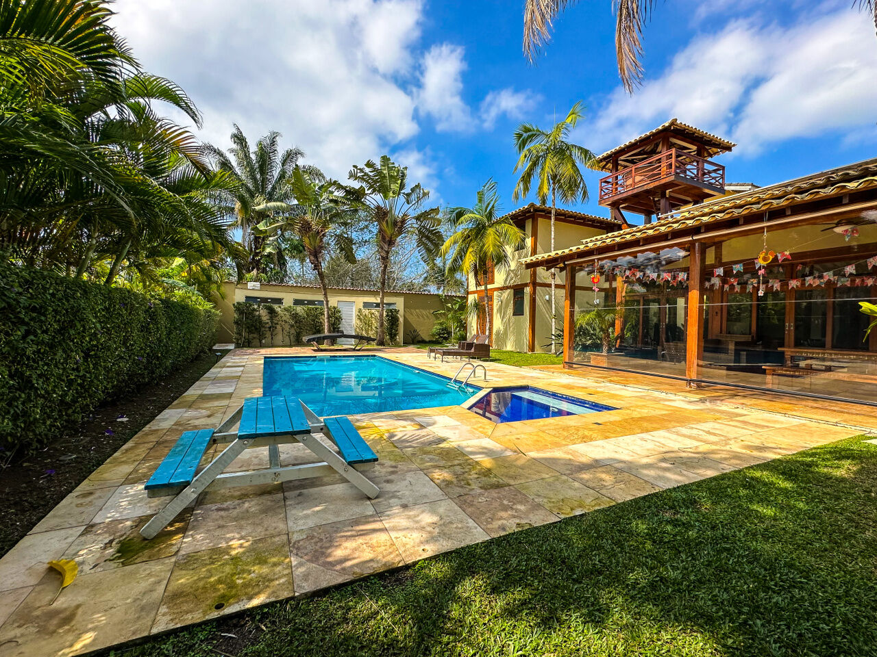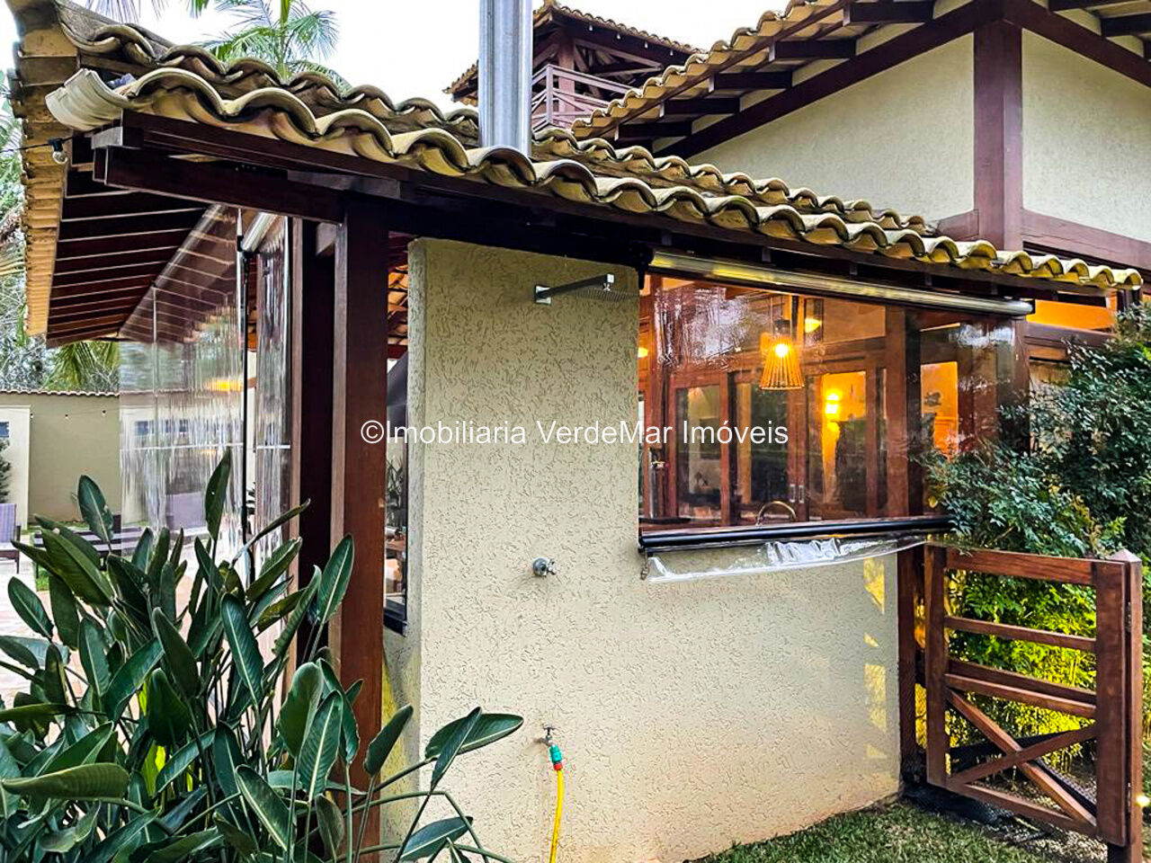 Casa à venda em condomínio na praia de Pernambuco no Guarujá, com 4 suítes, sala para 2 ambientes com terraço mobiliável, jardim interno, lavabo, cozinha americana planejada, área de serviços e dependência de empregada.
