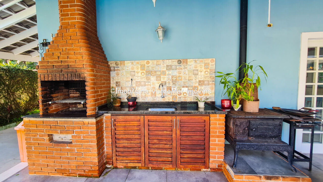 Lazer com piscina e ducha, jardim e varanda com churrasqueira e fogão à lenha.
