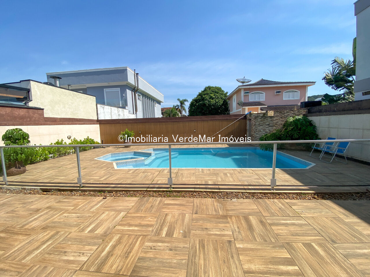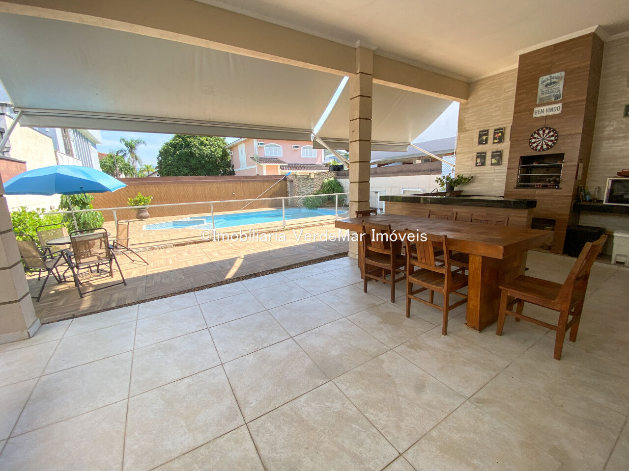 Lazer conta com jardim, piscina e varanda com churrasqueira .