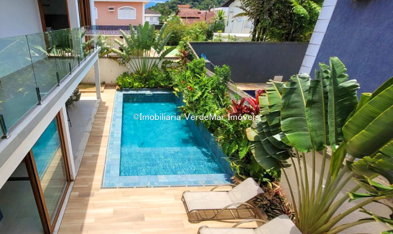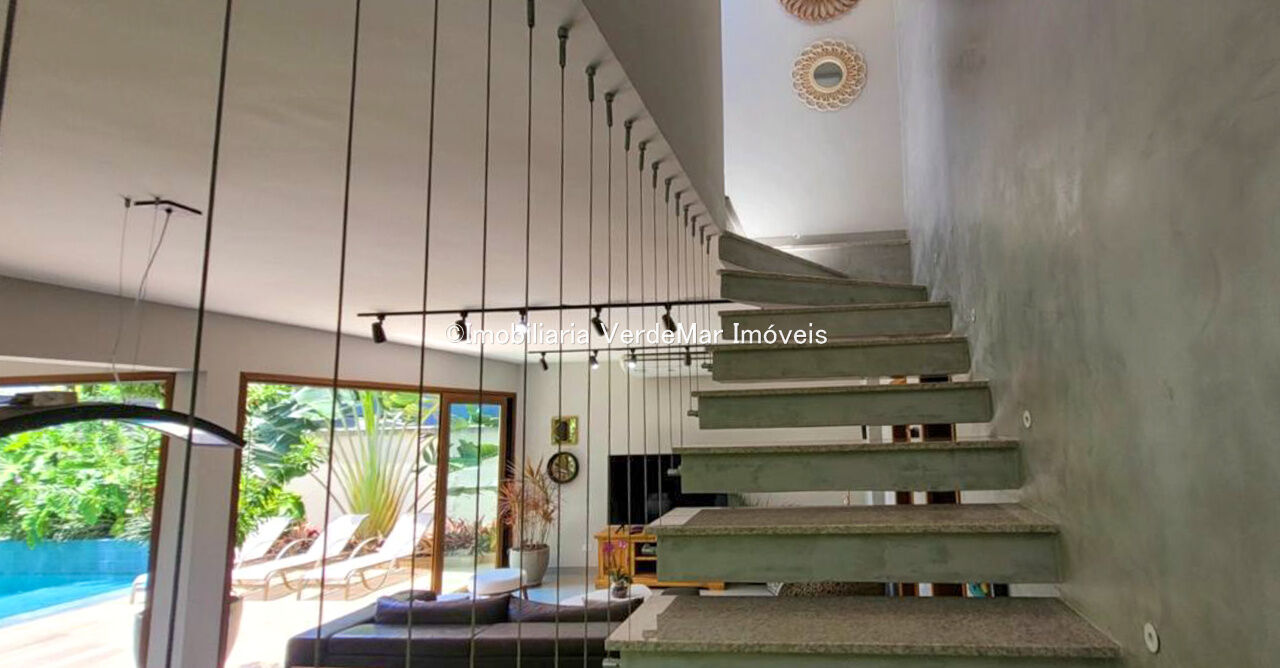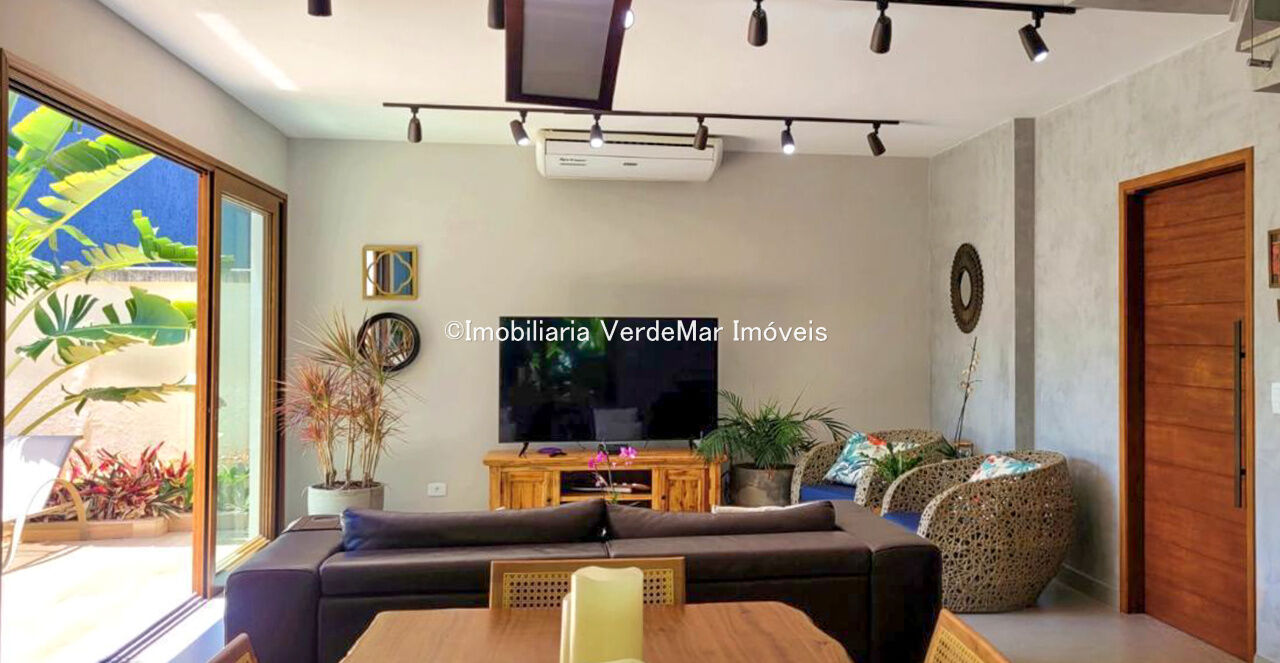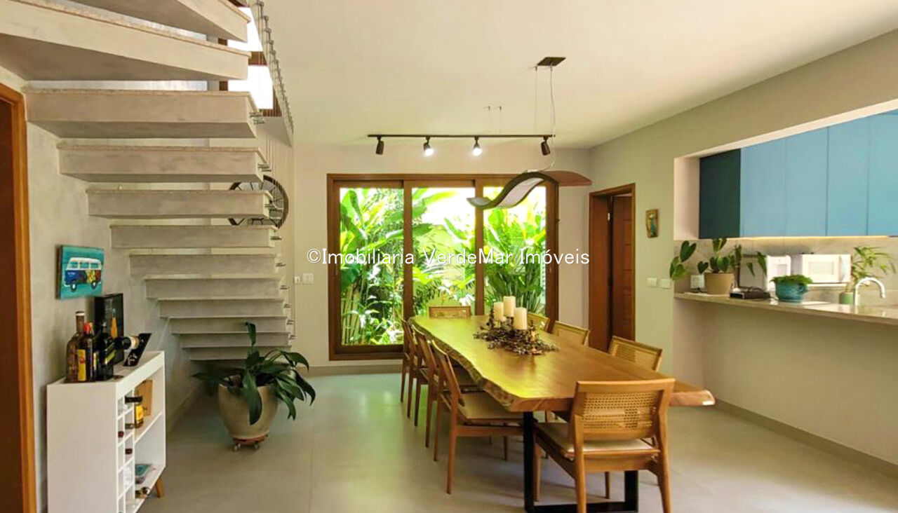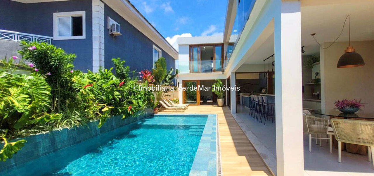 Sobrado com arquitetura contemporânea à venda no Condomínio Pernambuco 2 na praia de Pernambuco em Guarujá, casa com 5 suítes, todas com ar condicionado, sala para 2 ambientes e varanda integrada, cozinha planejada, 6 banheiros, lavabo e área de serviço.