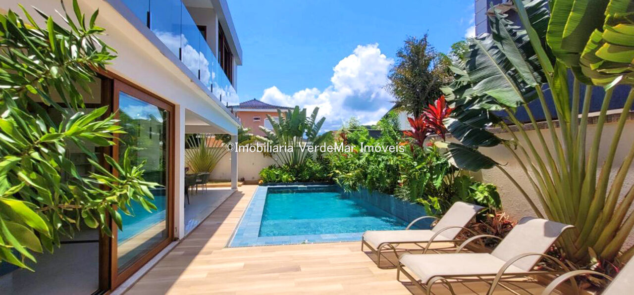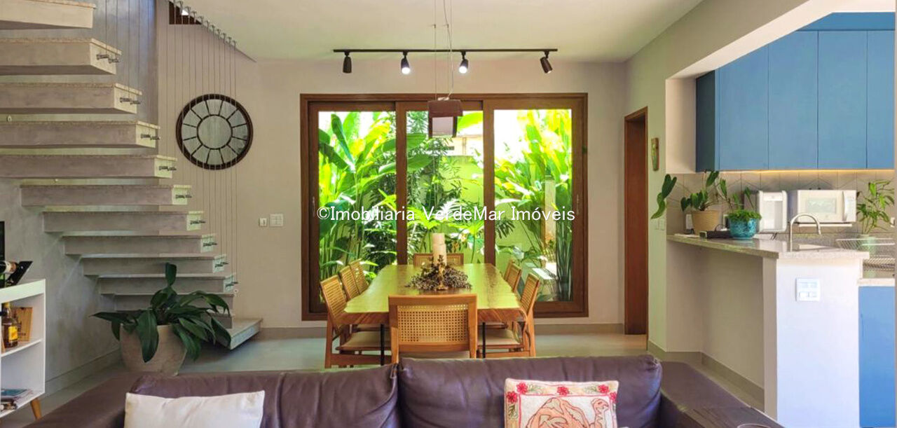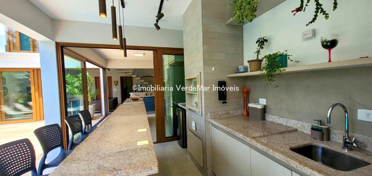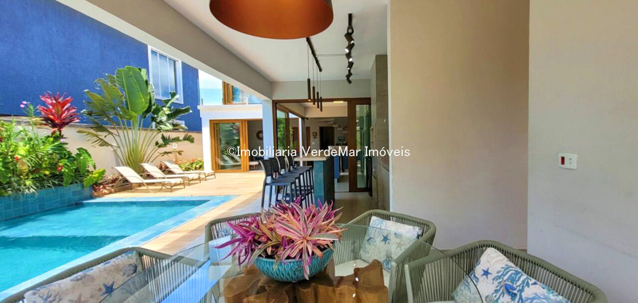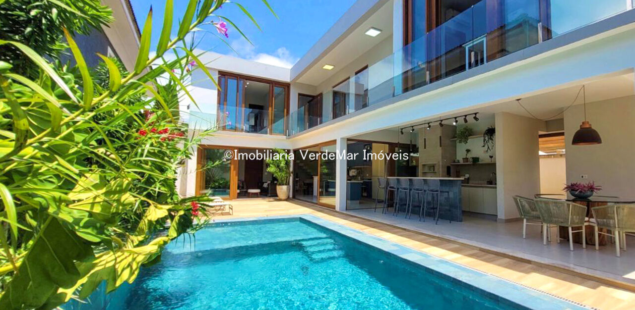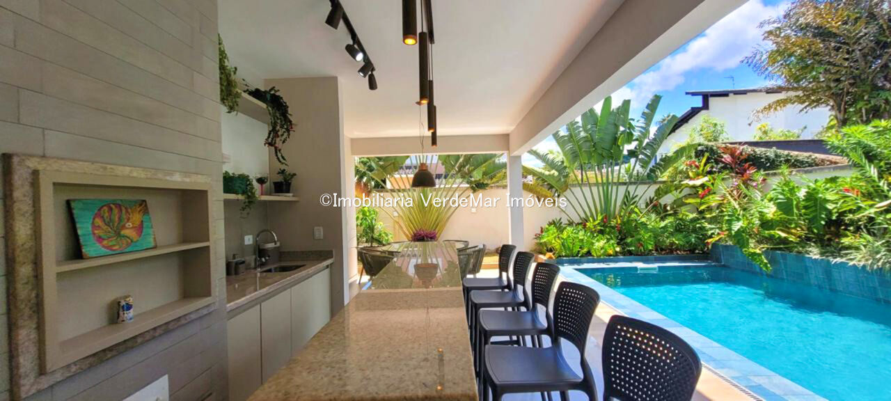 Sobrado com arquitetura contemporânea à venda no Condomínio Pernambuco 2 na praia de Pernambuco em Guarujá, casa com 5 suítes, todas com ar condicionado, sala para 2 ambientes e varanda integrada, cozinha planejada, 6 banheiros, lavabo e área de serviço.