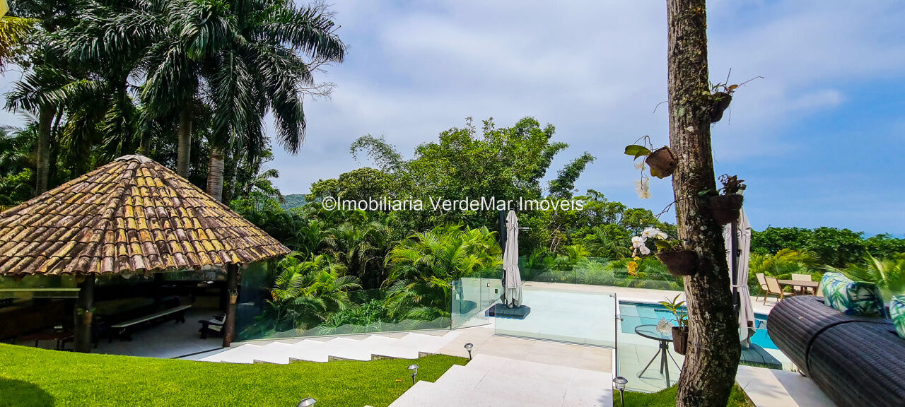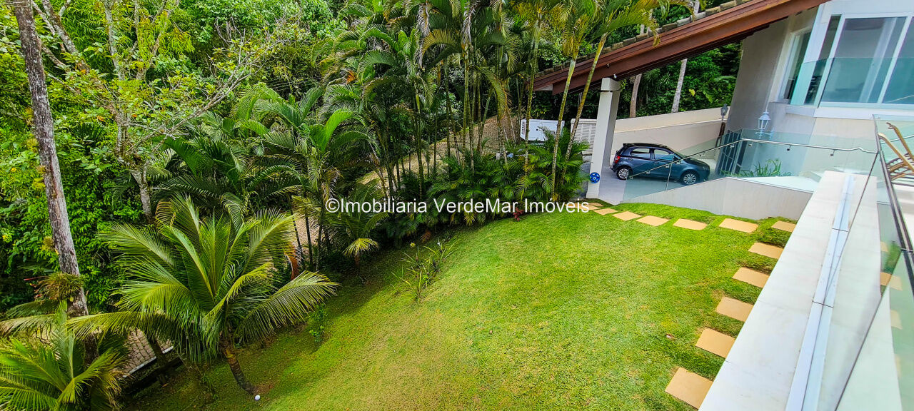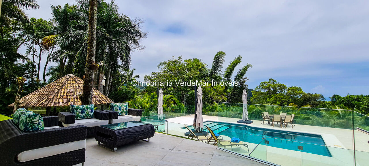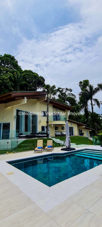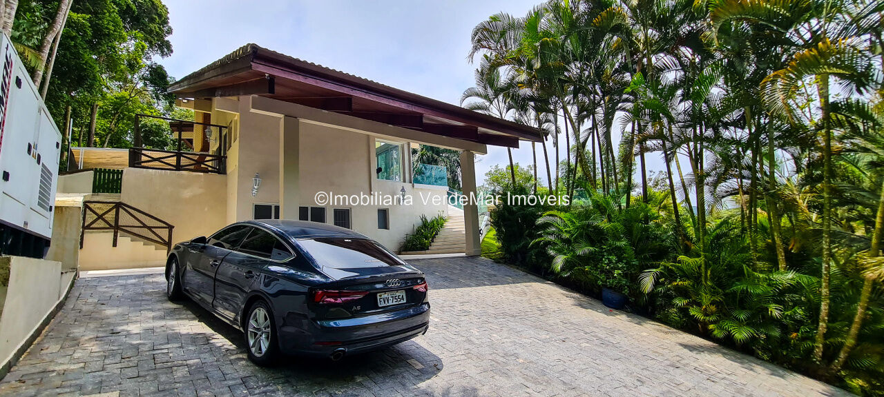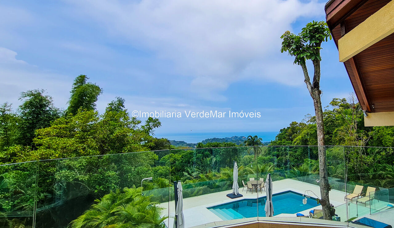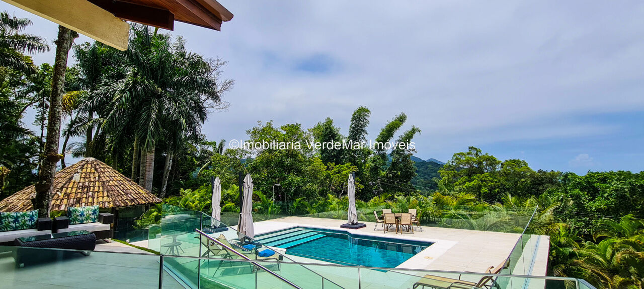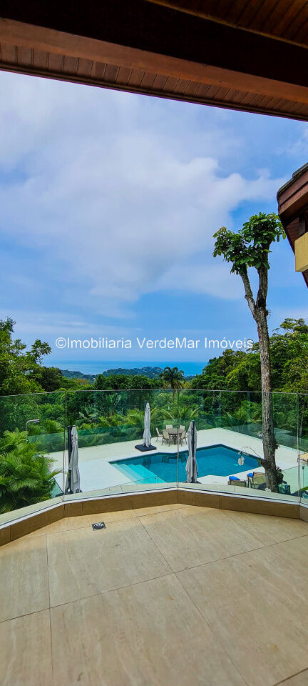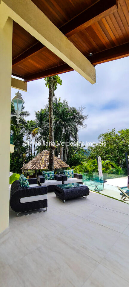 Casa À VENDA na praia de São Pedro Guarujá, integrada à mata e no fim de um lote, a casa quase não tem vizinhos sendo privativa e silenciosa, com 6quartos sendo 5 suítes, sala para 3 ambientes com varanda, living com pé direito duplo, cozinha, americana planejada, despensa, lavanderia e dependência de empregados.