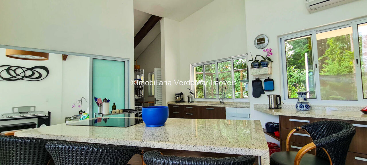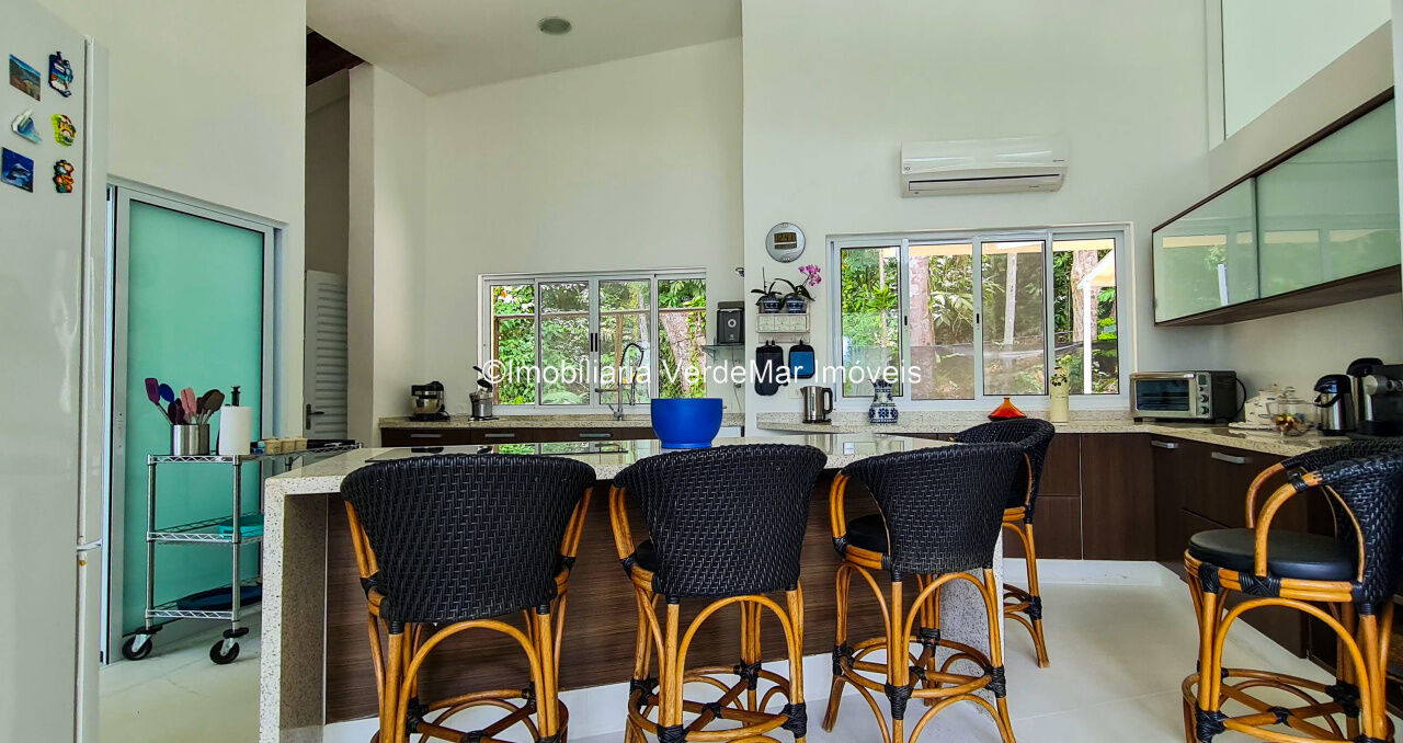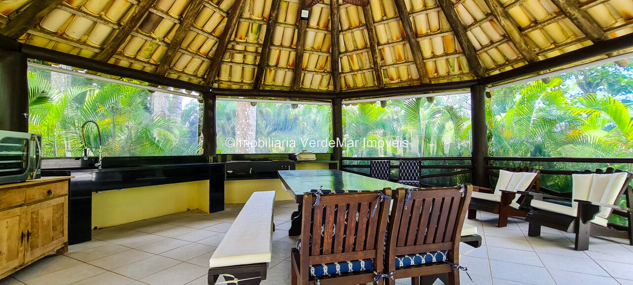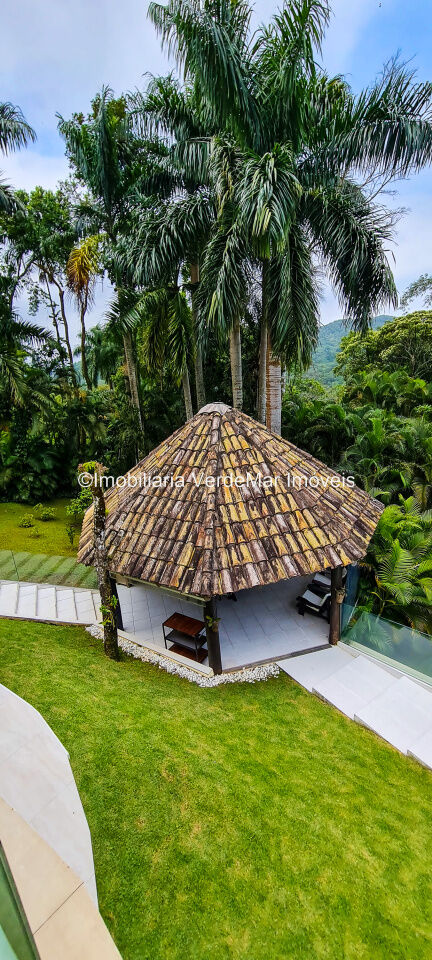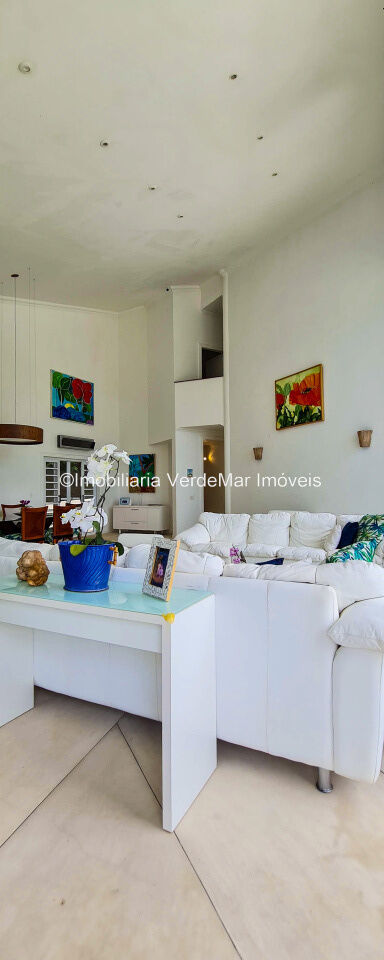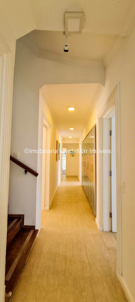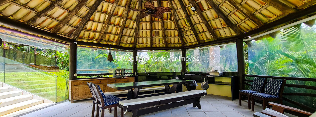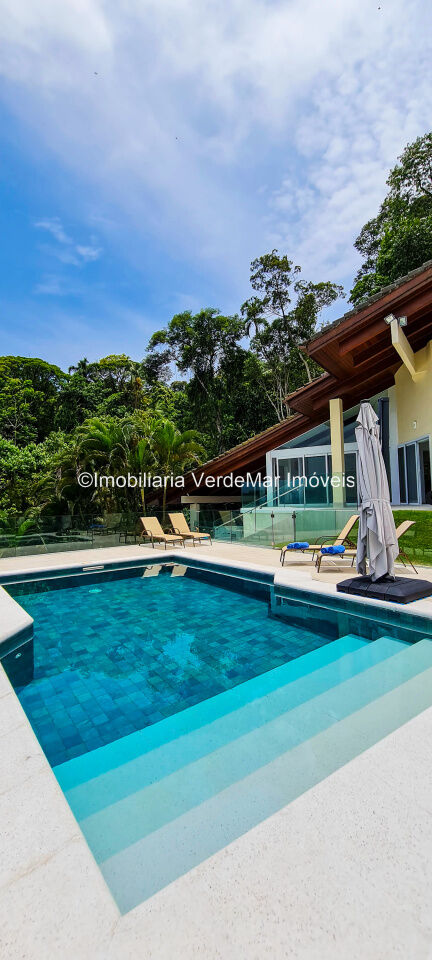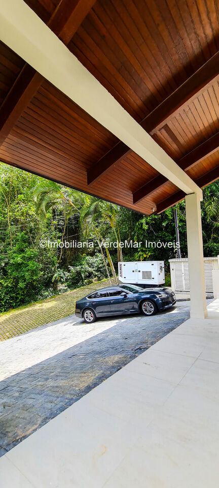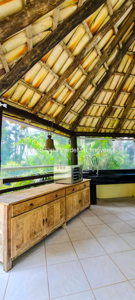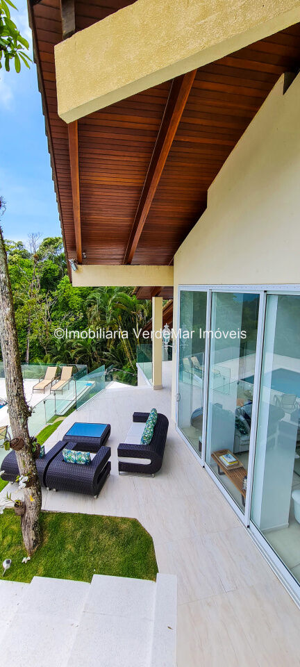 Casa À VENDA na praia de São Pedro Guarujá, integrada à mata e no fim de um lote, a casa quase não tem vizinhos sendo privativa e silenciosa, com 6quartos sendo 5 suítes, sala para 3 ambientes com varanda, living com pé direito duplo, cozinha, americana planejada, despensa, lavanderia e dependência de empregados.