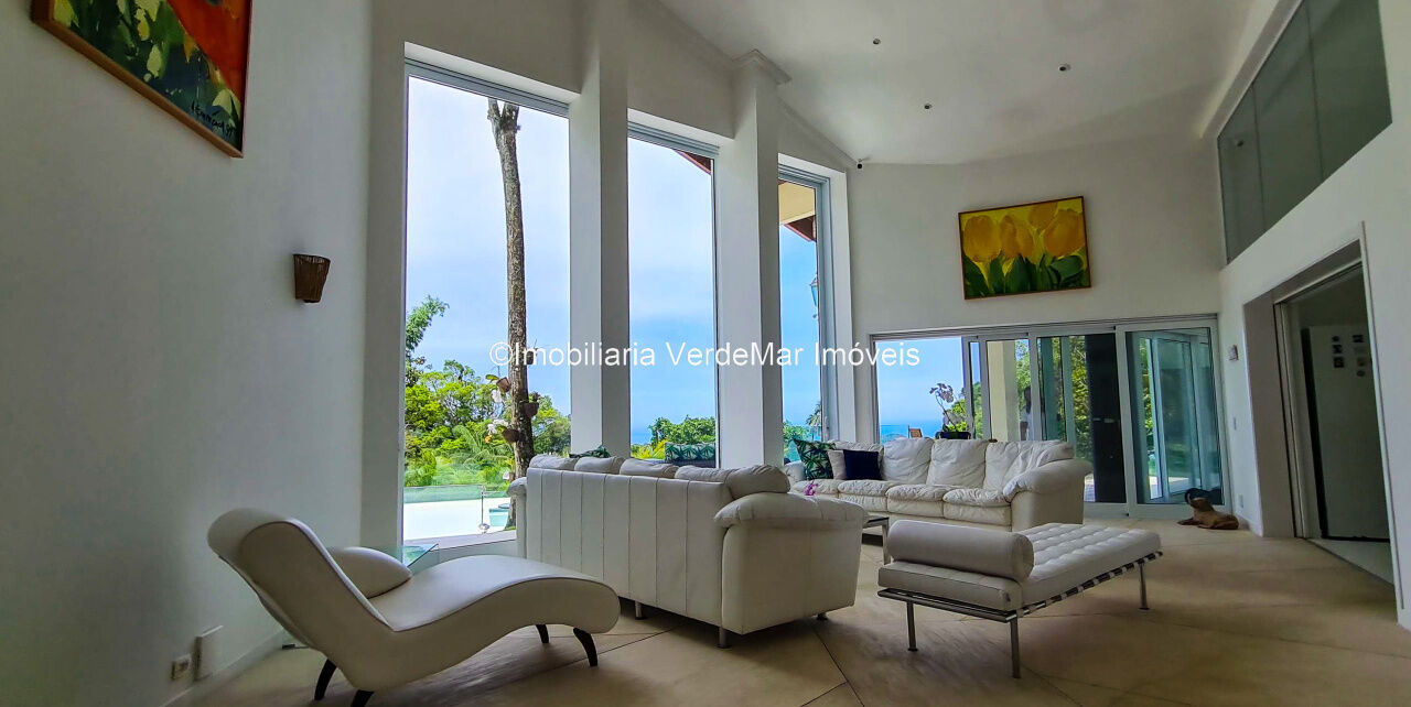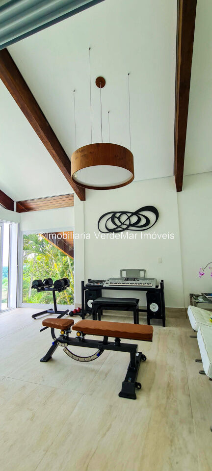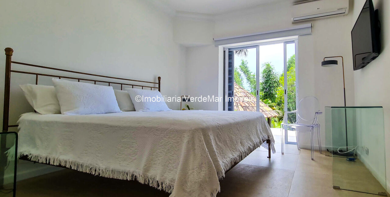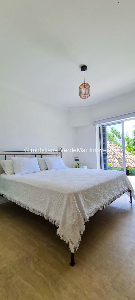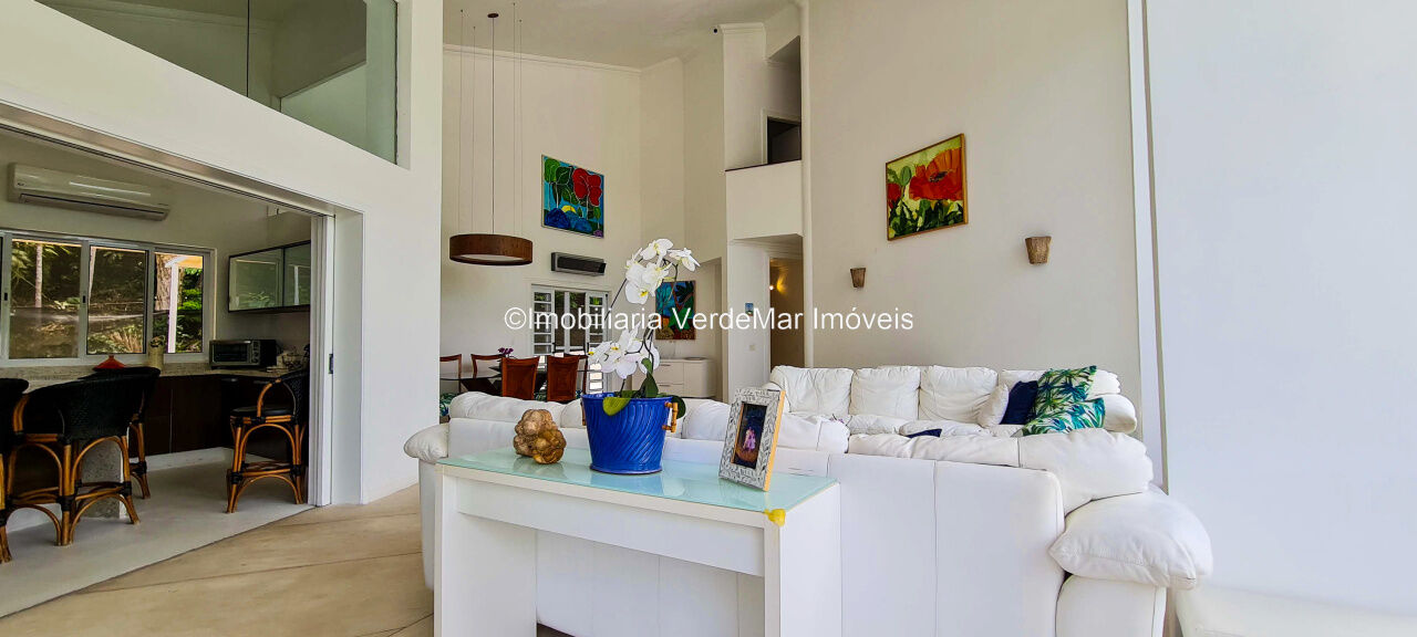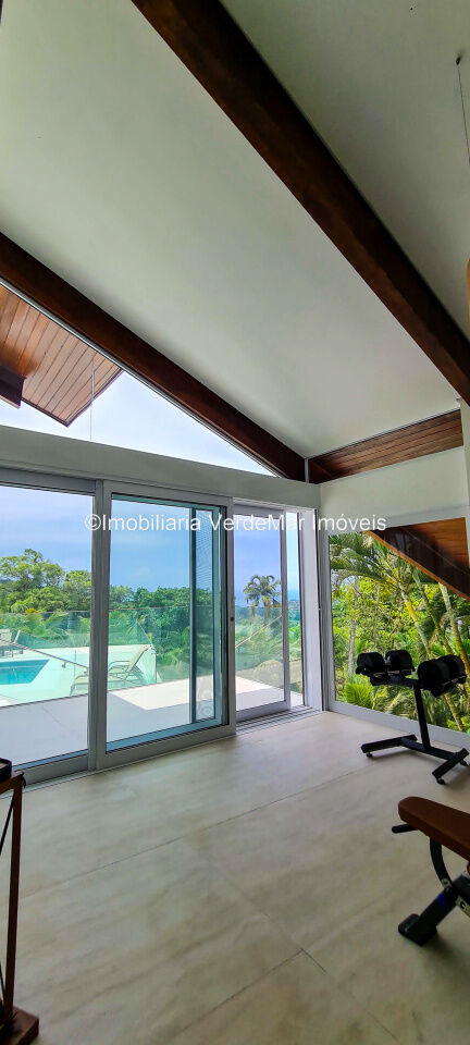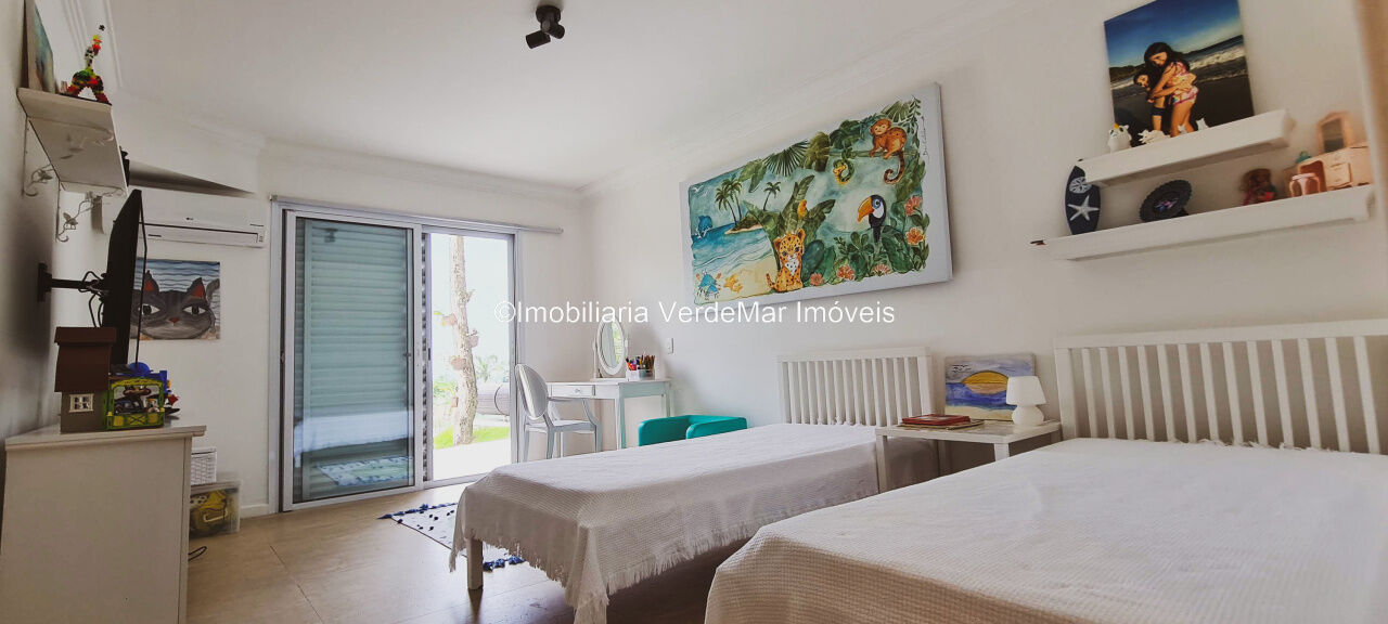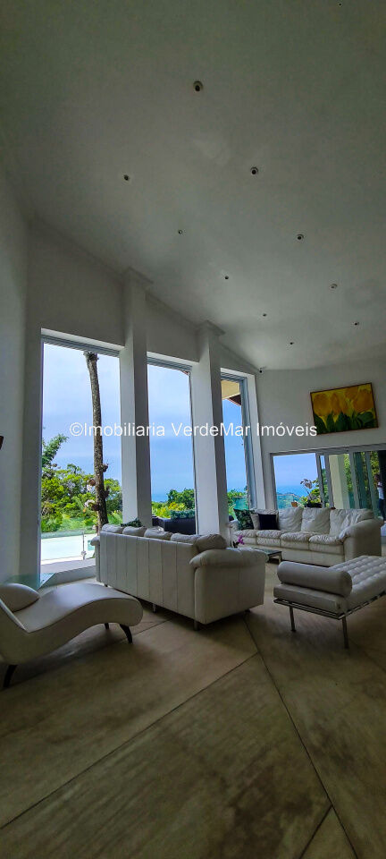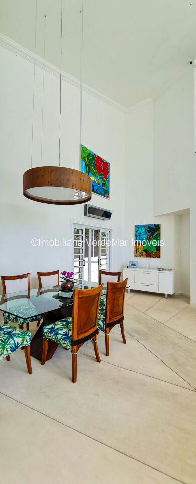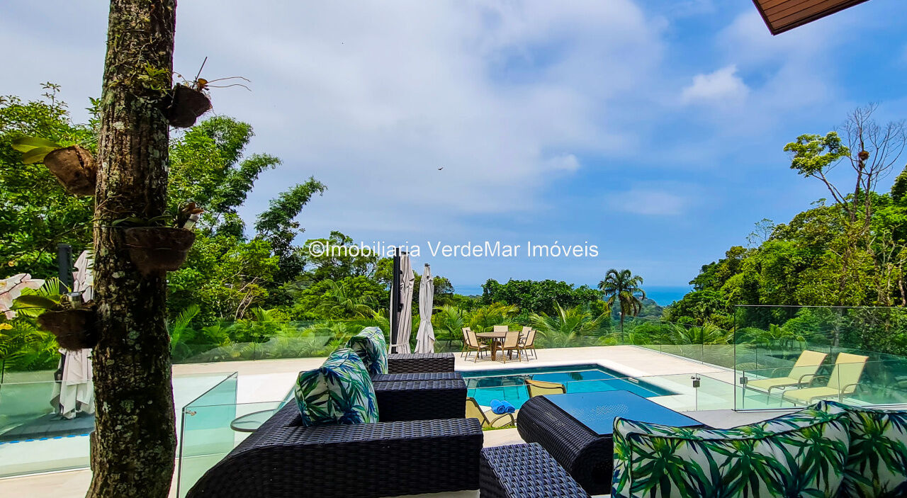 Casa À VENDA na praia de São Pedro Guarujá, integrada à mata e no fim de um lote, a casa quase não tem vizinhos sendo privativa e silenciosa, com 6quartos sendo 5 suítes, sala para 3 ambientes com varanda, living com pé direito duplo, cozinha, americana planejada, despensa, lavanderia e dependência de empregados.