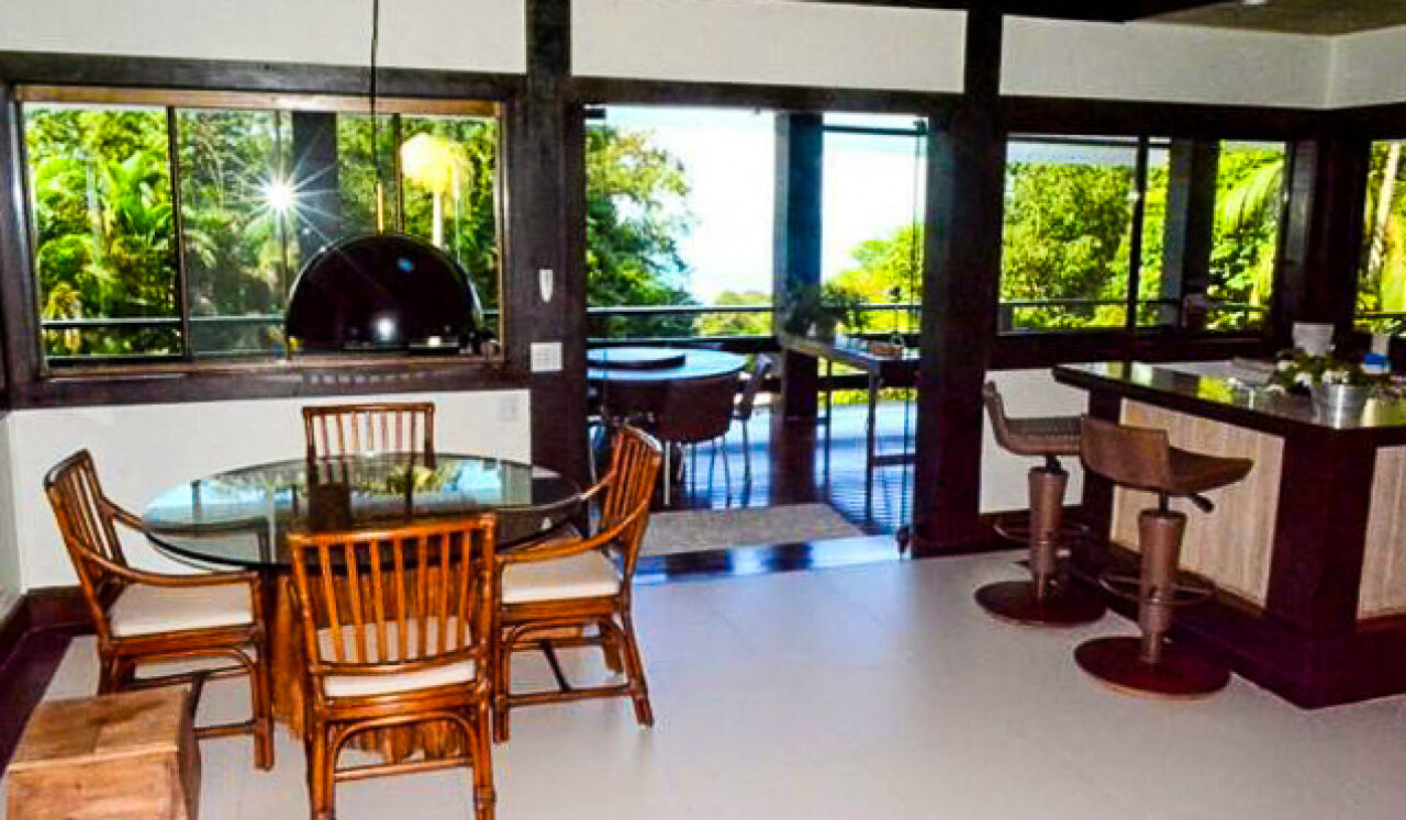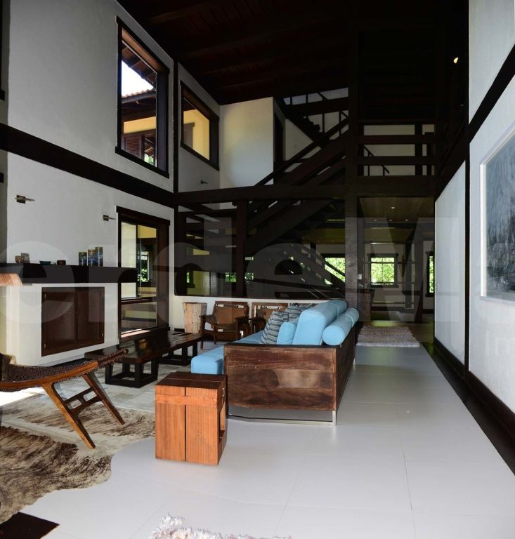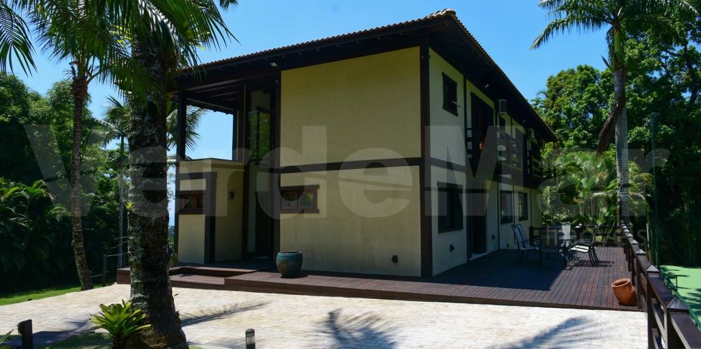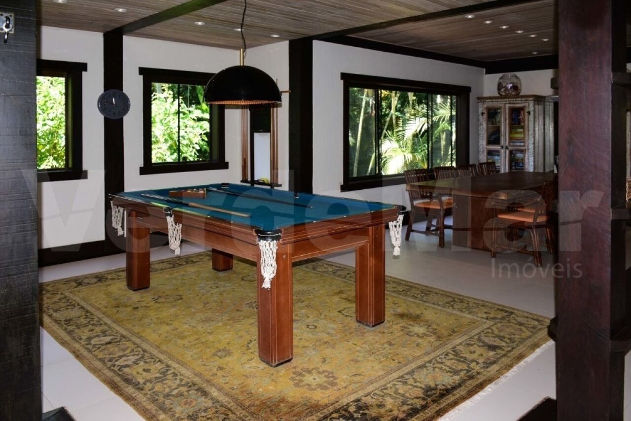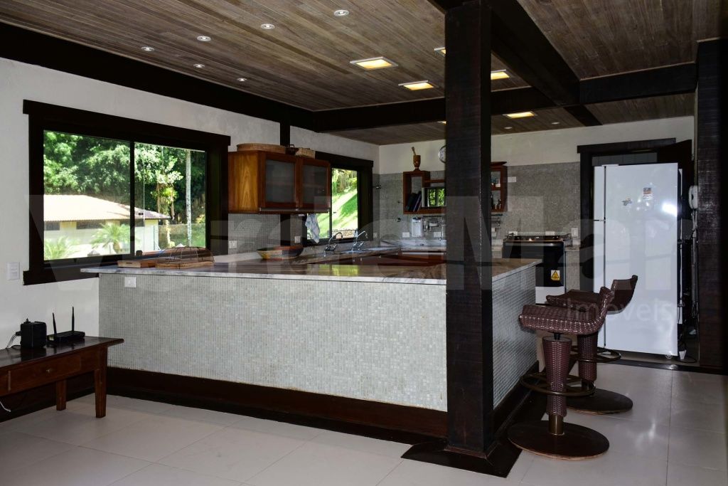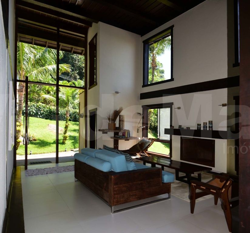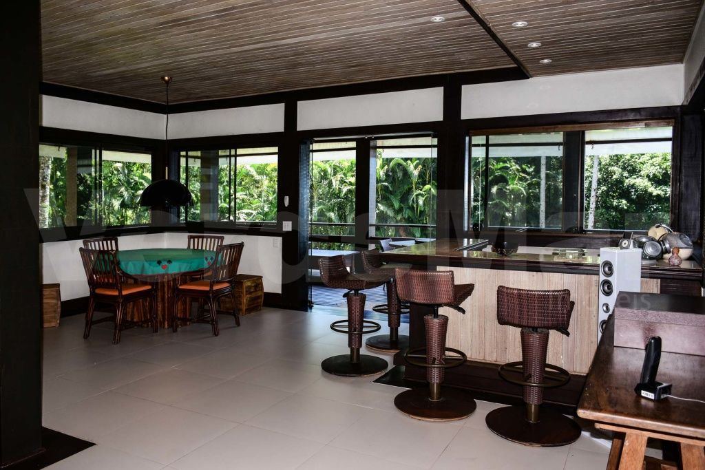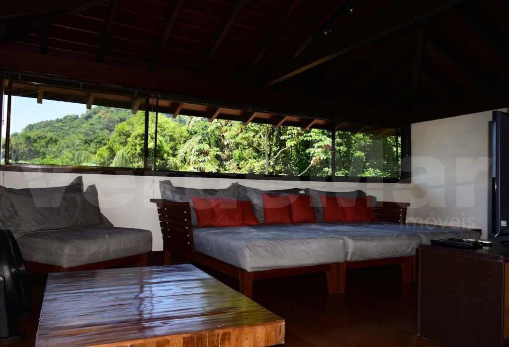 Casa à venda no Condomínio Tijucopava em Guarujá, mobiliada e decorada, com 05 dormitórios sendo 04 suítes, sala de estar com pé direito duplo, lareira, lavabo e ampla varanda mobiliada, living com mesas de jogos e bar, sala de jantar, home theater, cozinha americana com armários de madeira maciça, despensa, casa de caseiro completa e reservatório d´água.