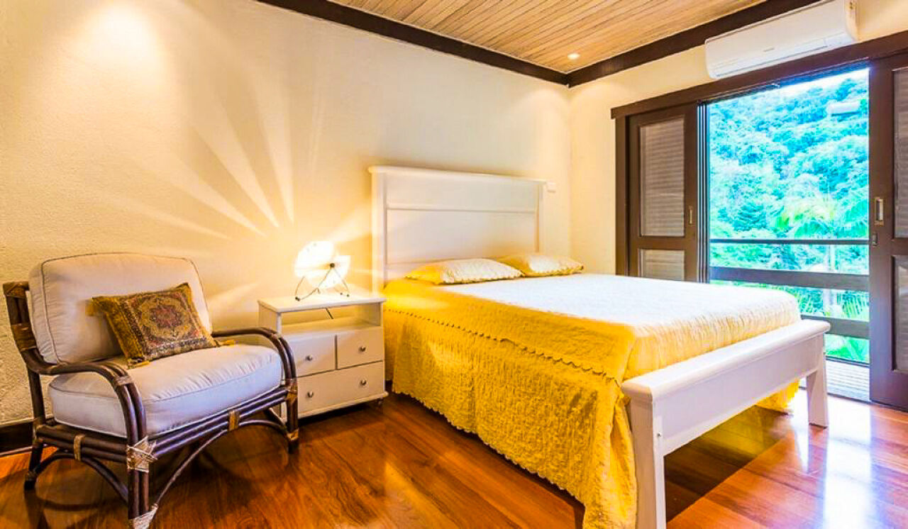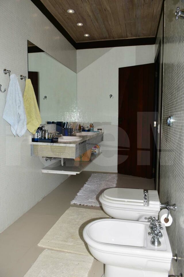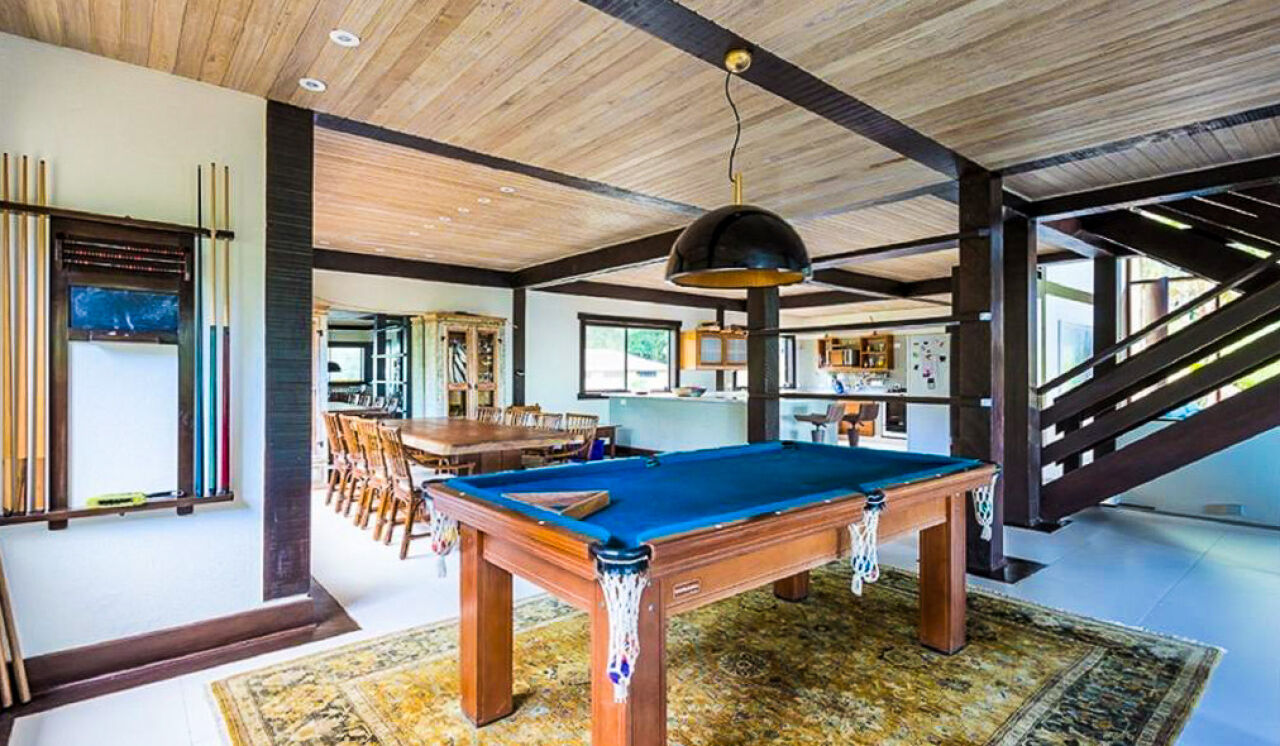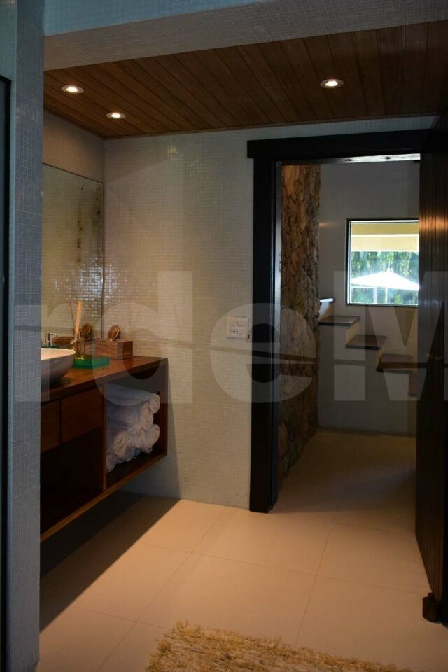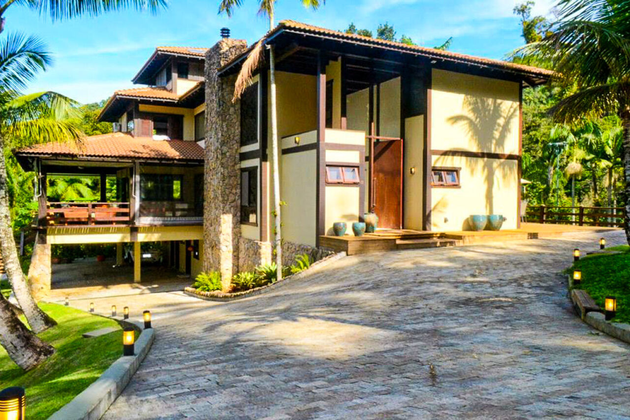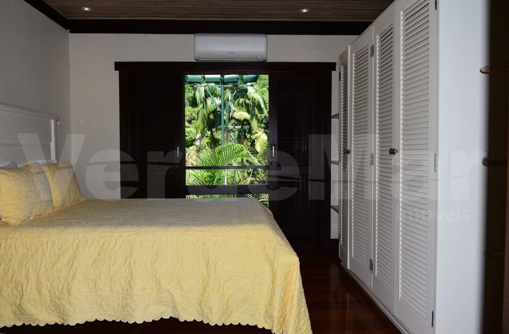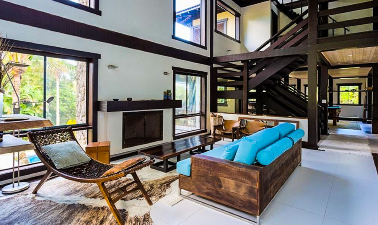 Casa à venda no Condomínio Tijucopava em Guarujá, mobiliada e decorada, com 05 dormitórios sendo 04 suítes, sala de estar com pé direito duplo, lareira, lavabo e ampla varanda mobiliada, living com mesas de jogos e bar, sala de jantar, home theater, cozinha americana com armários de madeira maciça, despensa, casa de caseiro completa e reservatório d´água.