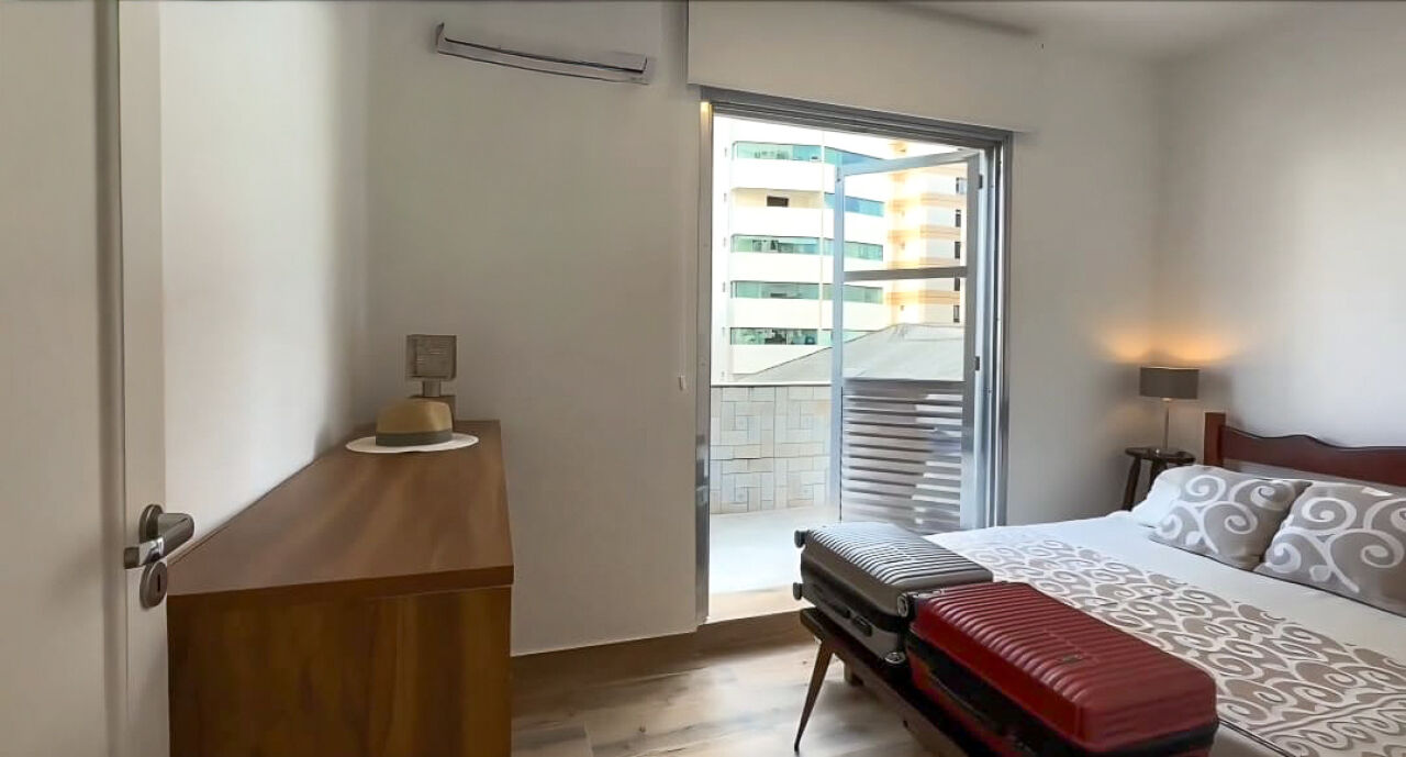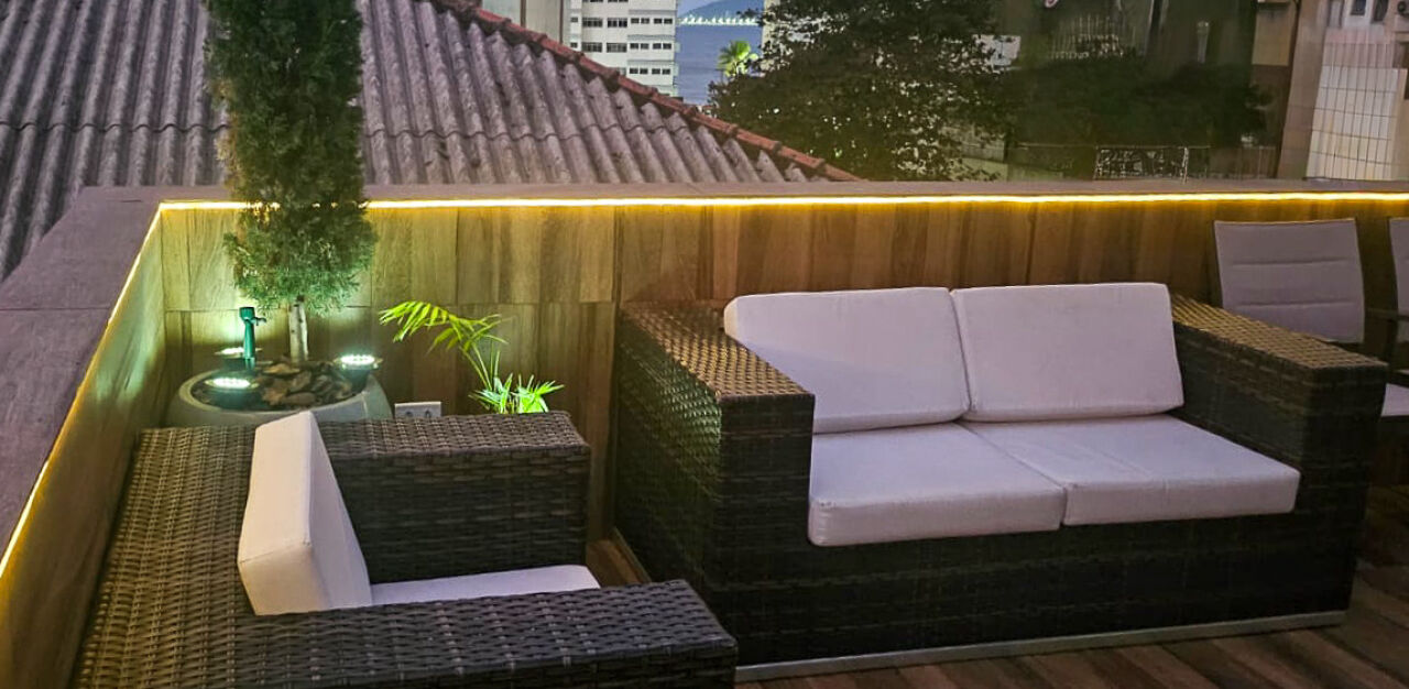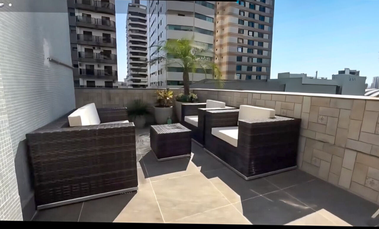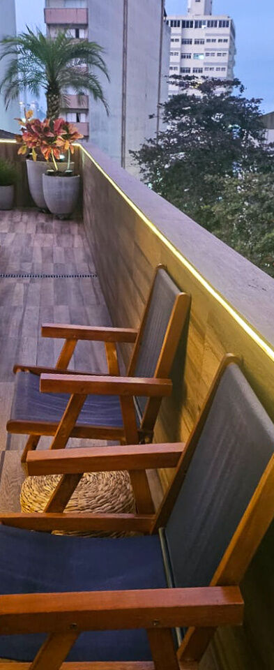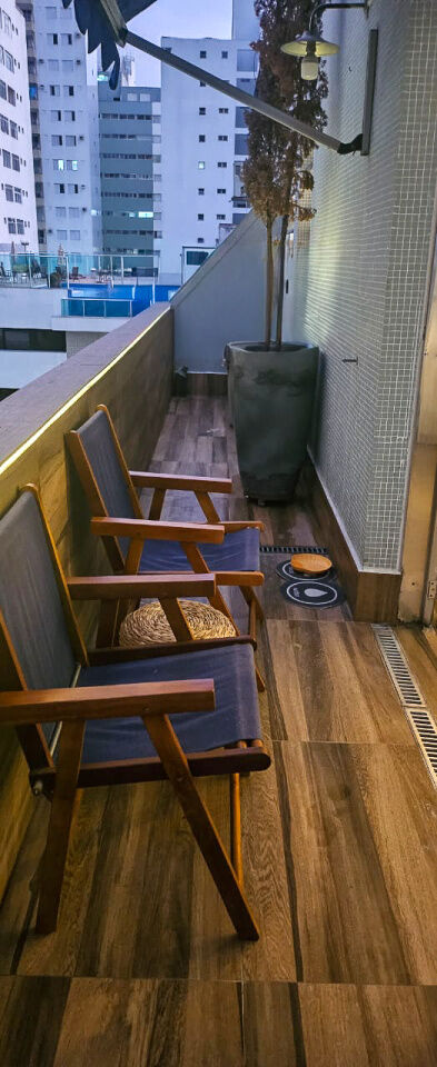 Box de vidro nos 2 banheiros, armários nos quartos, sala, cozinha americana, banheiros, mesas e 12 cadeiras de jardim, 3 sofás de vime com almofadas na área externa, iluminação de Led em toda varanda, 2 geladeiras, forno e fogão elétrico, lava-louças, micro-ondas, cafeteira elétrica, depósito, vaga coberta de garagem.