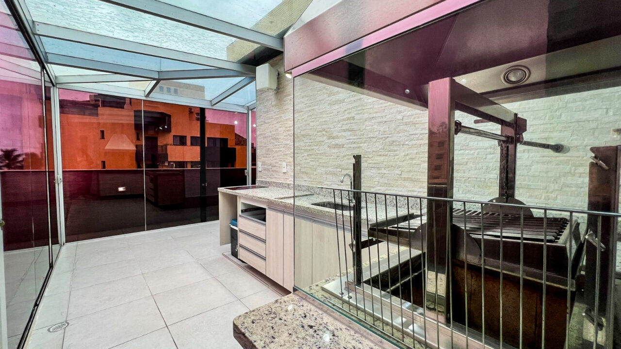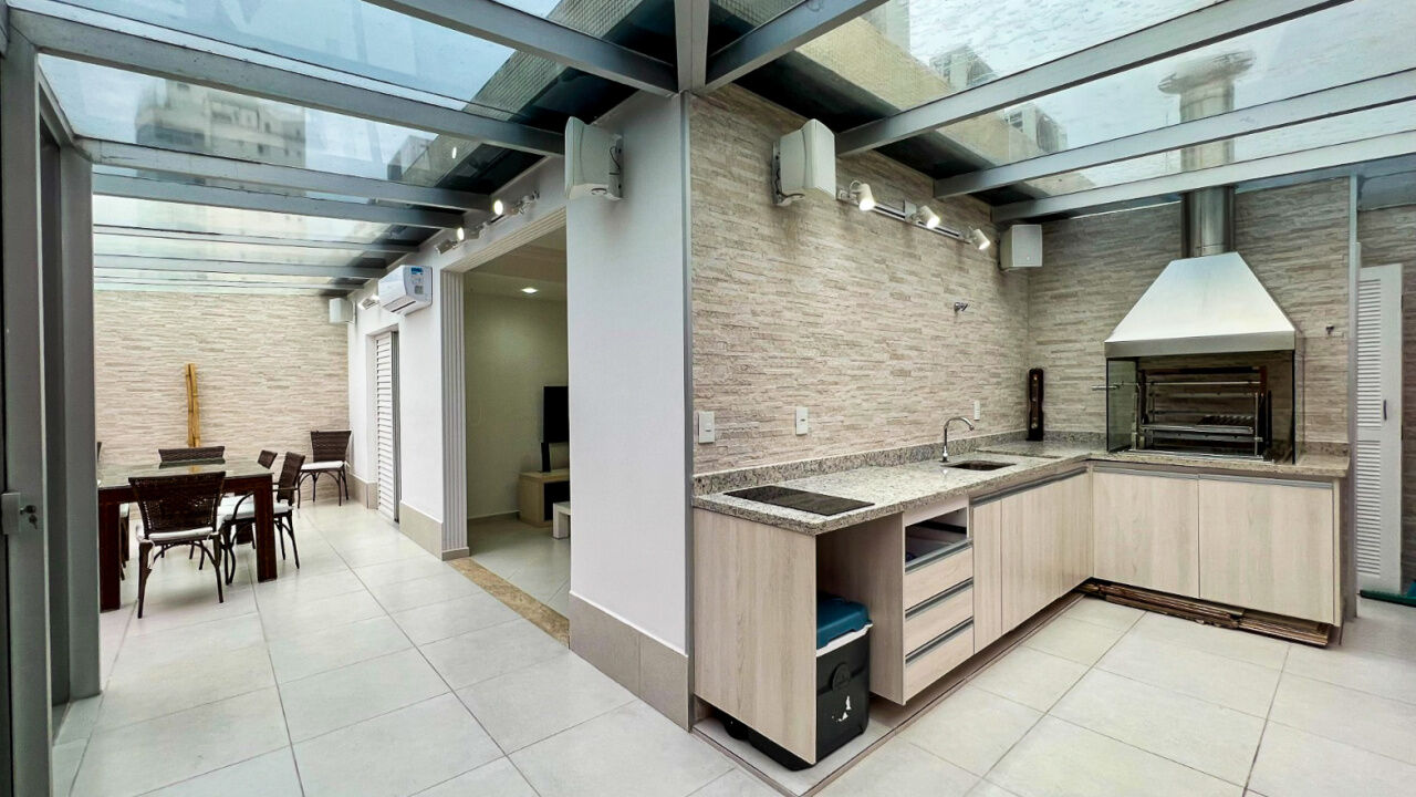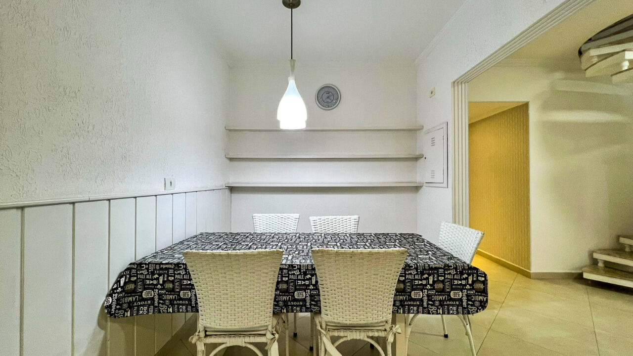 Apartamento cobertura duplex à venda na praia da Enseada Guarujá, 1º pavimento com 2 suítes, sala de estar e jantar integradas com sacada, cozinha com despensa e área de serviços. Piso superior conta com 1 suíte, banheiro e terraço com churrasqueira.