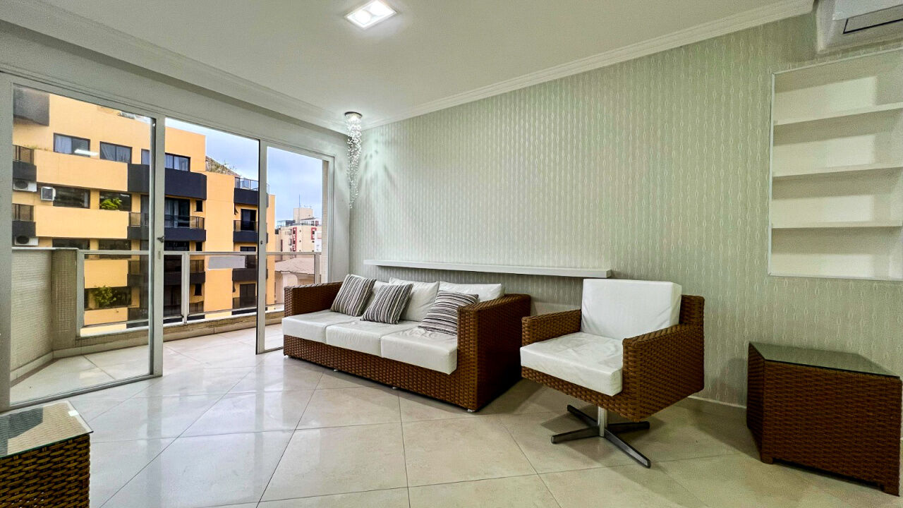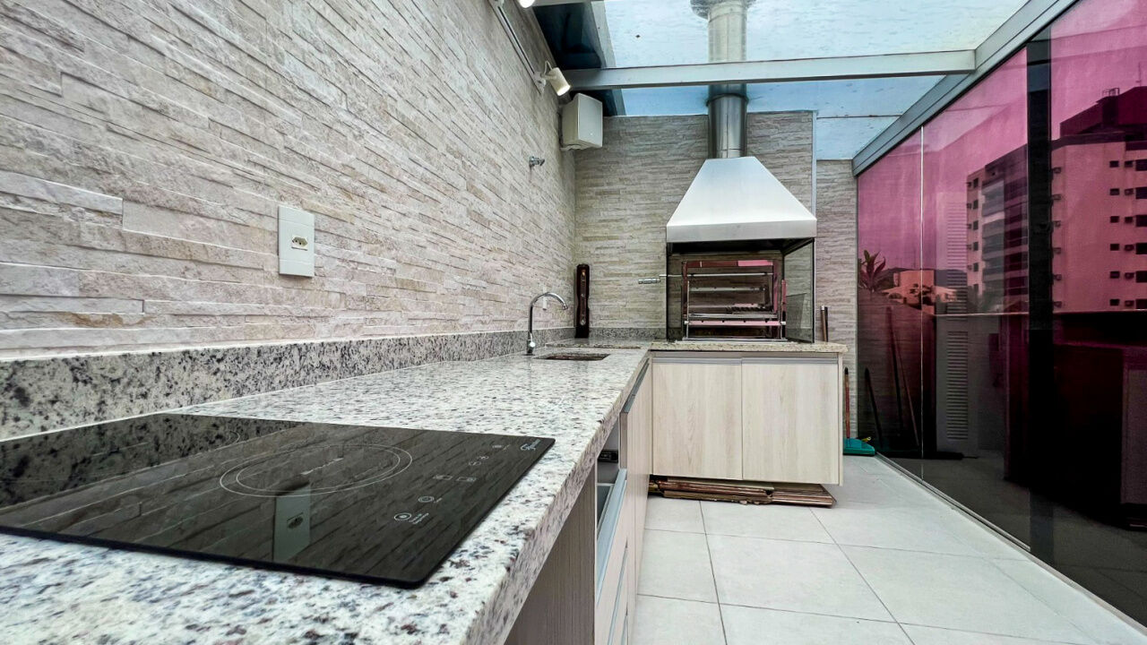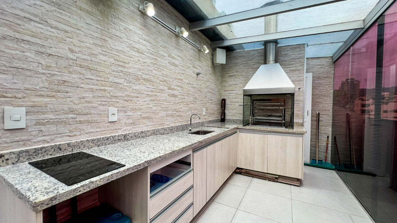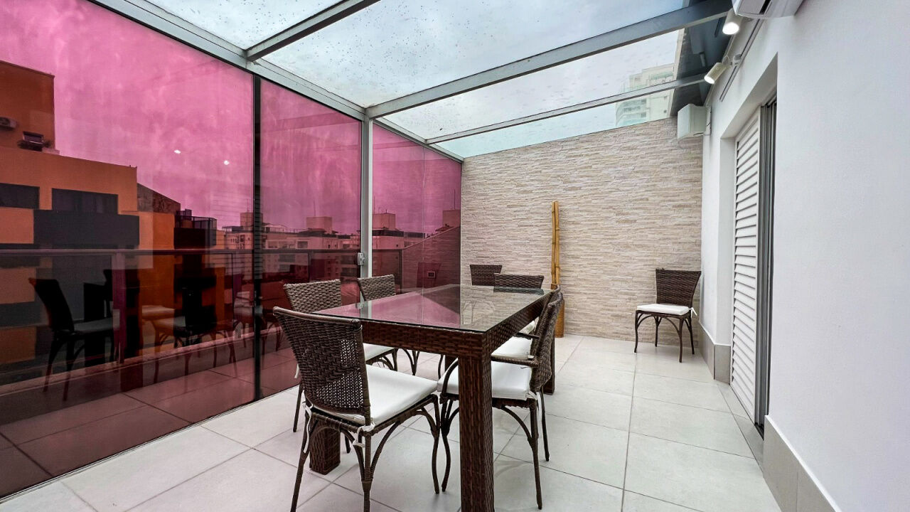 Apartamento cobertura duplex à venda na praia da Enseada Guarujá, 1º pavimento com 2 suítes, sala de estar e jantar integradas com sacada, cozinha com despensa e área de serviços. Piso superior conta com 1 suíte, banheiro e terraço com churrasqueira.