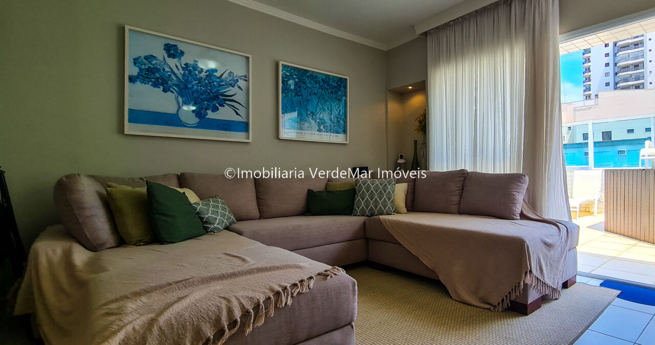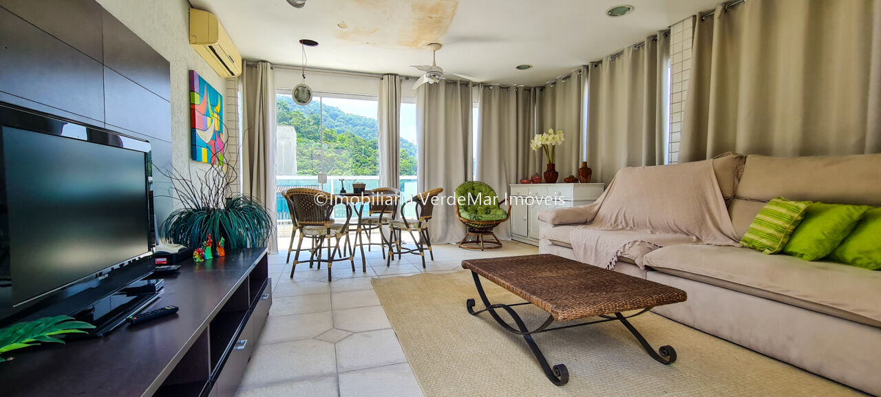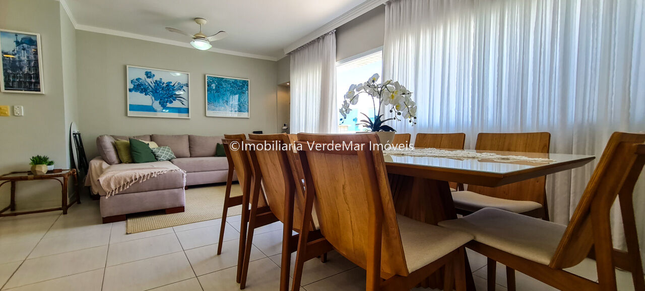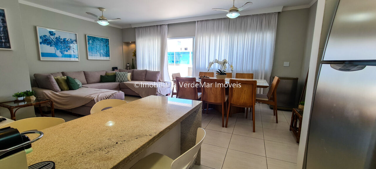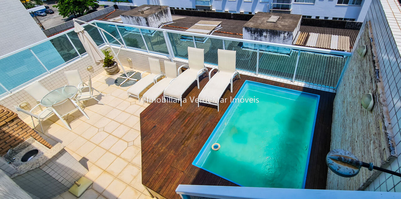 Cobertura duplex à venda na praia da Enseada em Guarujá, com 05 dormitórios ao total sendo 02 suítes, todos com ventilador e ar condicionado, no primeiro piso sala para 02 ambientes integrada com cozinha planejada, área de serviços. No piso superior conta com sala de tv e terraço com piscina.