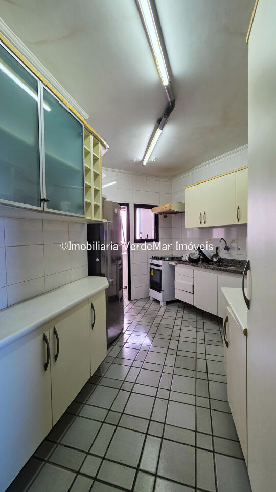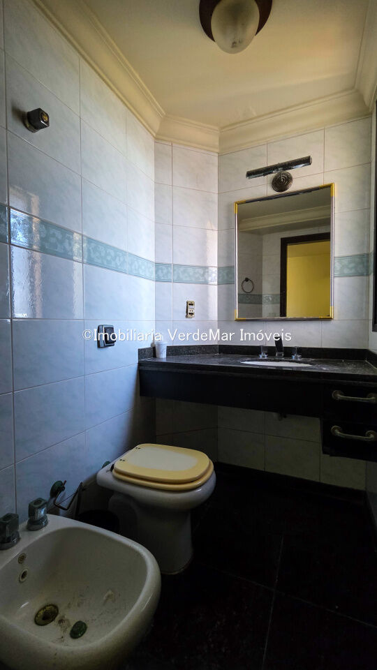 Cobertura triplex com vista ao mar à venda na praia da Enseada, com 3 suítes (todas com varanda), sala de estar, lavabo, sala de jantar, cozinha planejada, e suíte de empregada. No piso superior sala de tv com bar, vestiário, sauna seca e piscina, no terceiro pavimento espaço gourmet com churrasqueira e cozinha auxiliar.