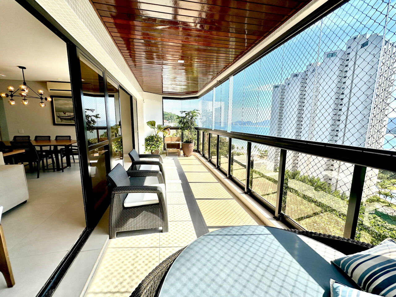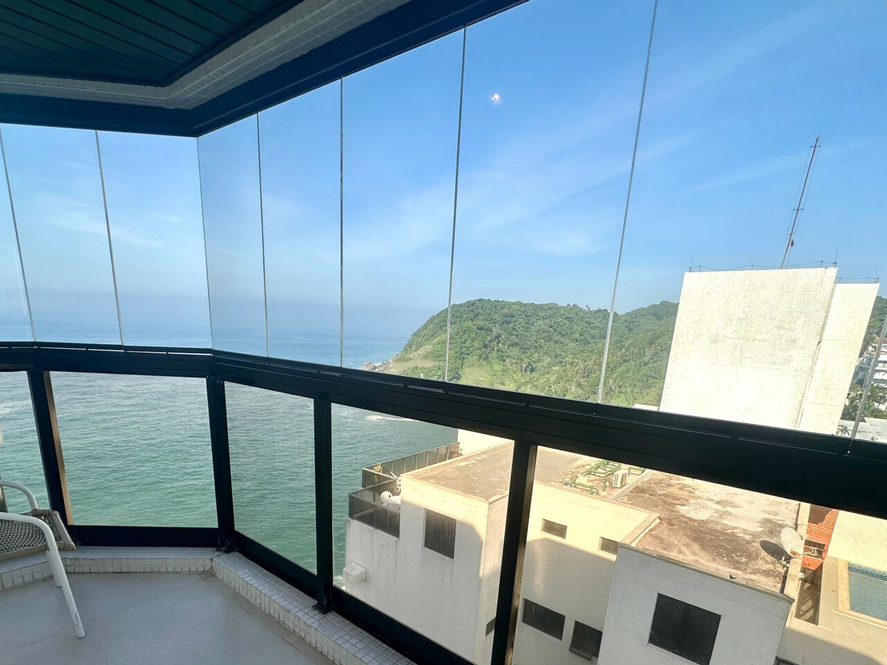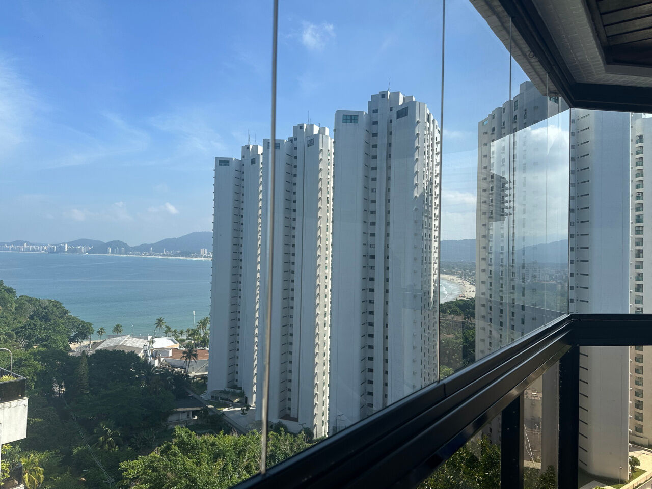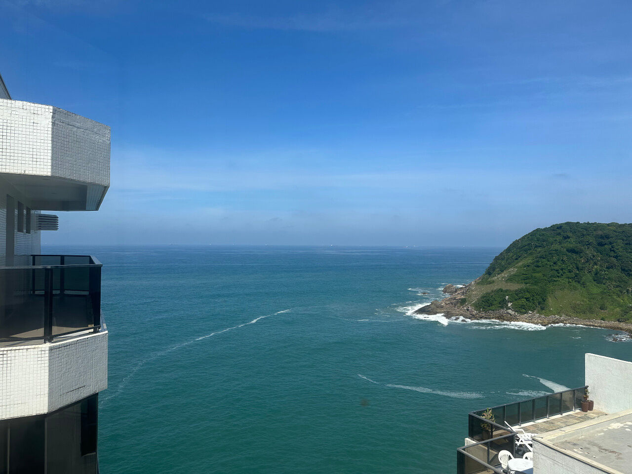 Cobertura duplex reformada no Condomínio Costão das Tartarugas na Praia da Enseada em Guarujá, vista para o mar, com 4 suítes todas com varanda, sala para 3 ambientes com ampla sacada, lavabo, cozinha planejada, área de serviço e dependência de empregada. Lazer da cobertura com sauna, piscina e churrasqueira.