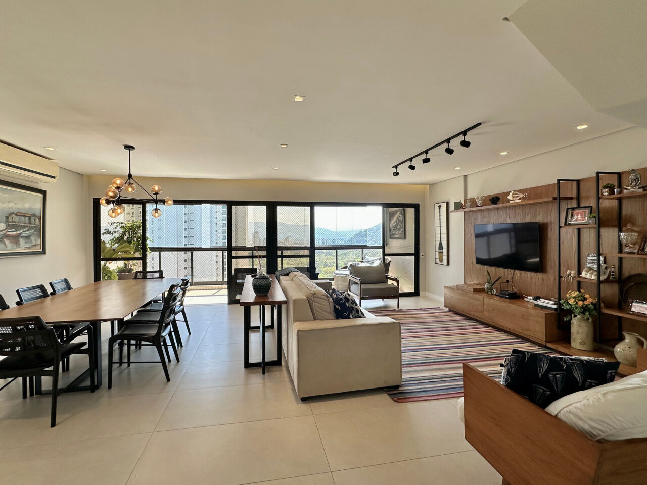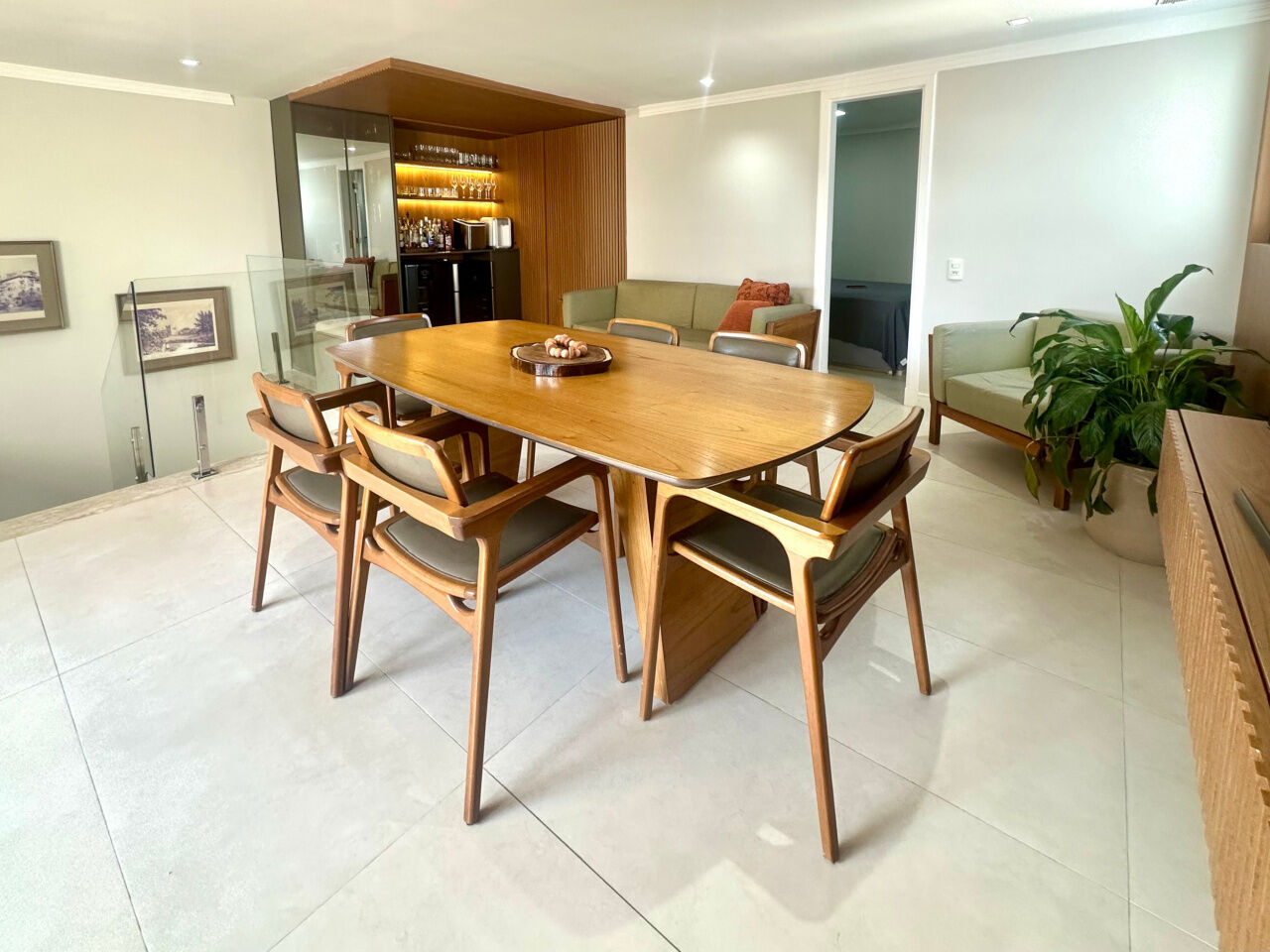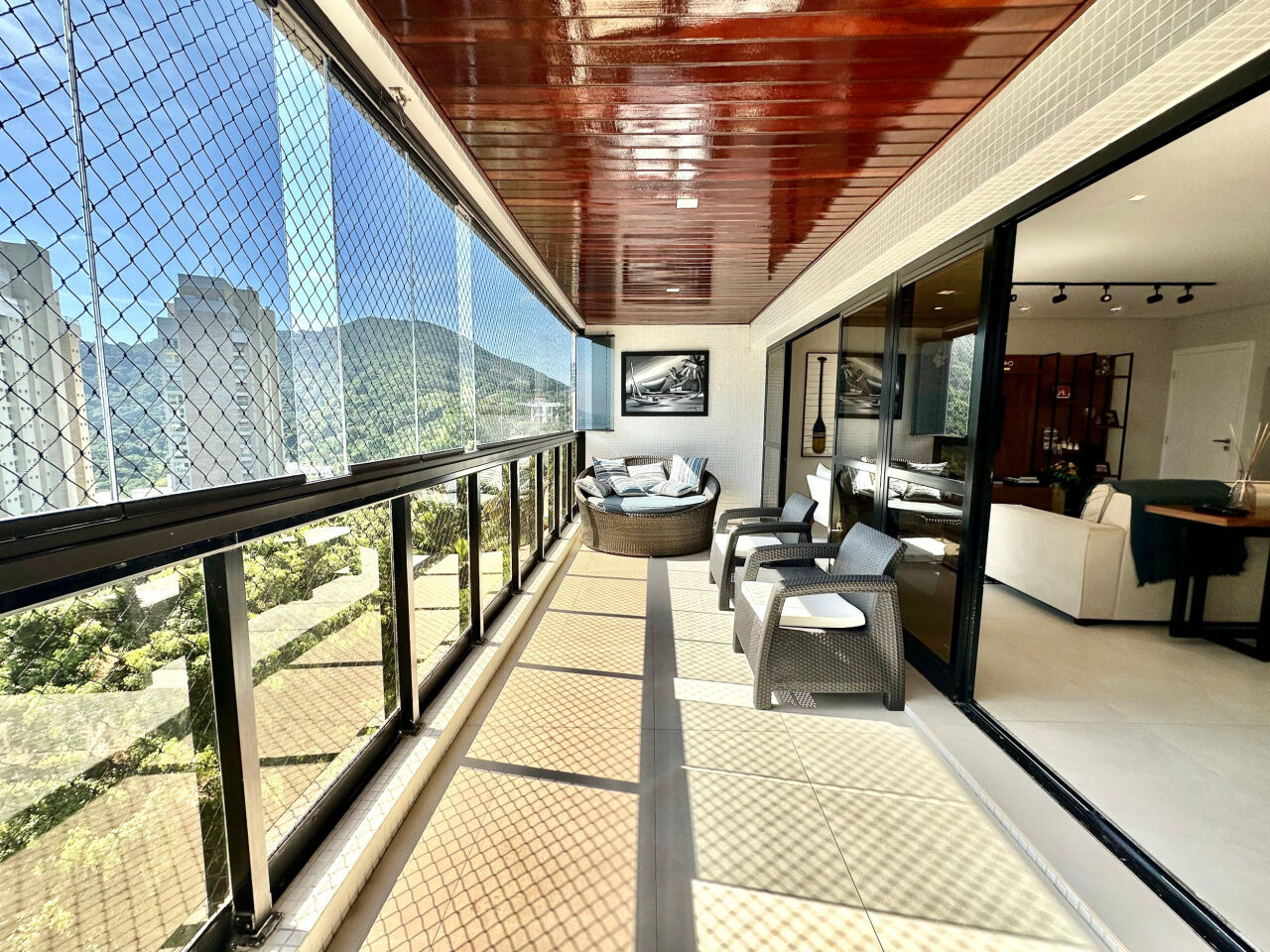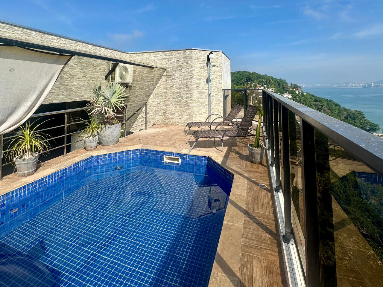 Cobertura duplex reformada no Condomínio Costão das Tartarugas na Praia da Enseada em Guarujá, vista para o mar, com 4 suítes todas com varanda, sala para 3 ambientes com ampla sacada, lavabo, cozinha planejada, área de serviço e dependência de empregada. Lazer da cobertura com sauna, piscina e churrasqueira.