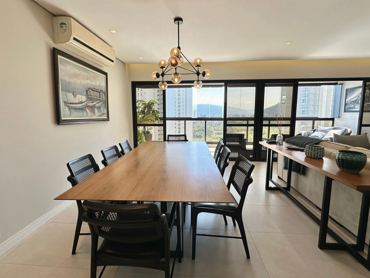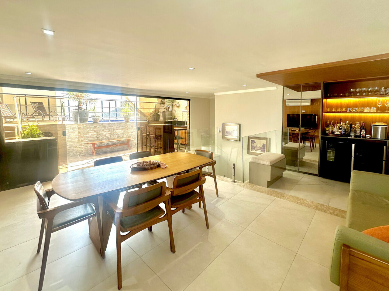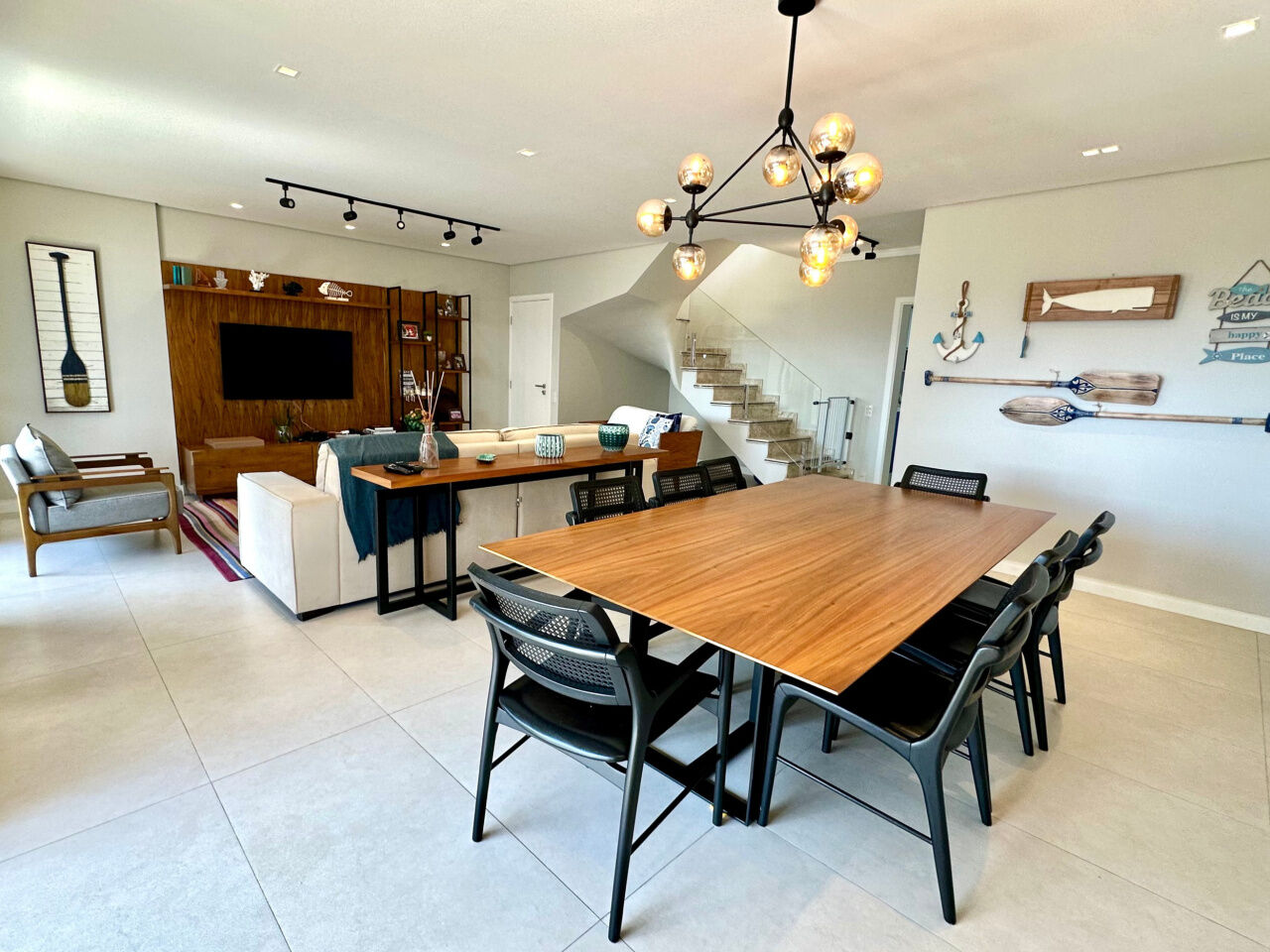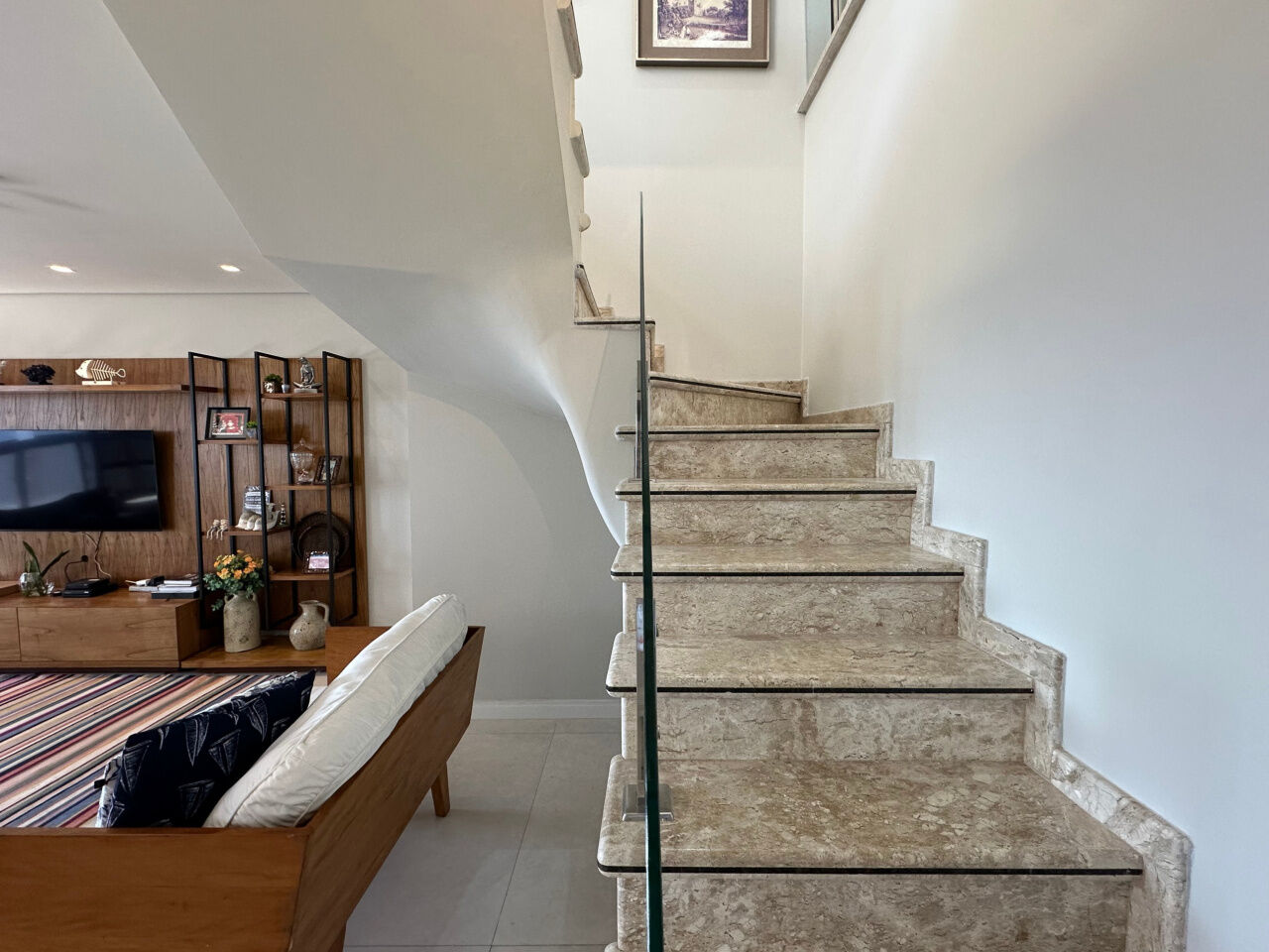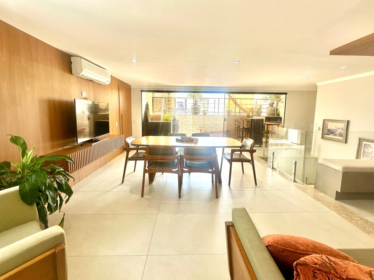 Cobertura duplex reformada no Condomínio Costão das Tartarugas na Praia da Enseada em Guarujá, vista para o mar, com 4 suítes todas com varanda, sala para 3 ambientes com ampla sacada, lavabo, cozinha planejada, área de serviço e dependência de empregada. Lazer da cobertura com sauna, piscina e churrasqueira.