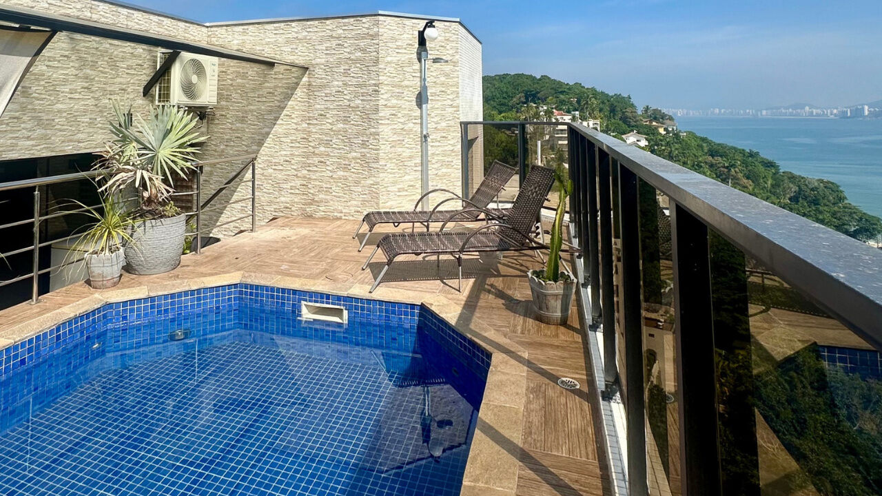 Cobertura duplex reformada no Condomínio Costão das Tartarugas na Praia da Enseada em Guarujá, vista para o mar, com 4 suítes todas com varanda, sala para 3 ambientes com ampla sacada, lavabo, cozinha planejada, área de serviço e dependência de empregada. Lazer da cobertura com sauna, piscina e churrasqueira.