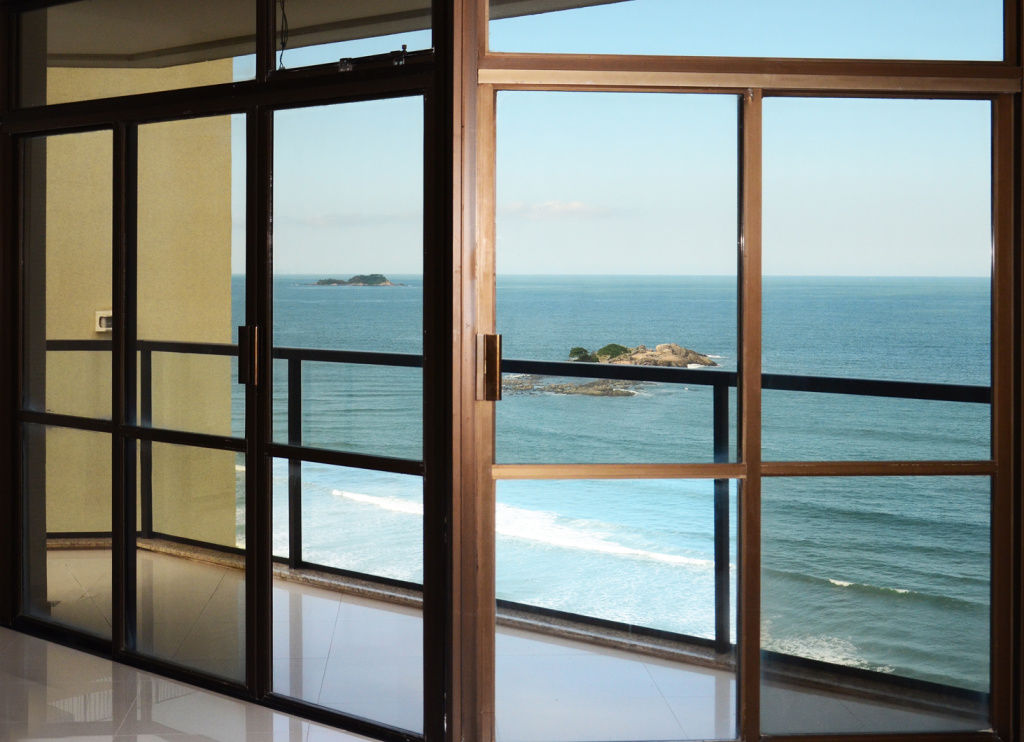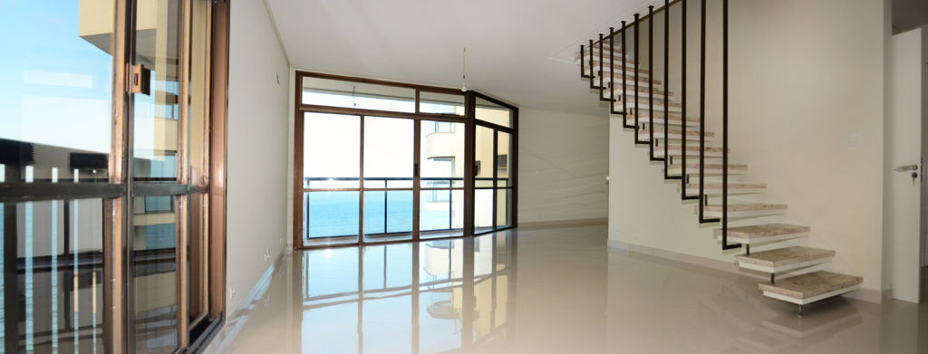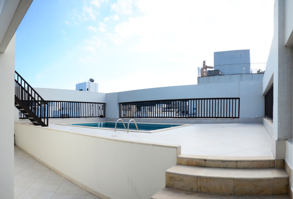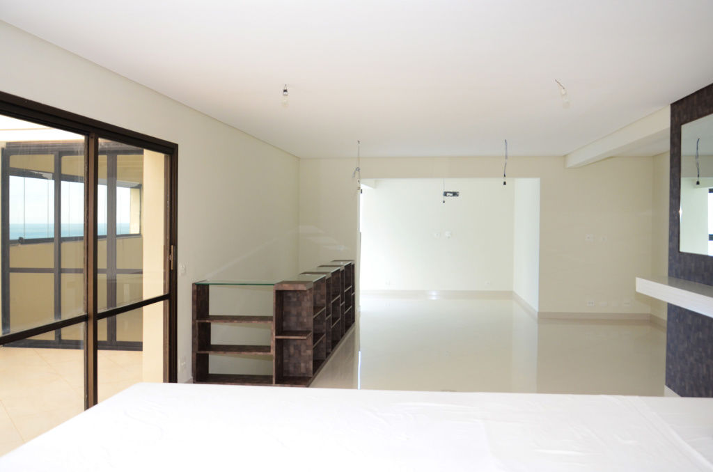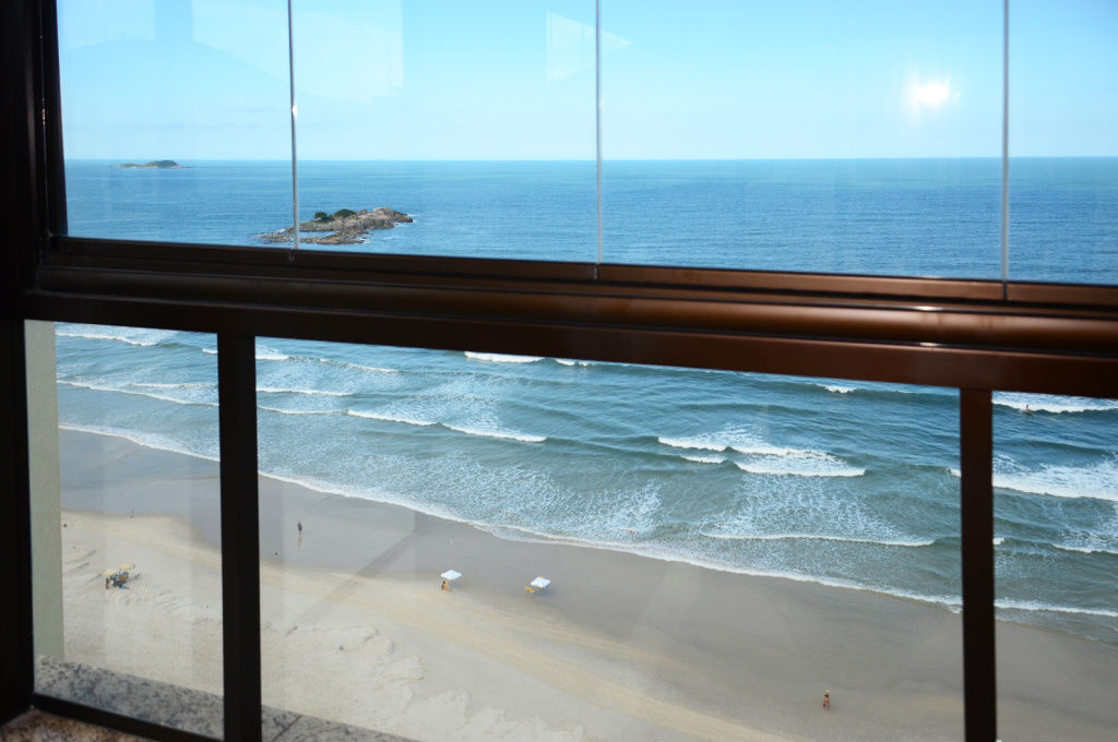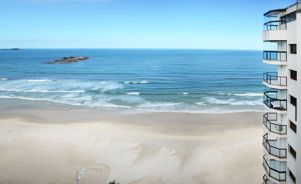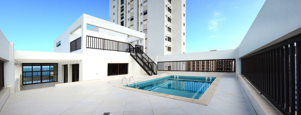 Cobertura duplex na praia das Pitangueiras em Guarujá, vista para o mar, com 04 suítes, sala para 02 ambientes com sacada, copa/cozinha, lavanderia e dependência de empregada. Lazer na parte superior com piscina e ampla sala.